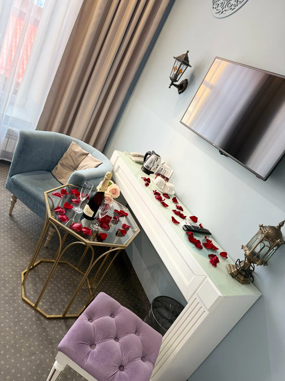 Здание отеля разместилось на главной пешеходной улице города — улице Баумана. Гостей ожидают 17 комфортабельных номеров категории Стандарт, Полулюкс и Улучшенный Стандарт. Интерьер выдержан в сине-голубых и темно-розовых оттенках с добавлением национальных мотивов и орнаментов. В каждом номере есть электрочайник, телевизор, кондиционер, ванная комната с душем и косметическими принадлежностями.