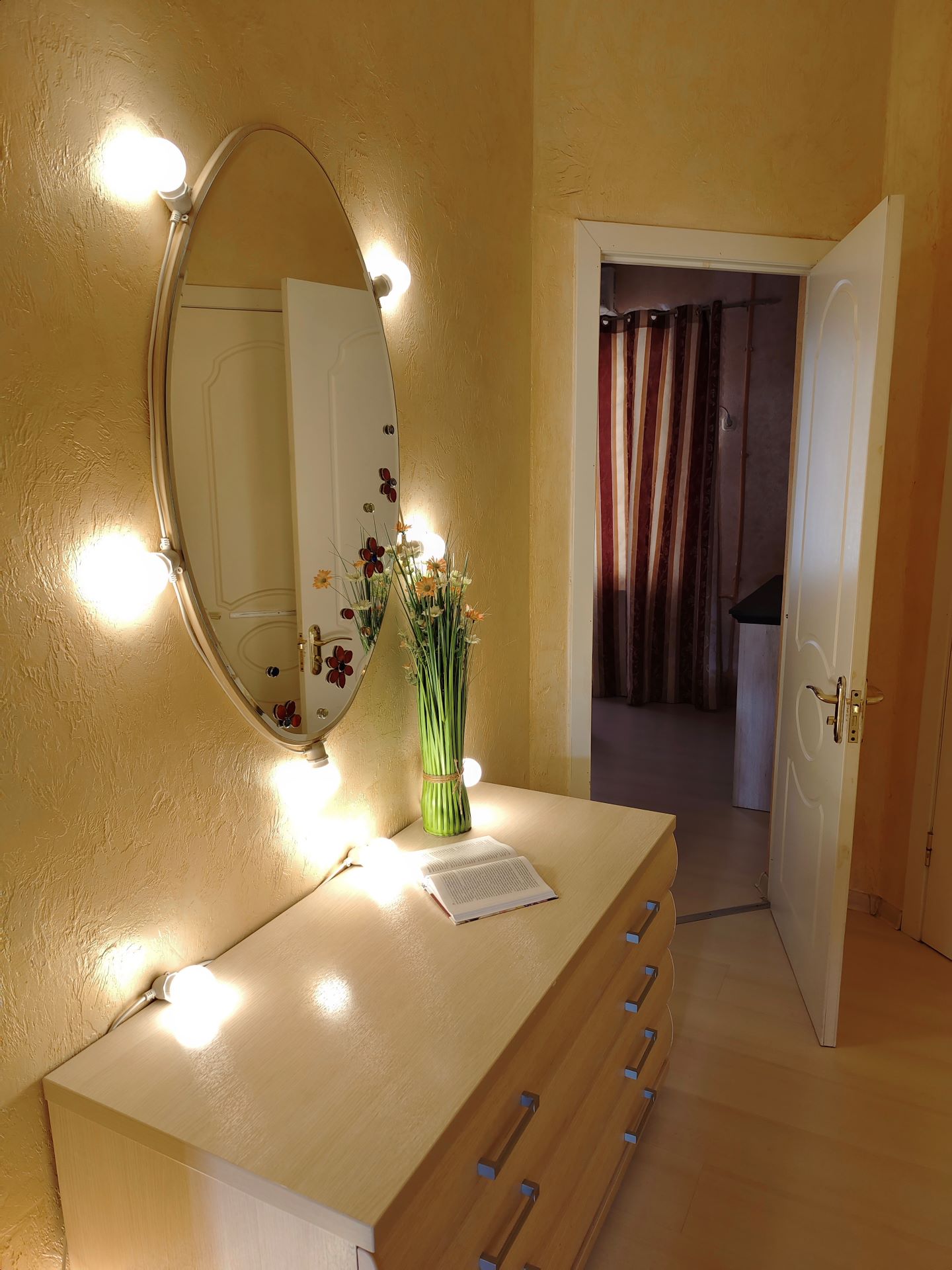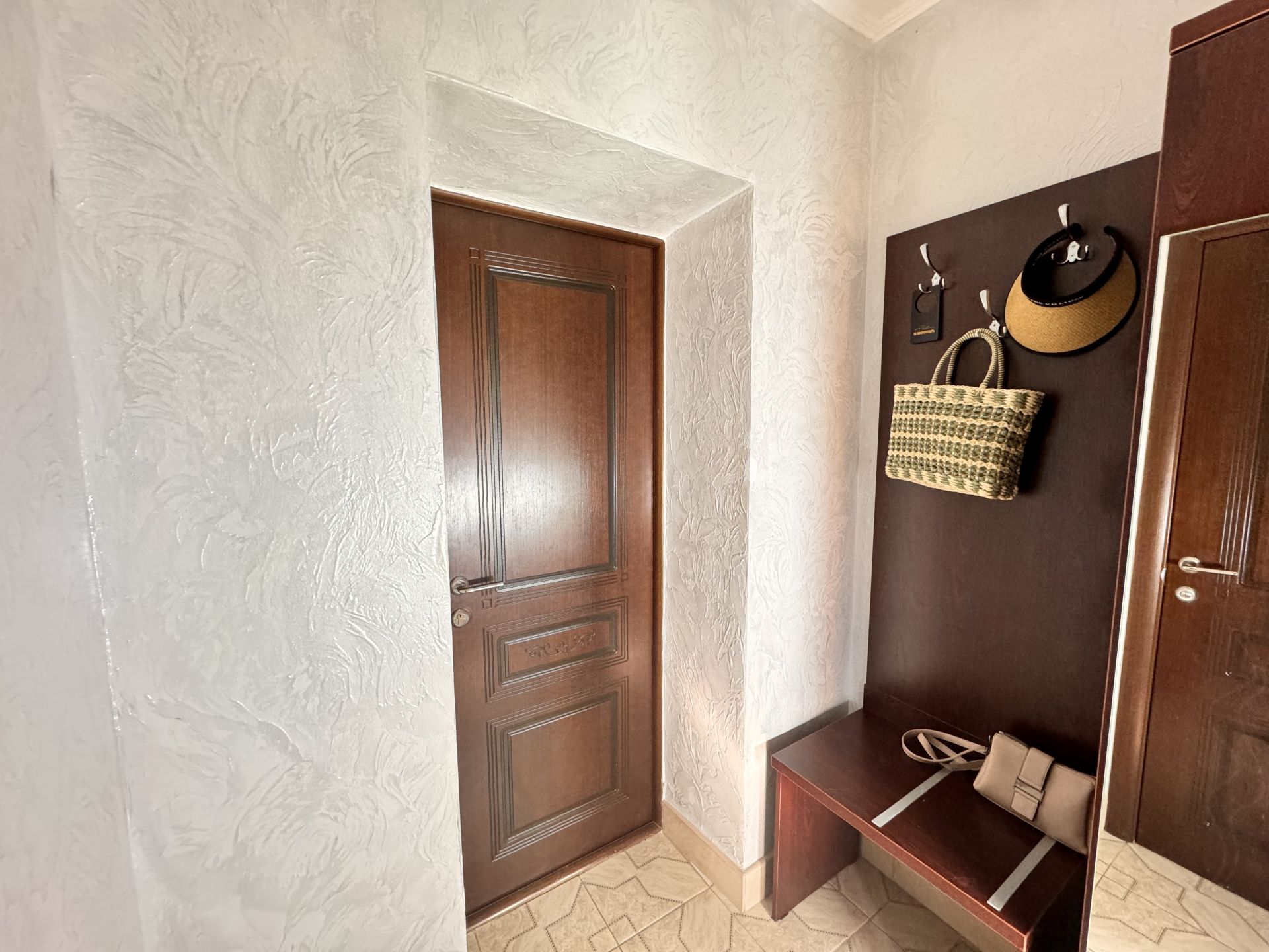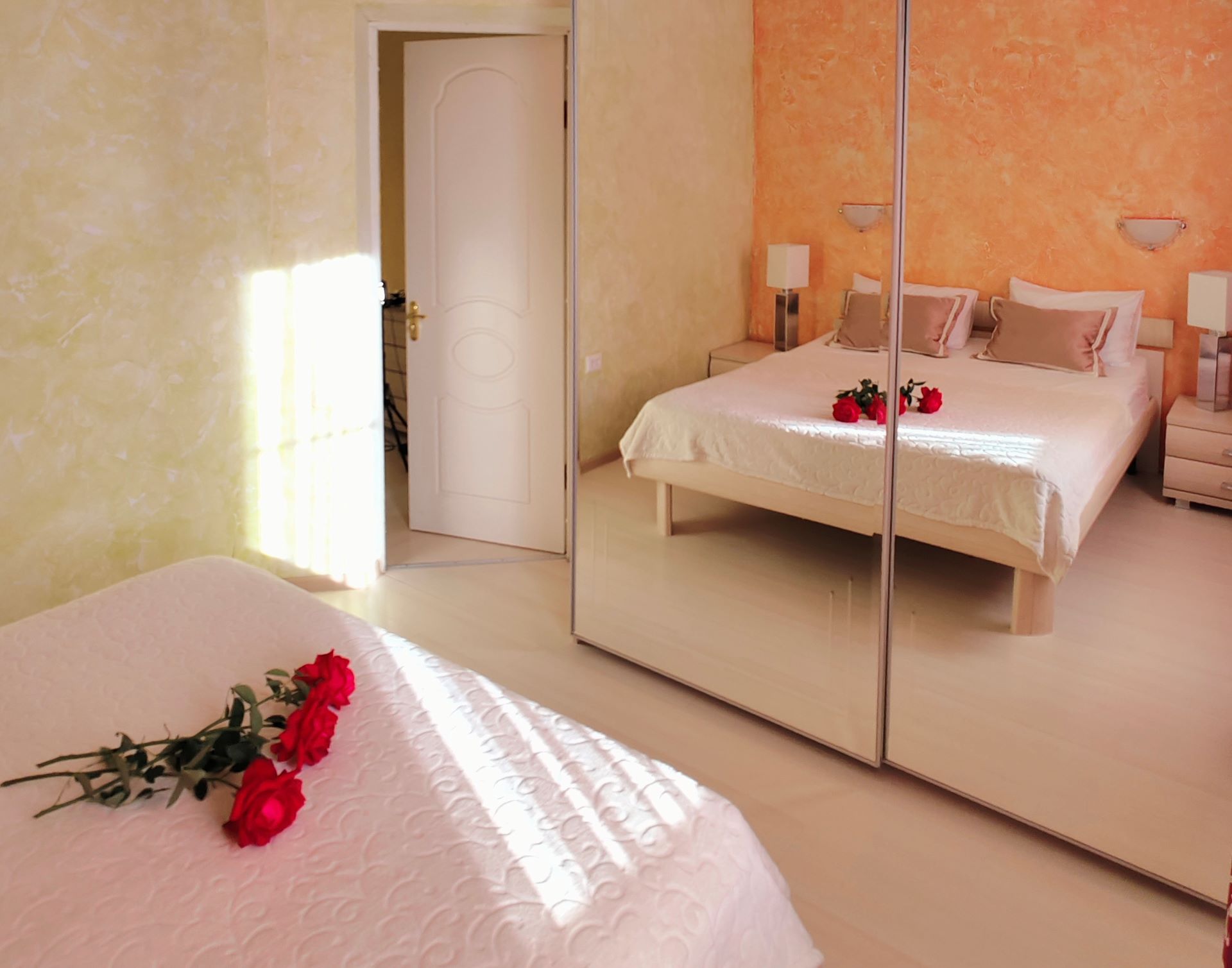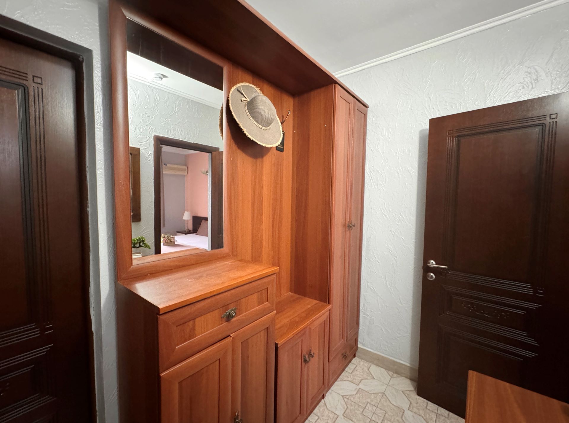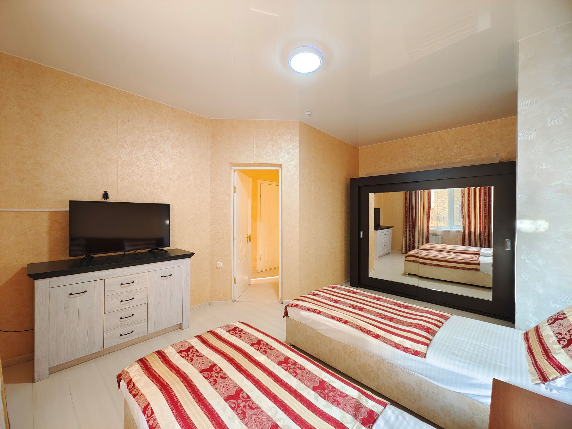 вешалка: ; зеркало: ; кровати односпальные /одна двуспальная кровать: и одна односпальная кровать; прикроватные тумбочки: ; стол: ; стулья: ; шкаф: ;