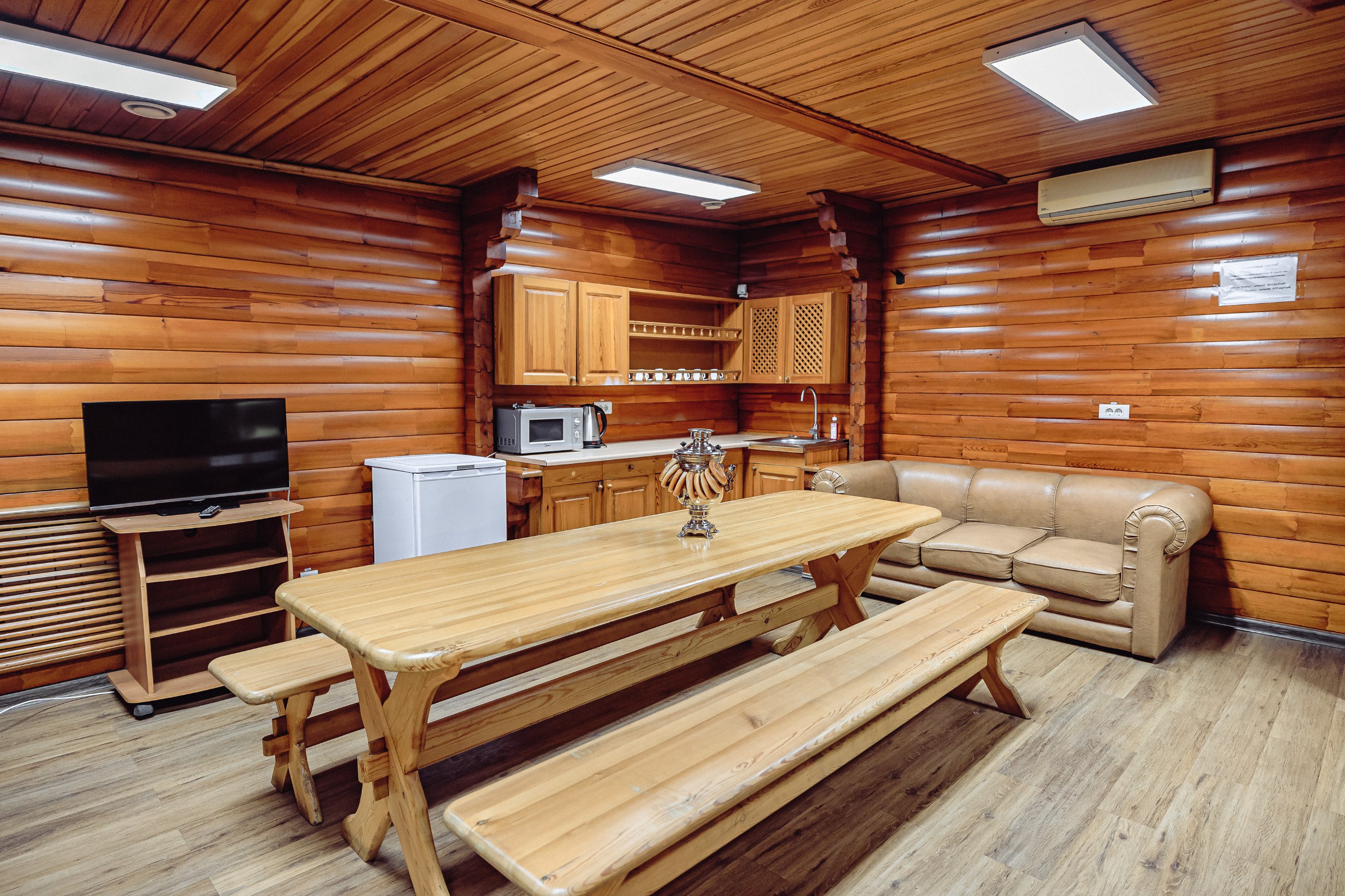 В столовой гости могу заказать комплексное питание, на территории установлены мангалы и беседки. В эко-отеле есть собственный банный комплекс с сауной и крытым бассейном, любители активного образа жизни могут поиграть в волейбол, футбол на спортплощадке или отправиться на рыбалку. Зимой можно покататься на тюбингах. Для детей на территории организована игровая площадка с горками.