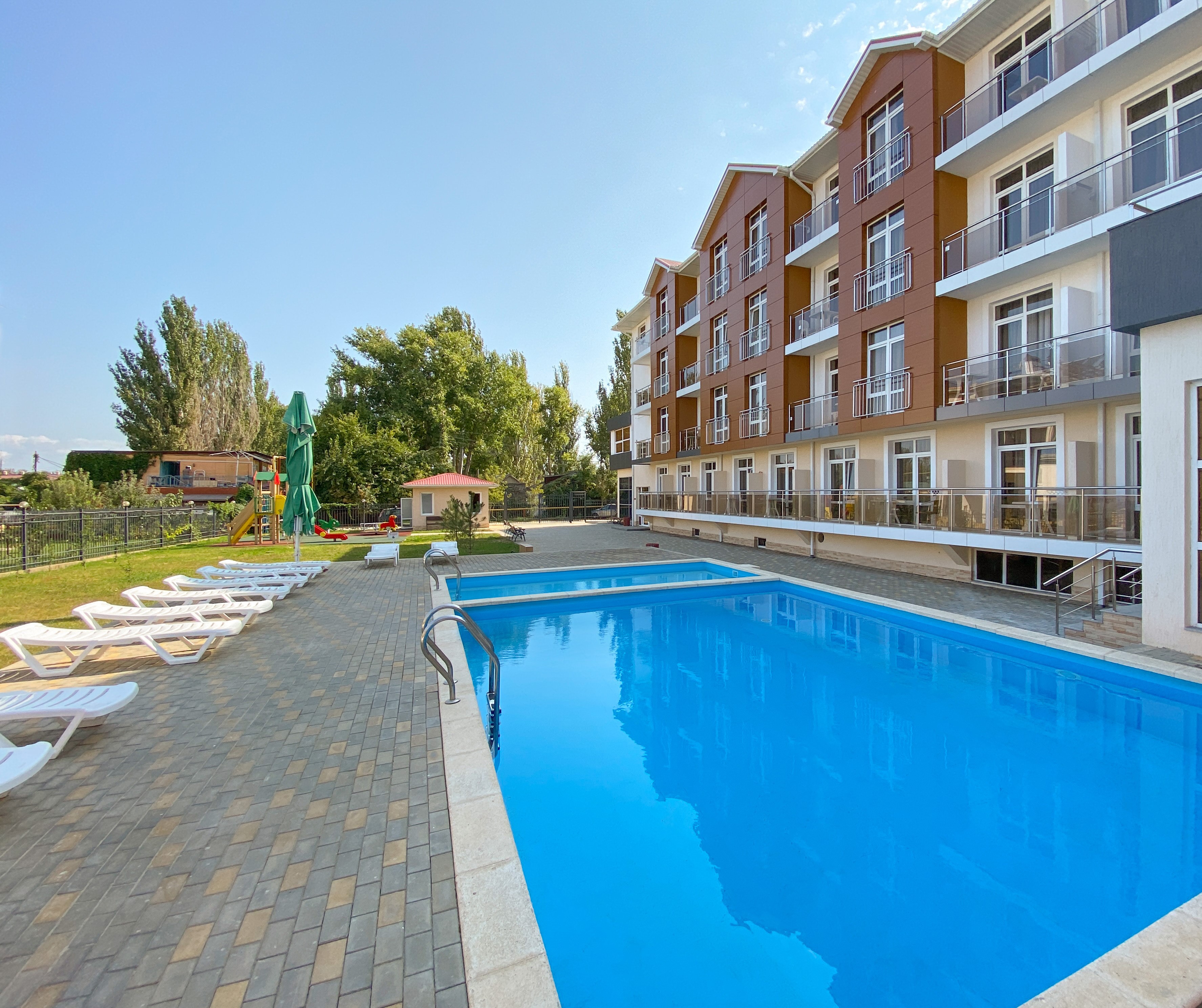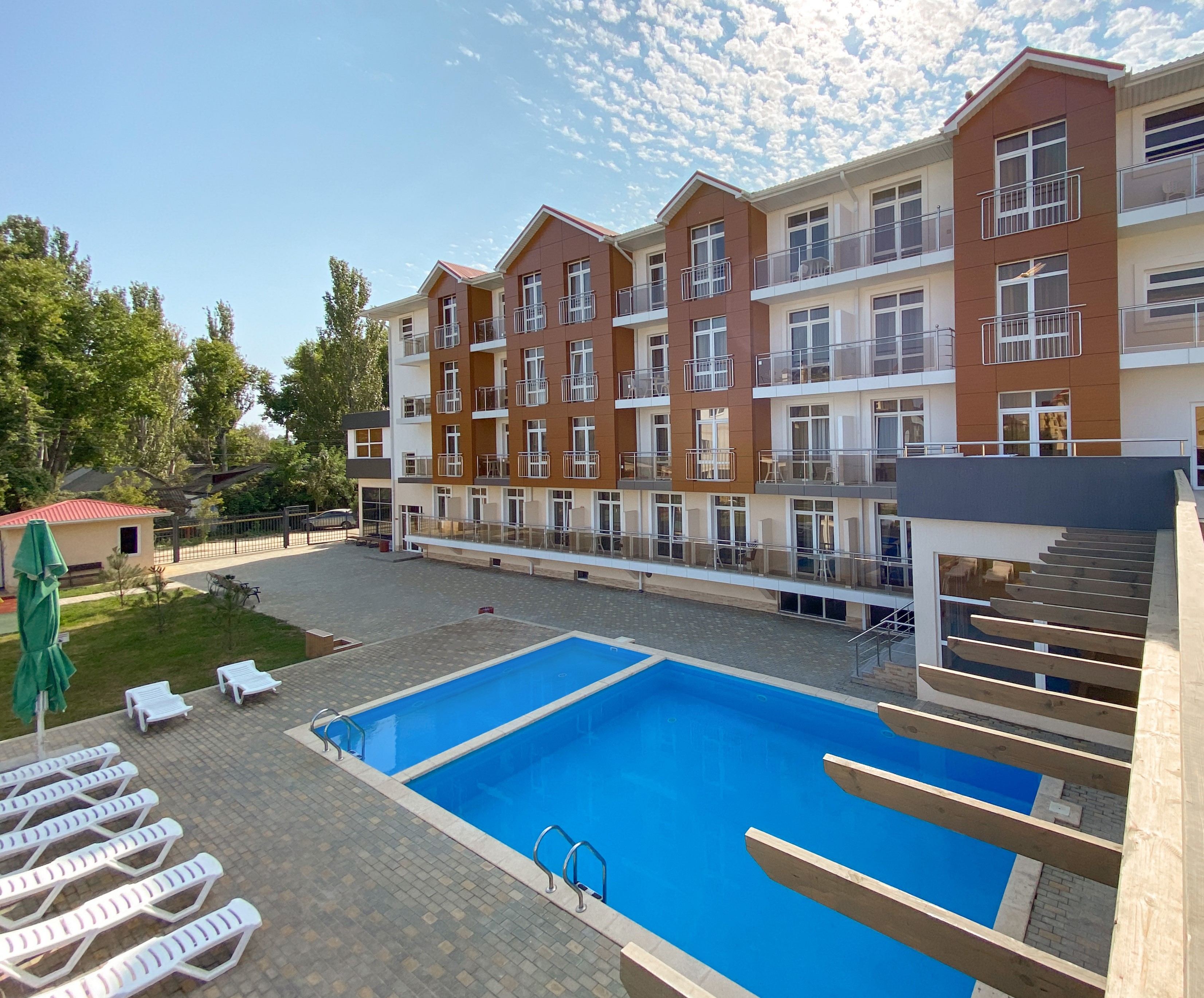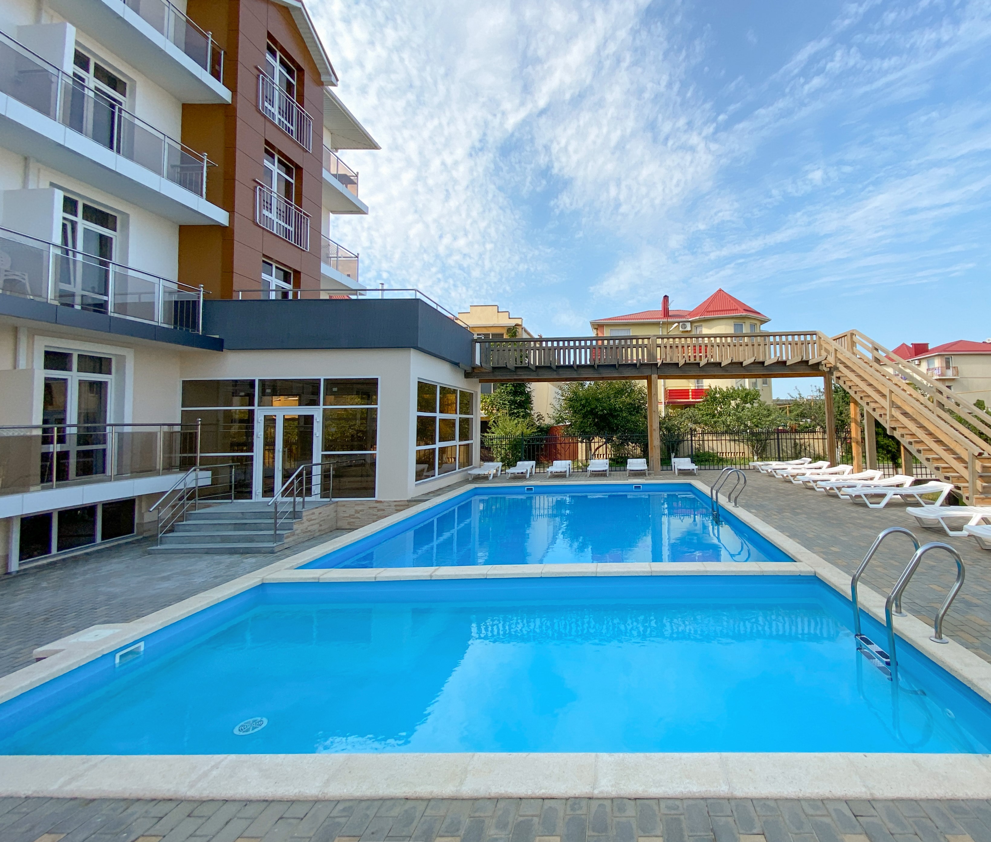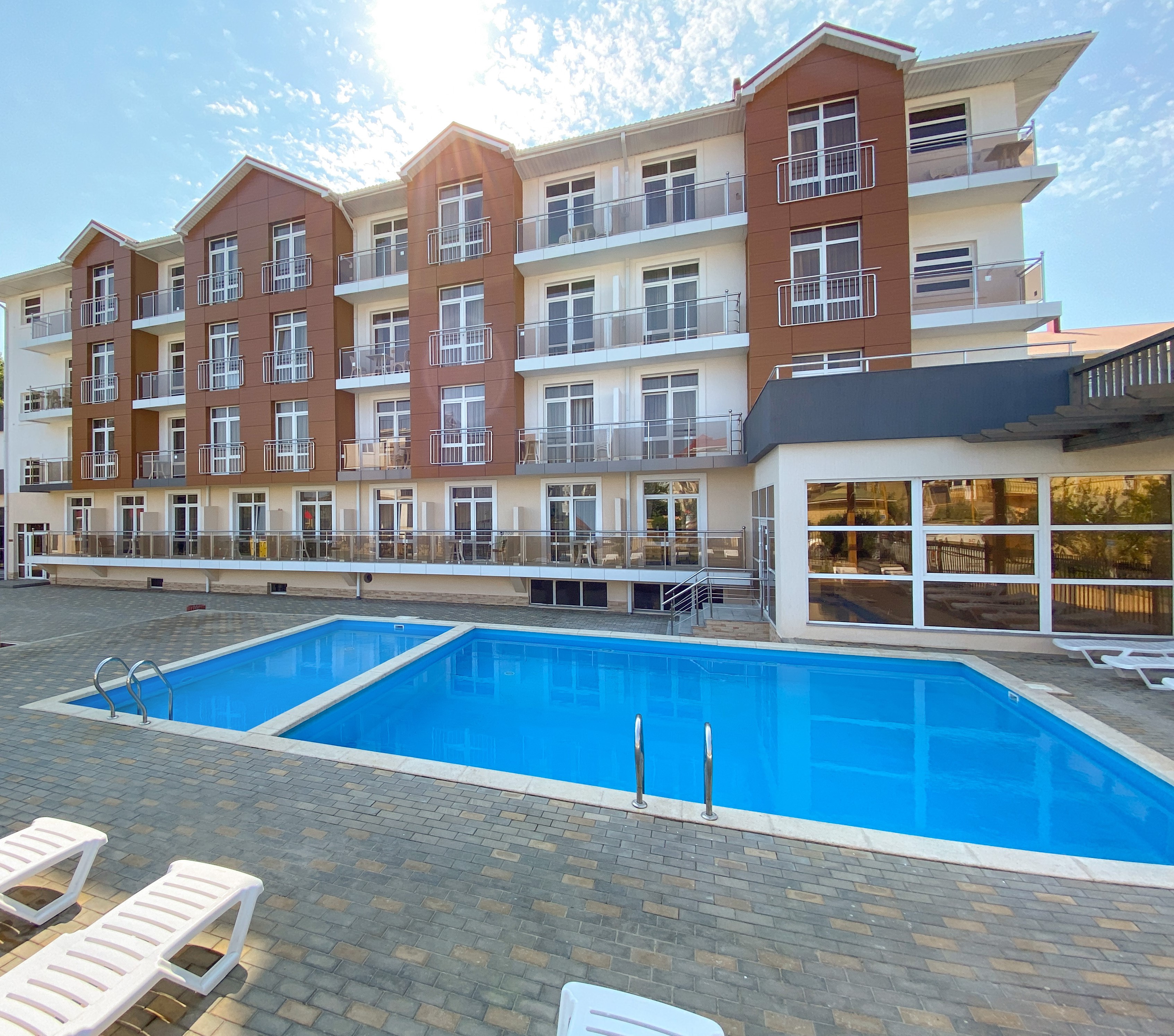 Четырехэтажный корпус отеля занимает закрытую благоустроенную территорию в 400 метрах от морского побережья. Жилой фонд включает в себя 77 двухместных комфортабельных номеров. Каждый номер оформлен в приятной светлой цветовой гамме и оснащен всем необходимым — санузлом с душем, кондиционером, плазменным телевизором и другой бытовой техникой.