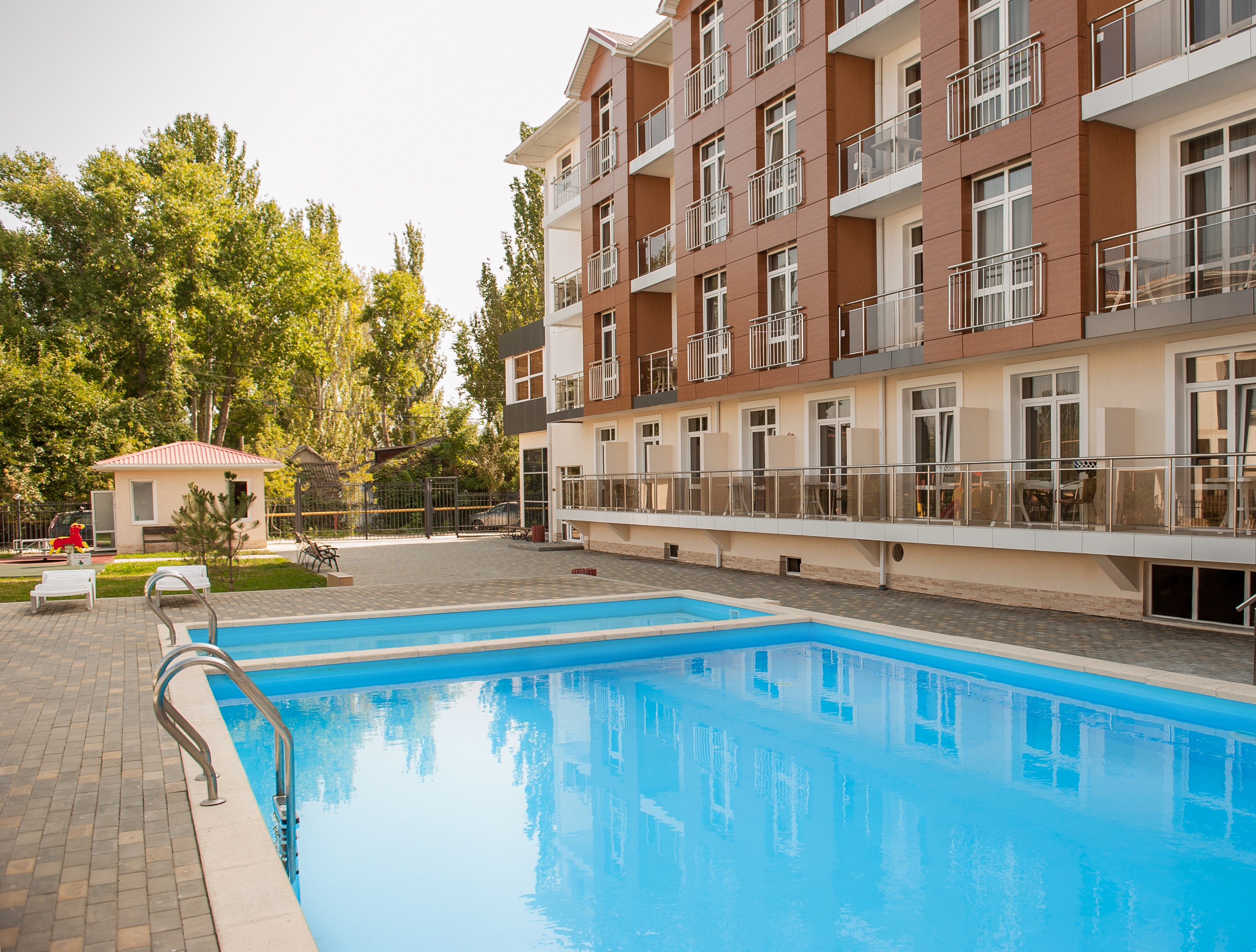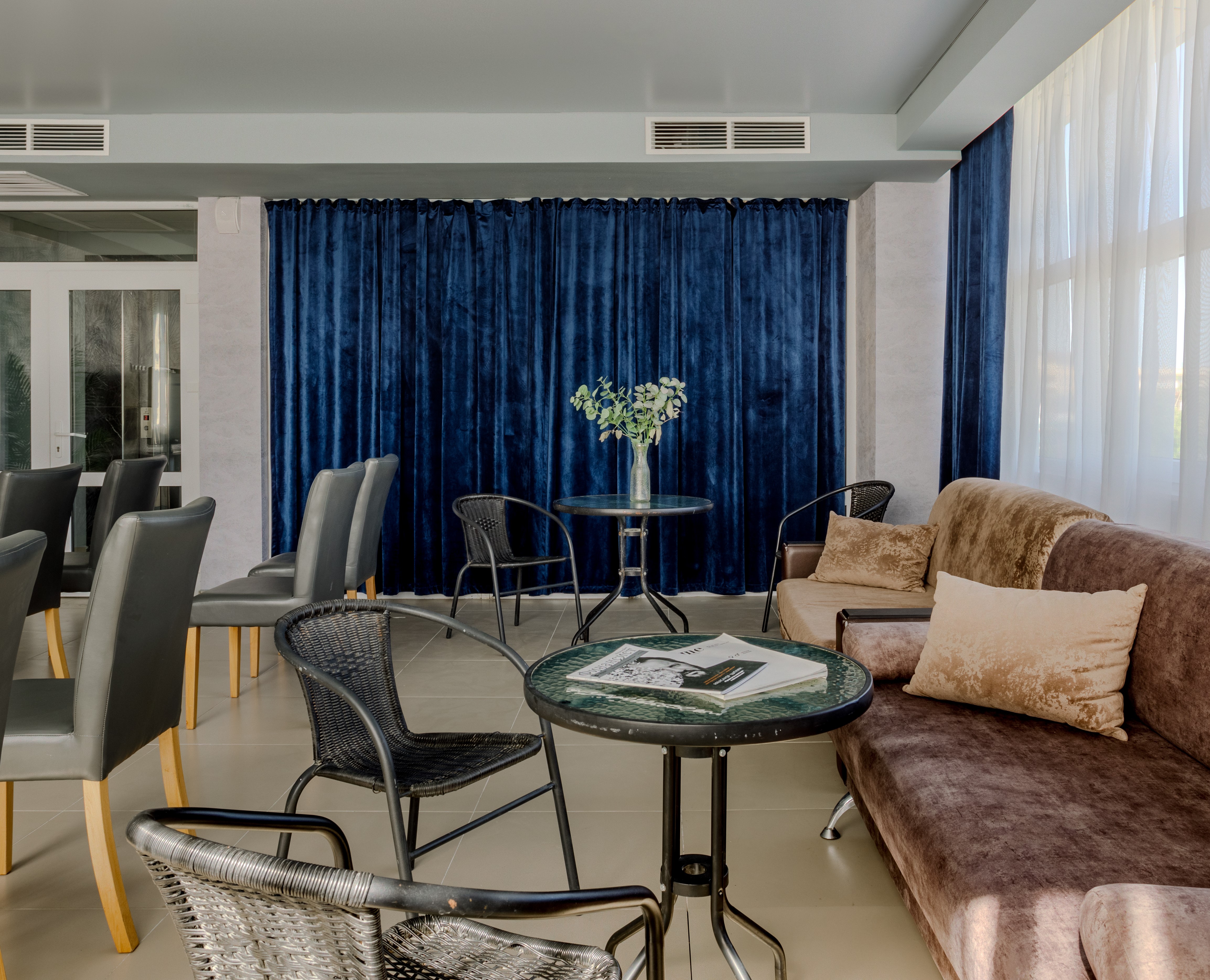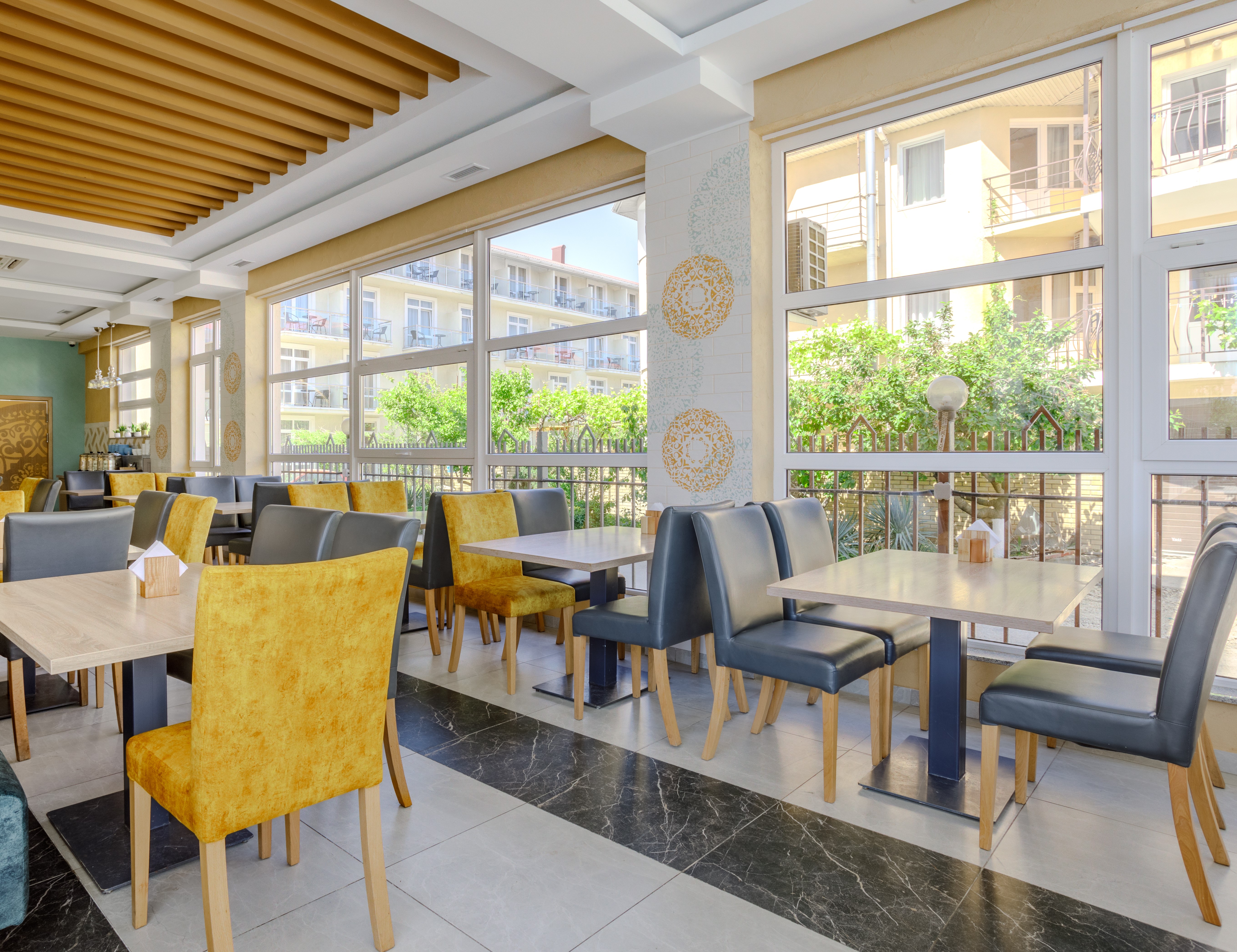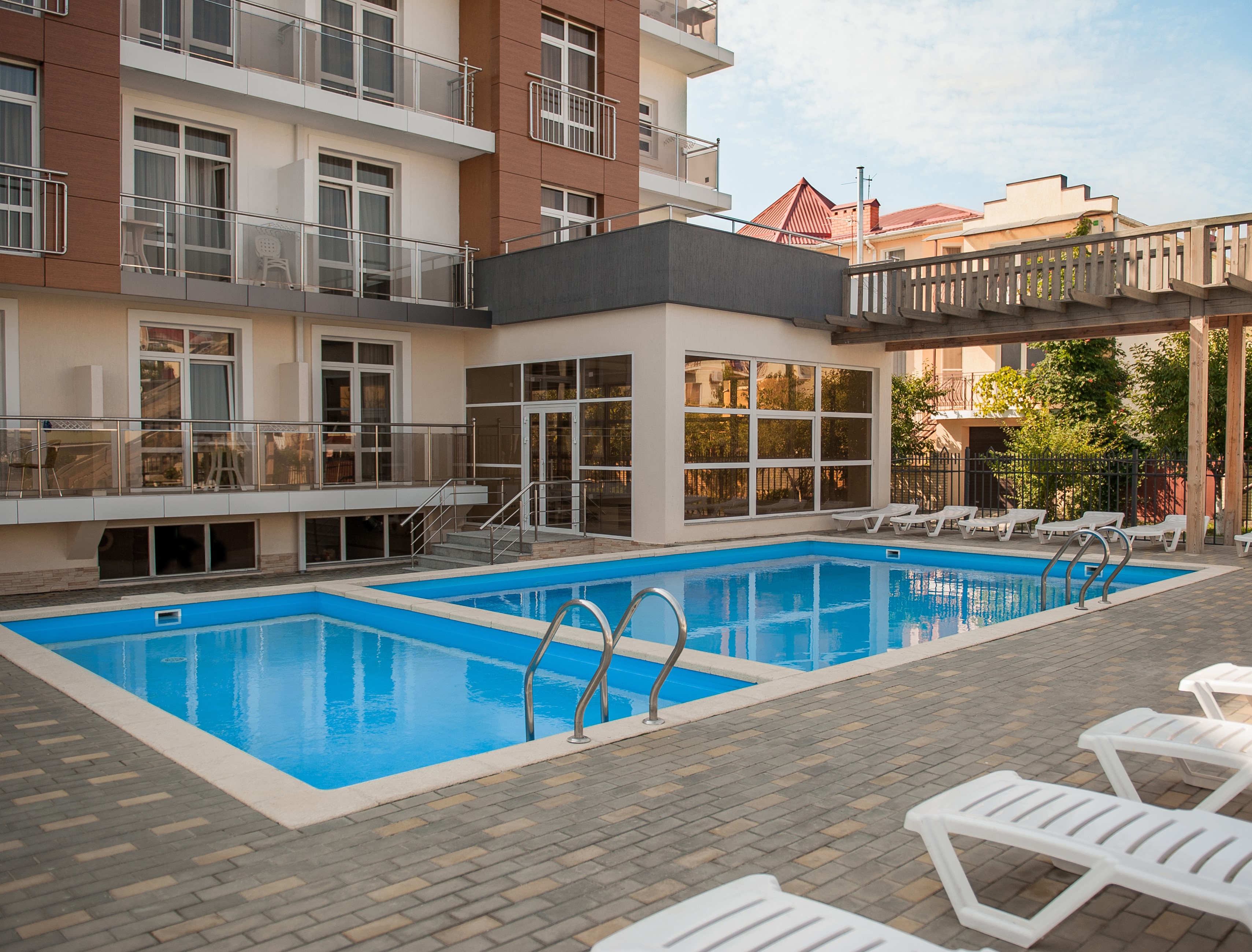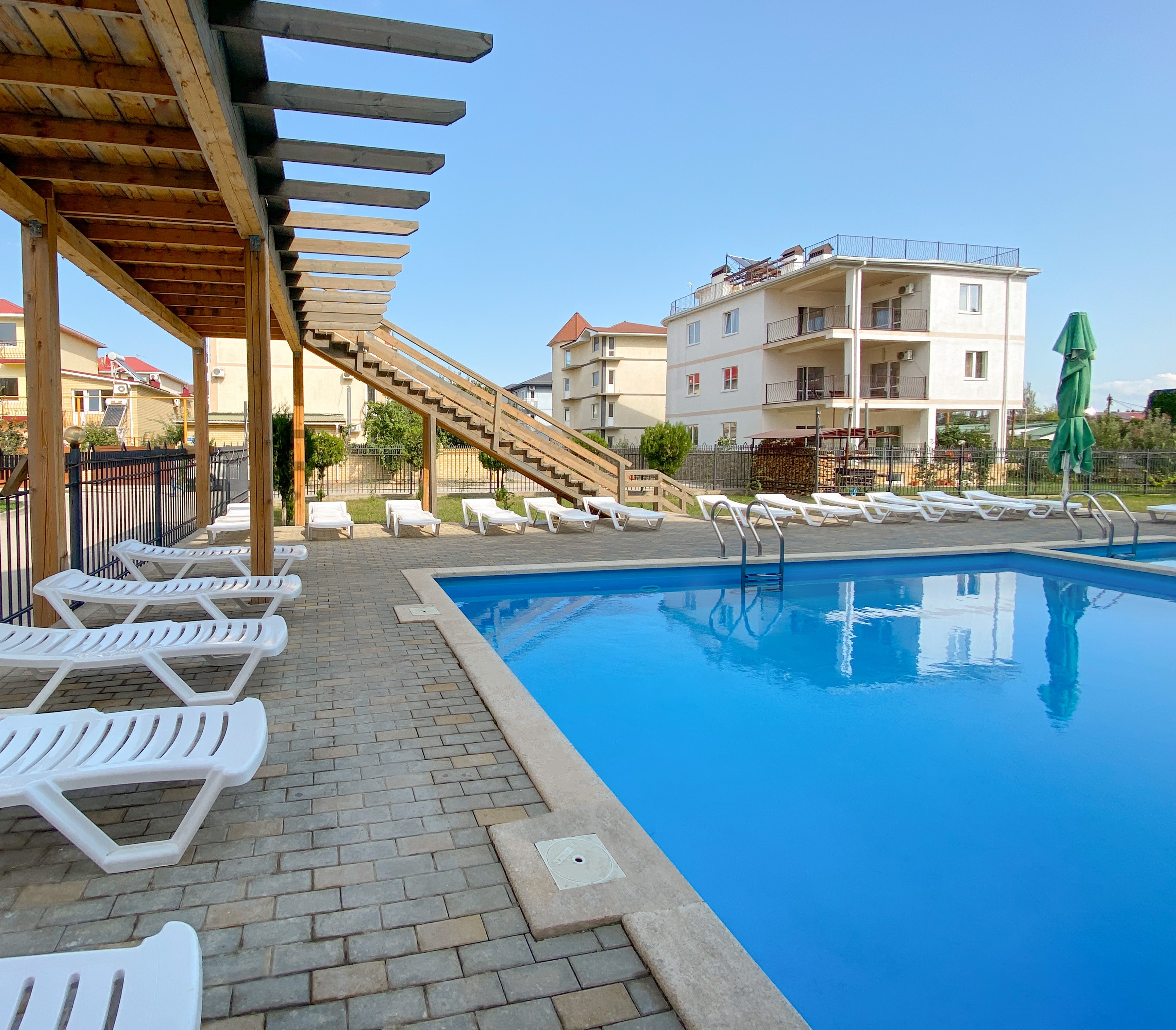 Четырехэтажный корпус отеля занимает закрытую благоустроенную территорию в 400 метрах от морского побережья. Жилой фонд включает в себя 77 двухместных комфортабельных номеров. Каждый номер оформлен в приятной светлой цветовой гамме и оснащен всем необходимым — санузлом с душем, кондиционером, плазменным телевизором и другой бытовой техникой.