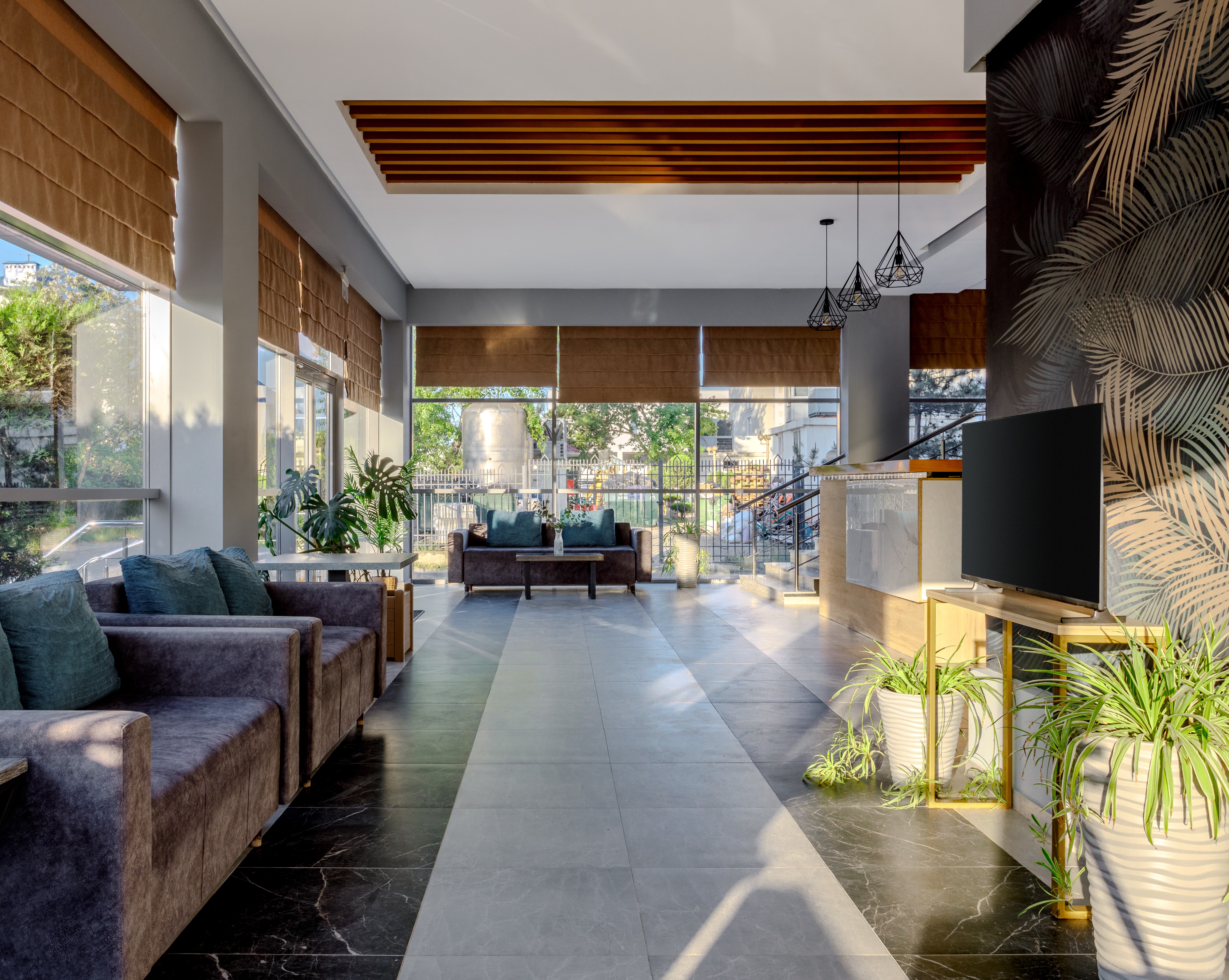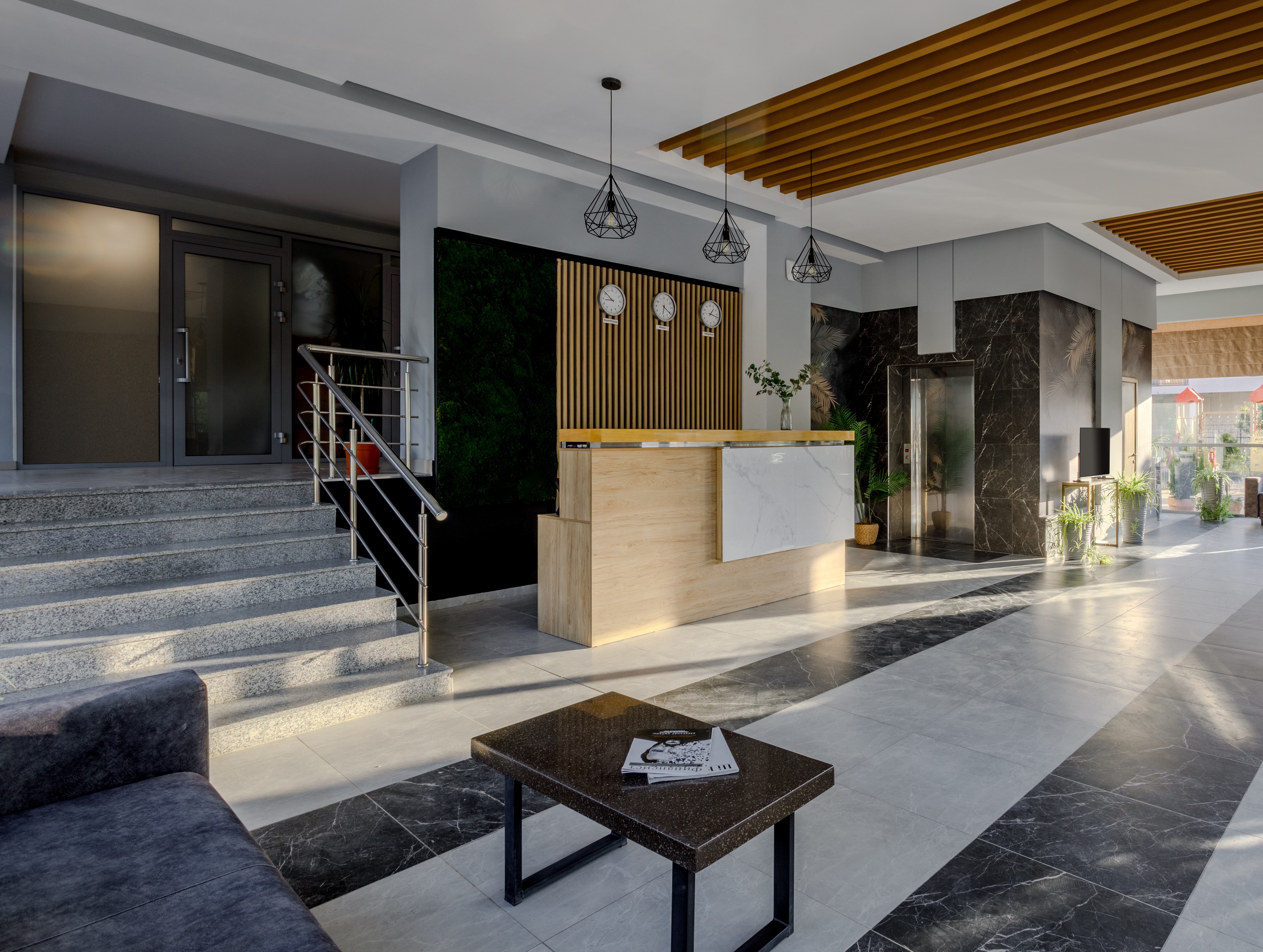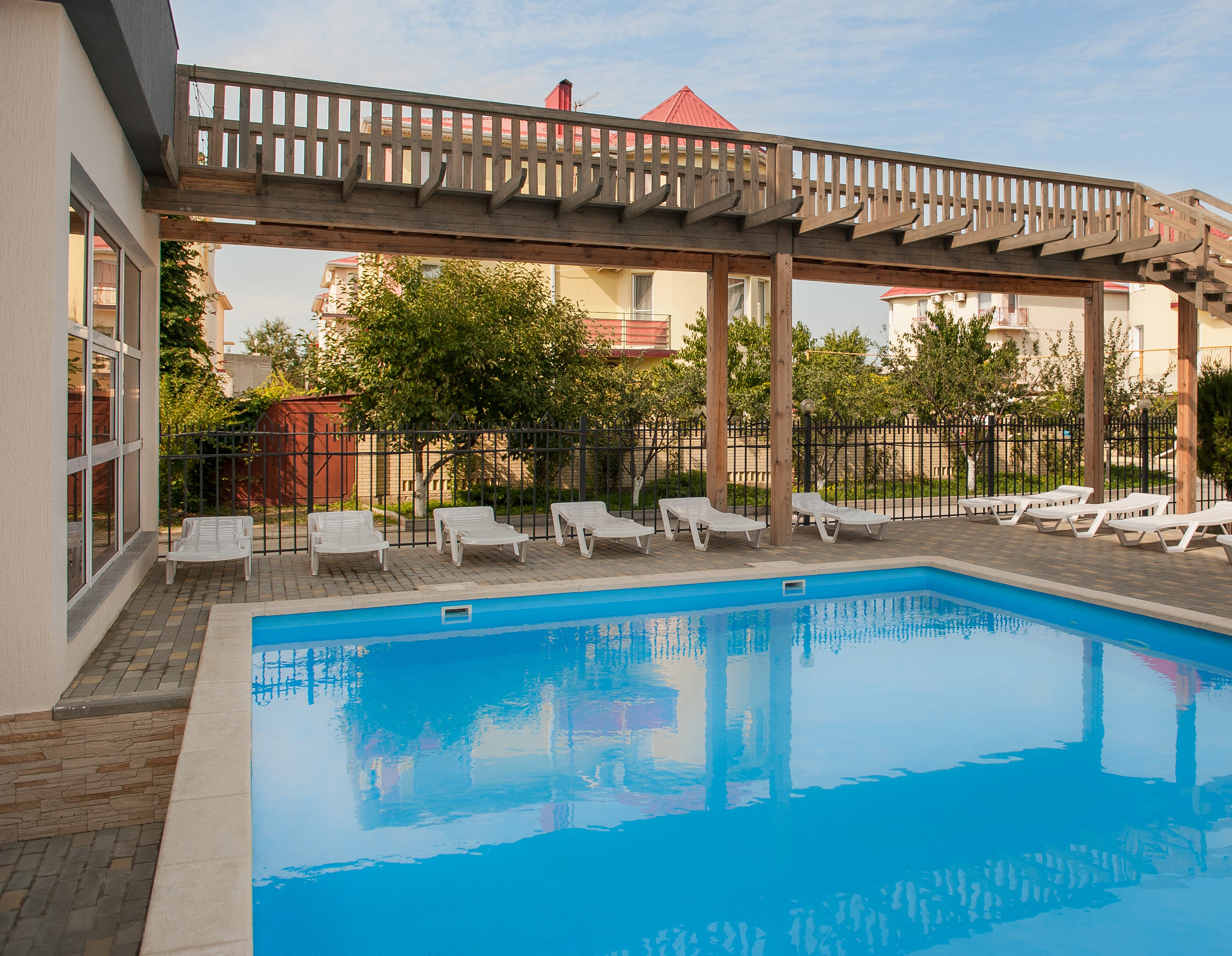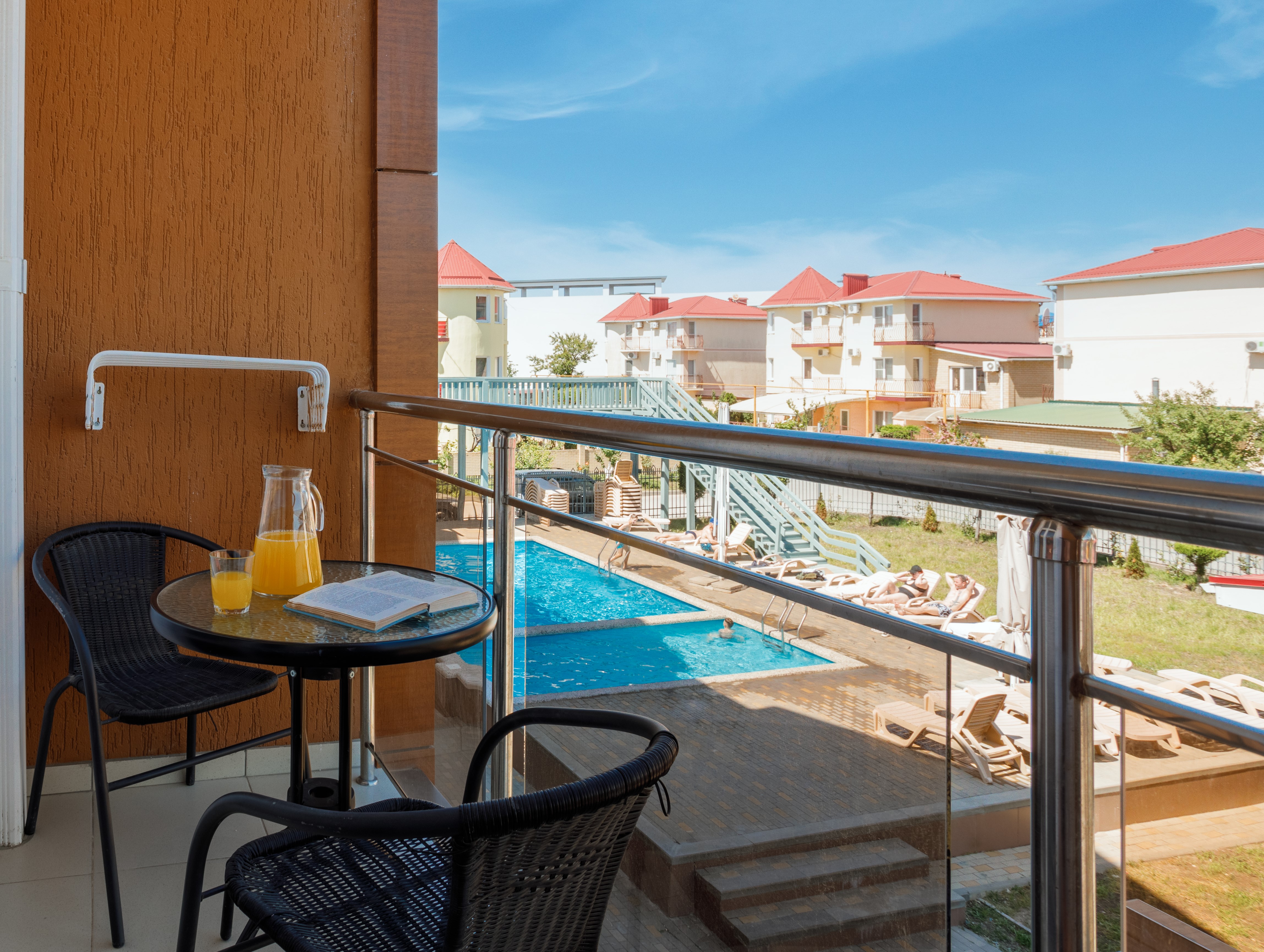 Четырехэтажный корпус отеля занимает закрытую благоустроенную территорию в 400 метрах от морского побережья. Жилой фонд включает в себя 77 двухместных комфортабельных номеров. Каждый номер оформлен в приятной светлой цветовой гамме и оснащен всем необходимым — санузлом с душем, кондиционером, плазменным телевизором и другой бытовой техникой.