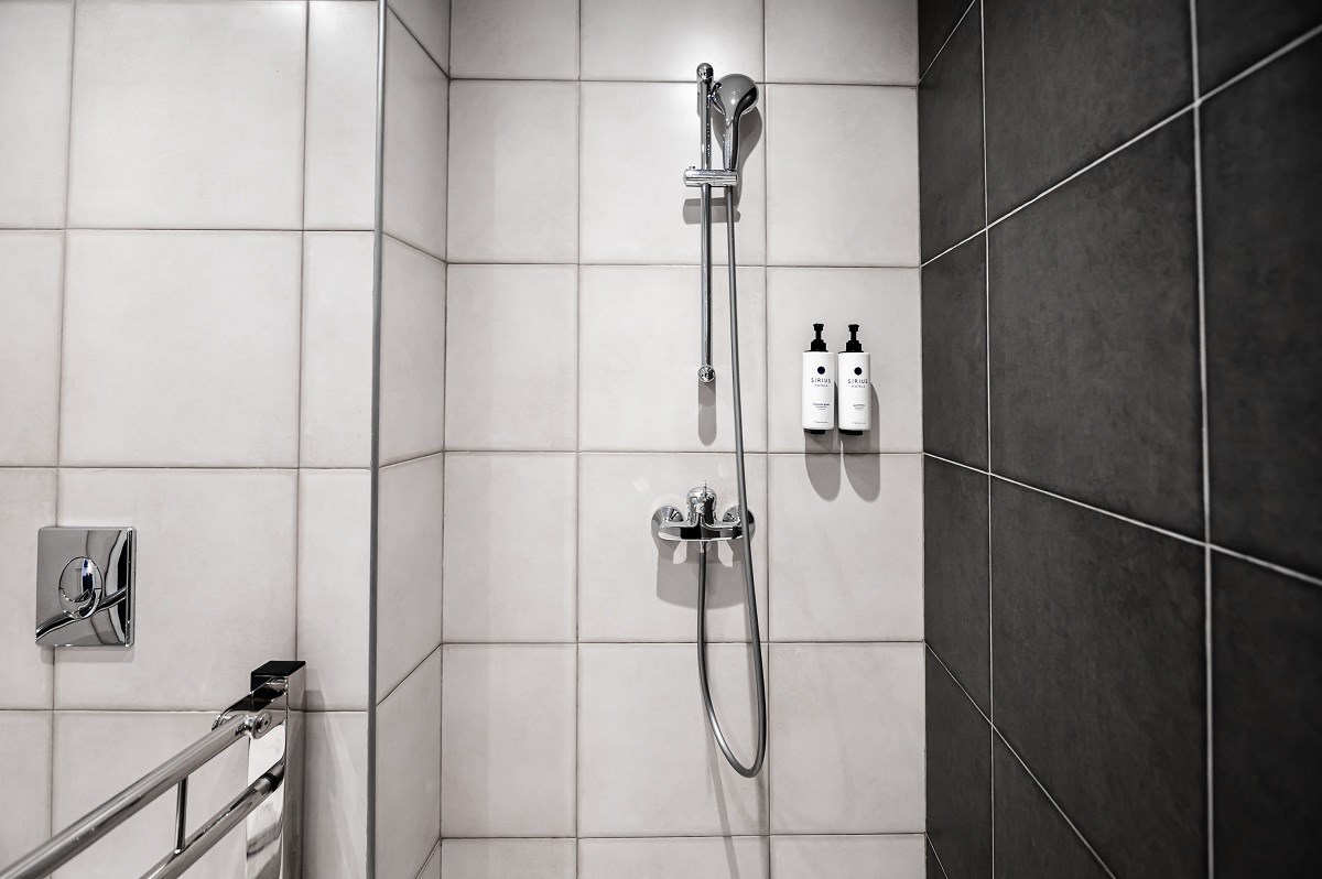 с душем: ; тапочки: ; туалетные принадлежности: ; фен: ;
