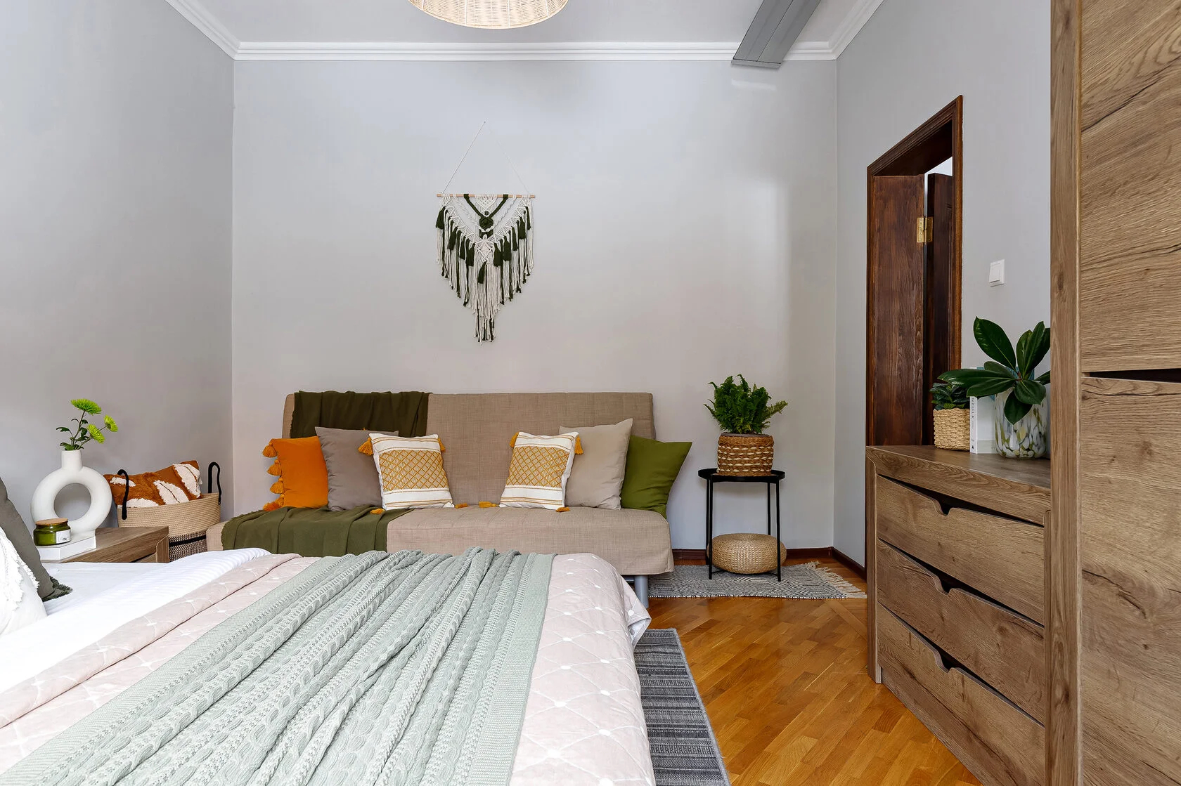 вешалка: ; диван: ; зеркало: ; кровати односпальные: ; кровать двуспальная: ; прикроватные тумбочки: ; стол: ; стулья: ; шкаф: ;