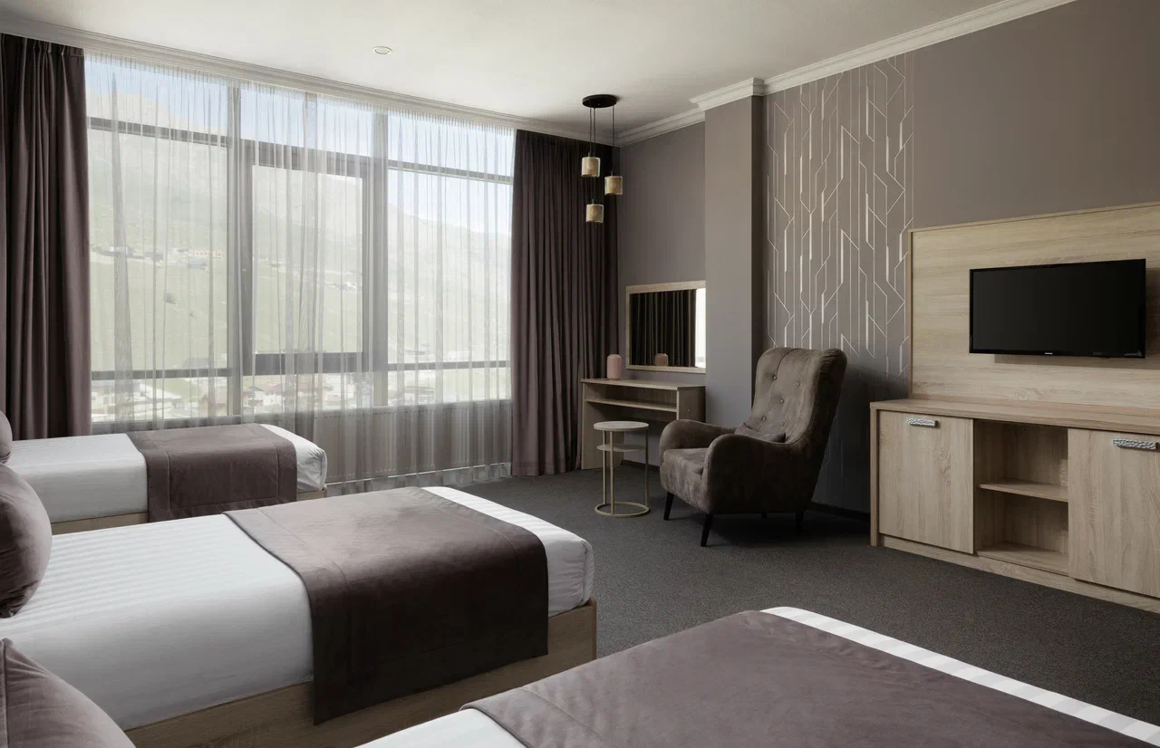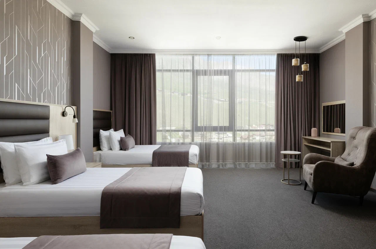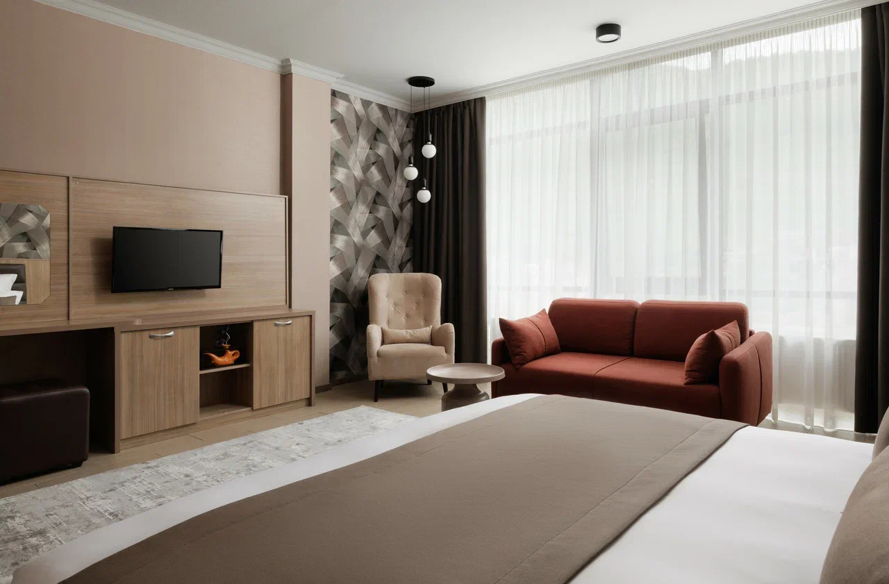 6-этажное современное здание отеля, оснащенное лифтом, разместилось среди горных массивов Большого Кавказского Хребта. Жилой фонд включает в себя 93 номера категории Стандарт и Люкс. В номерах лаконичный стильный интерьер, современная бытовая техника, панорамные окна, санузел с душем и косметических принадлежностей для гостей.