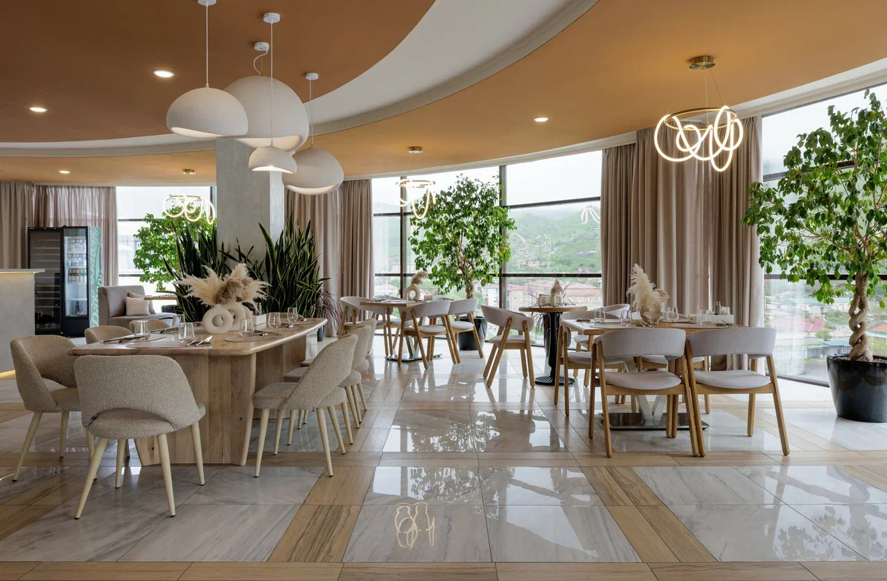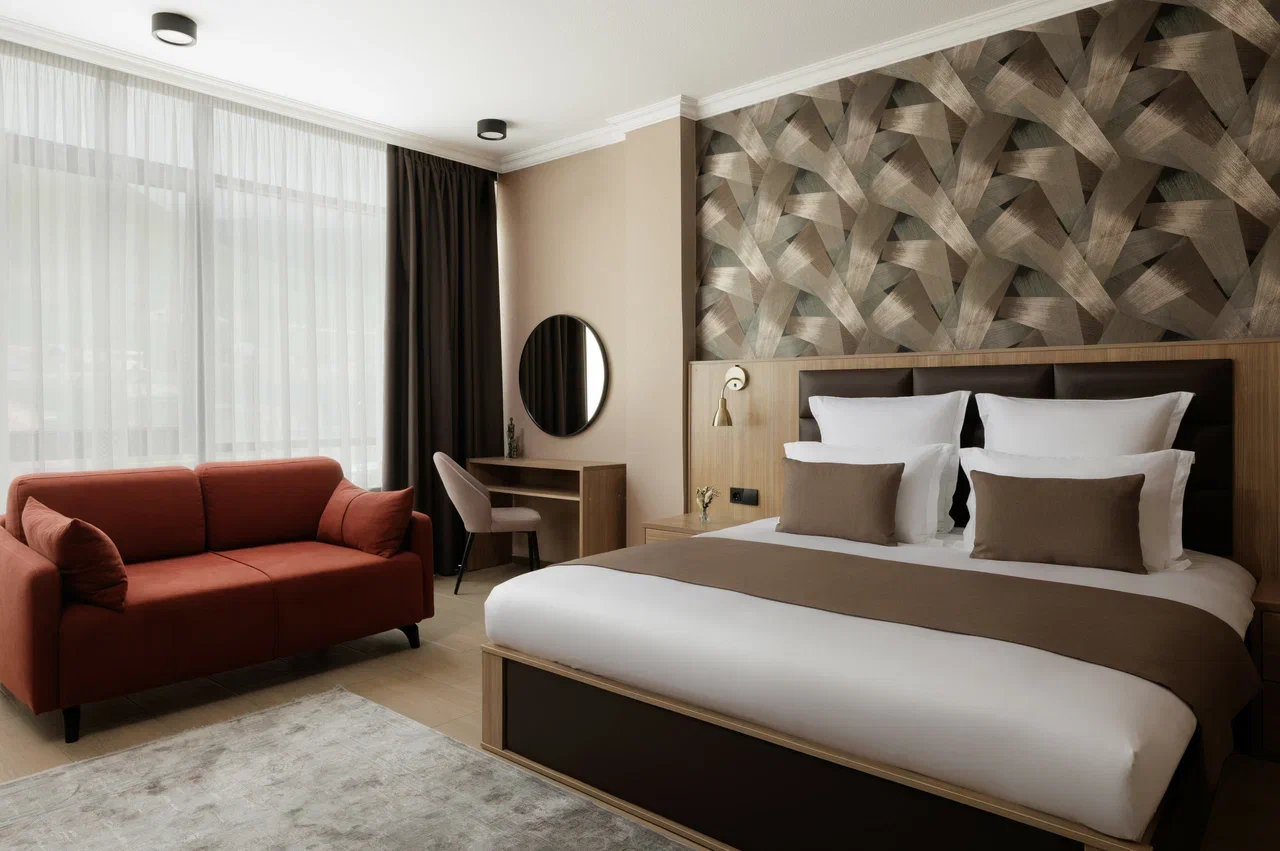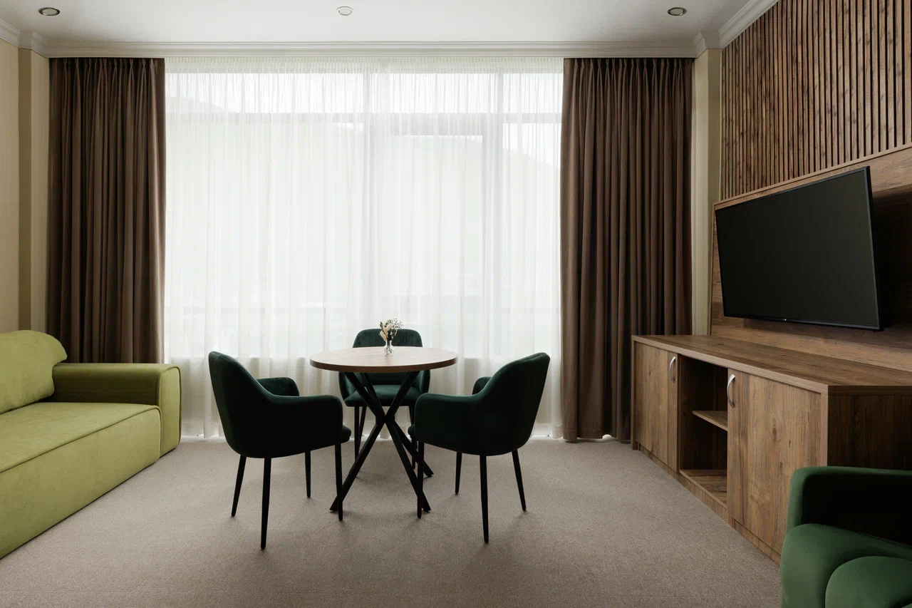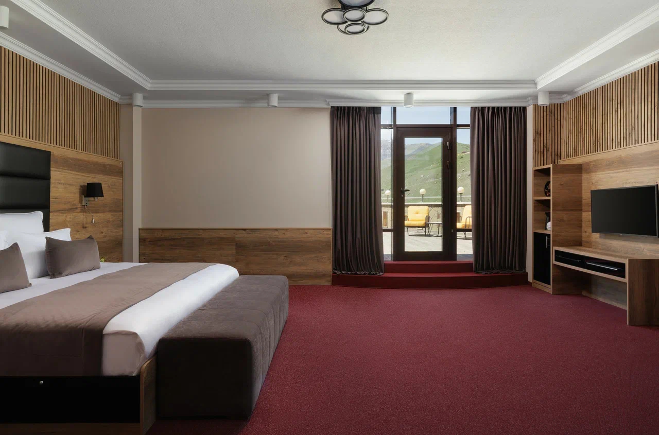 6-этажное современное здание отеля, оснащенное лифтом, разместилось среди горных массивов Большого Кавказского Хребта. Жилой фонд включает в себя 93 номера категории Стандарт и Люкс. В номерах лаконичный стильный интерьер, современная бытовая техника, панорамные окна, санузел с душем и косметических принадлежностей для гостей.