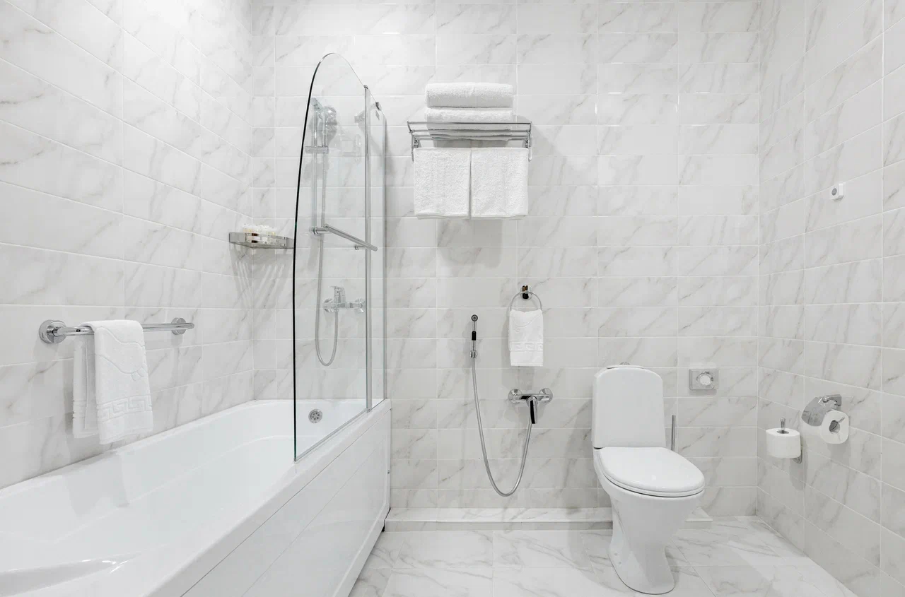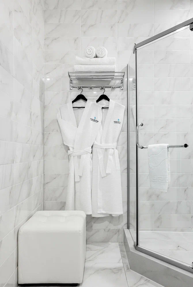 с душем: ; тапочки: ; туалетные принадлежности: ; фен: ; халат: ;