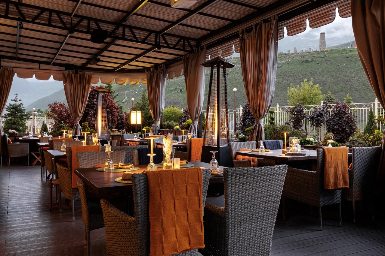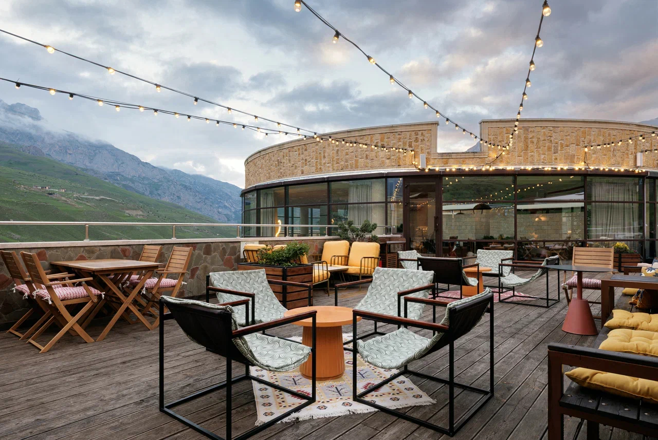 На территории комплекса работает сразу несколько кафе — Роза Ветров, в котором подаются блюда национальной осетинской кухни, кофейня Криолло с большим выбором сортов кофе, Скай-бар на последнем этаже, откуда открываются захватывающие виды на горы, а также изысканный ресторан с живой музыкой «Азимут». В распоряжении гостей крытый бассейн, сауна, зал для леченой гимнастики и тренажерный зал. Вечером отдыхающие могут поиграть в бильярд, настольный теннис, петь в караоке или посмотреть кинофильм. На территории комплекса ловит сеть wi-fi, для автовладельцев организована охраняемая парковка. Деловые встречи и переговоры можно провести в небольшой конференц-зале, рассчитанном на 40 мест. Для детей работает игровая комната с настольными играми, малышам отель предоставляет услуги воспитателя.