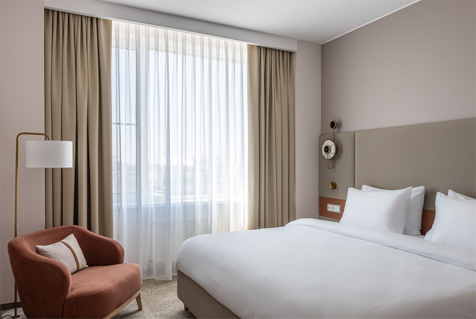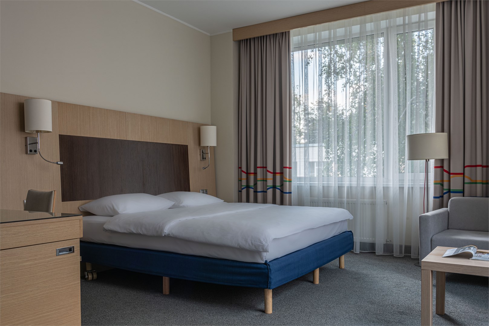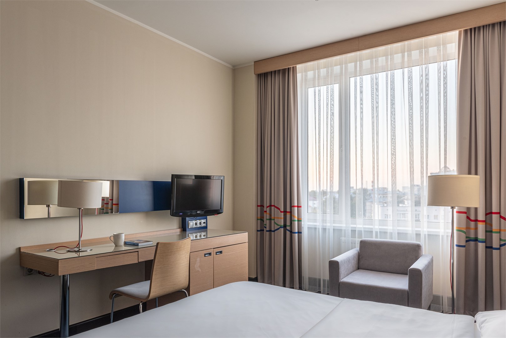 8-ми этажное здание отеля, оснащенное двумя лифтами, занимает огороженную территорию. Гостям предлагаются стильные, яркие 2-х местные номера категории Бизнес и Стандарт, укомплектованы современной техникой – кондиционером, телевизором, феном, холодильником и оборудованы санузлом с душем.