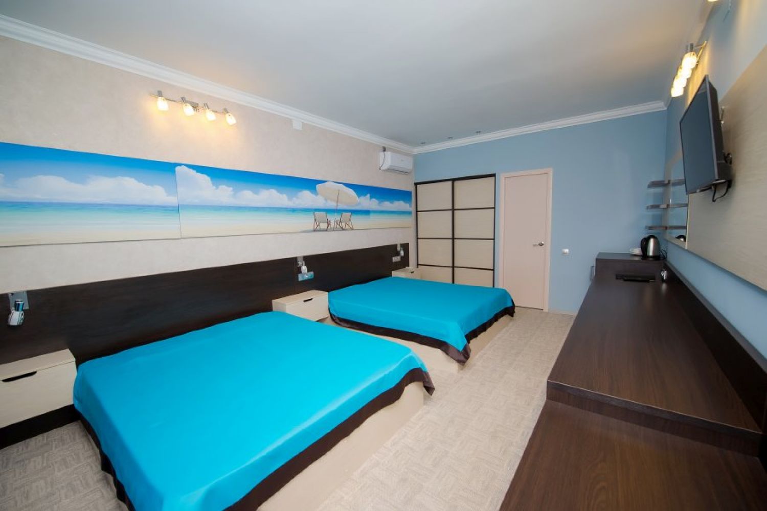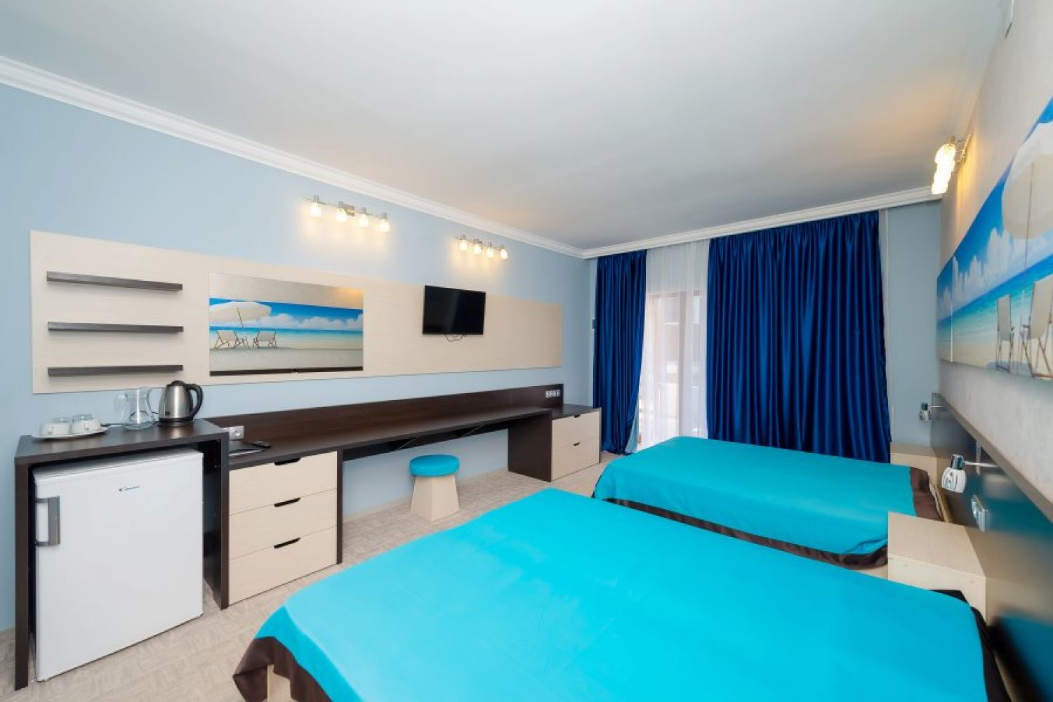 кондиционер: ; мини-холодильник: ; набор посуды: ; пляжные полотенца: ; сейф: ; телевизор: ; электрочайник: ;