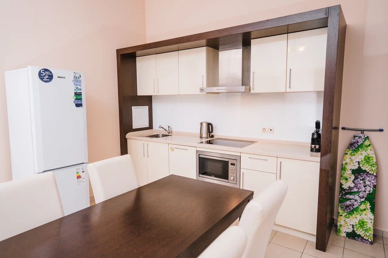 гладильная доска: ; кофемашина: ; микроволновая печь: ; набор посуды: ; плита электрическая: ; сплит-система: ; телевизор ЖК: ; телефон: ; утюг: ; холодильник: ; чайный набор посуды: ; электрочайник: ;