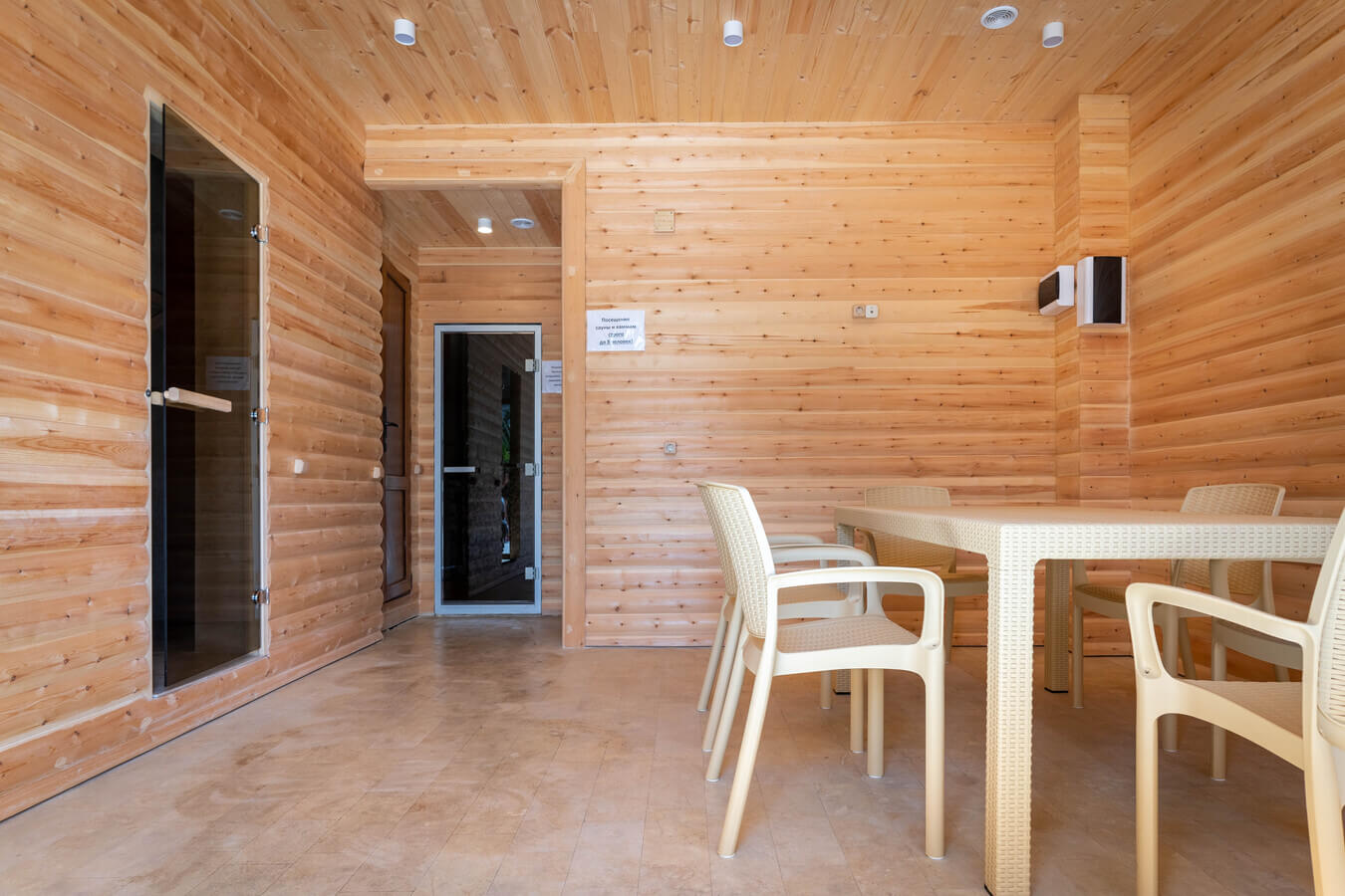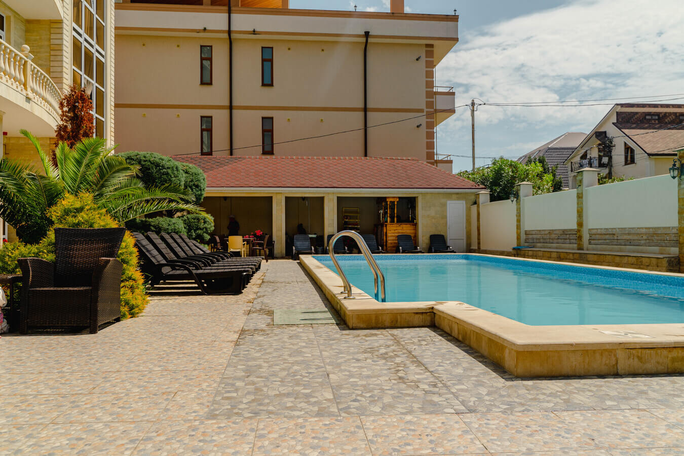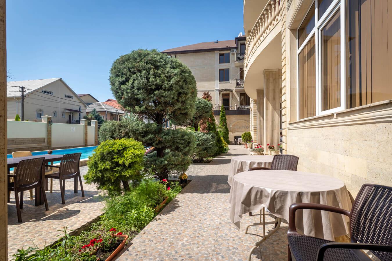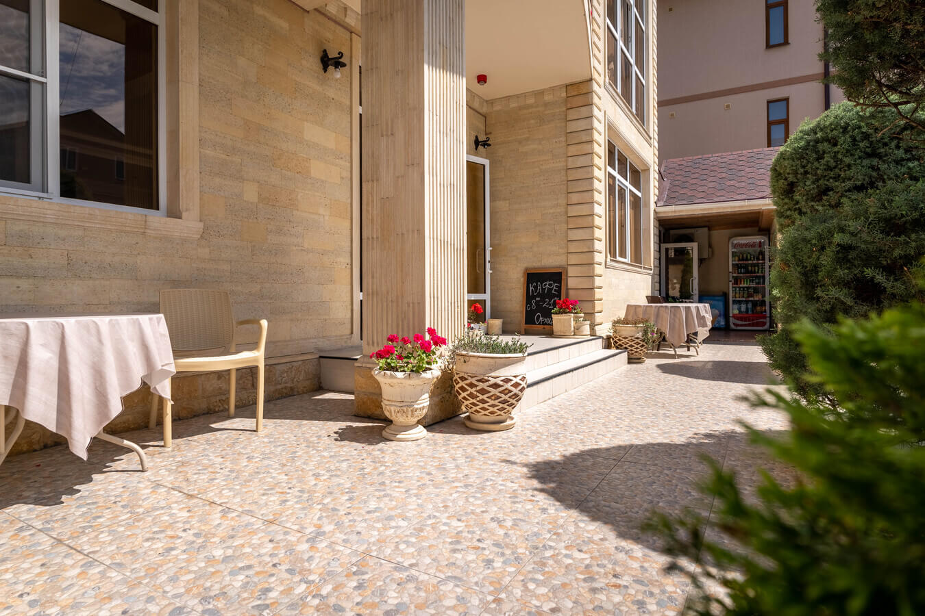 На первом этаже работает столовая с обеденными залами — крытым и открытым, также есть бар и летняя терраса. К услугам гостей уличный бассейн с подогревом. Также отдыхающим доступны охраняемая автостоянка и беспроводной интернет.