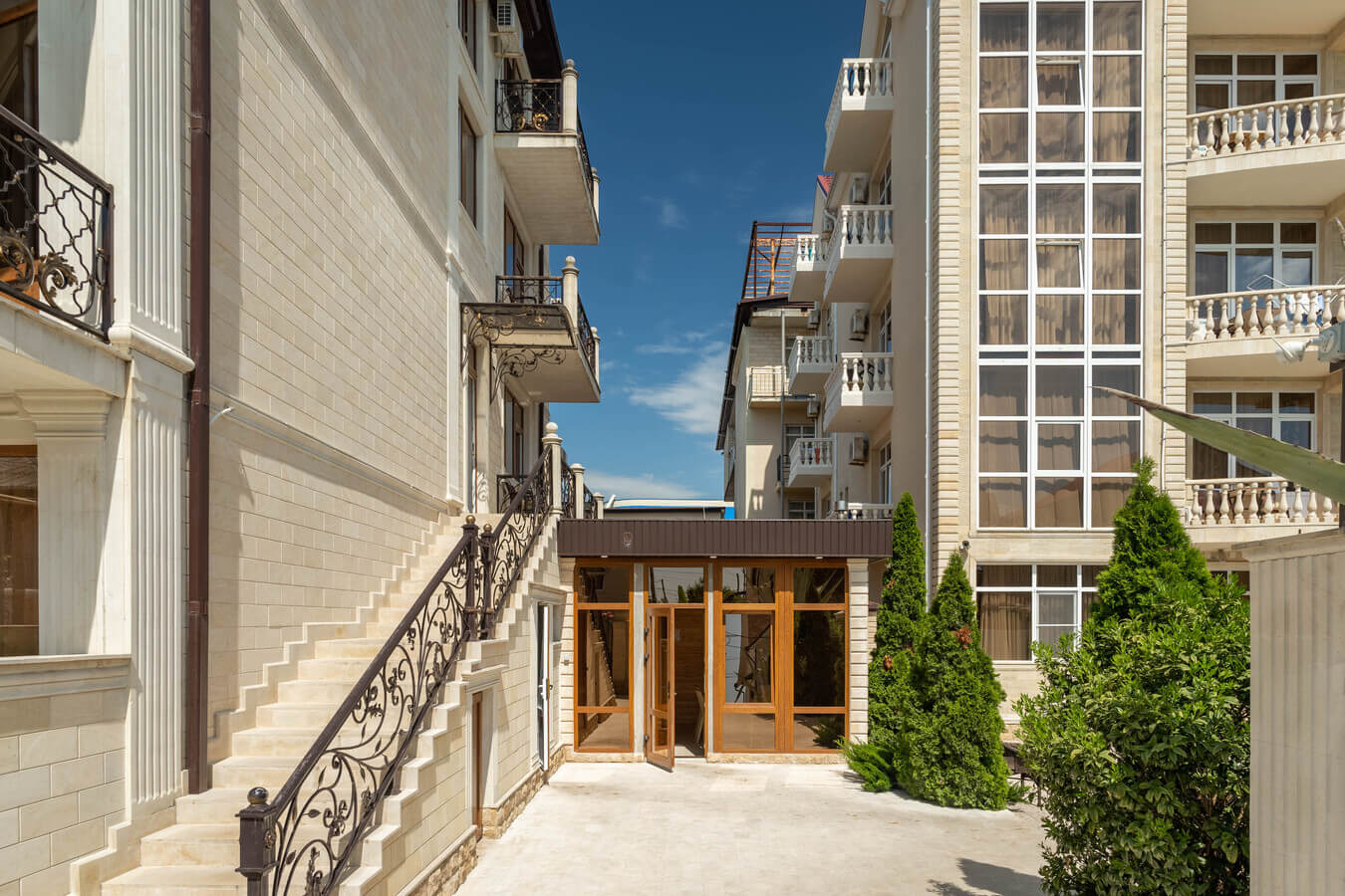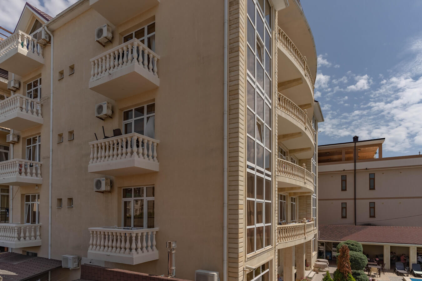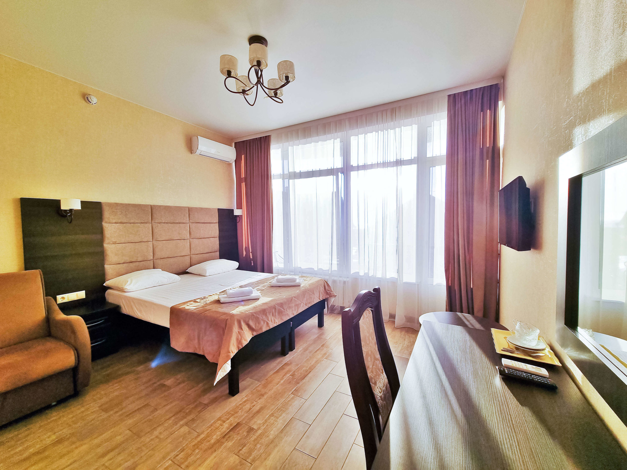 Пятиэтажный корпус отеля занимает благоустроенную территорию с уютным внутренним двором. В распоряжении отдыхающих двухместные комфортабельные номера с удобствами. В комнатах есть кондиционер, плазменный телевизор, чайный набор посуды и холодильник.