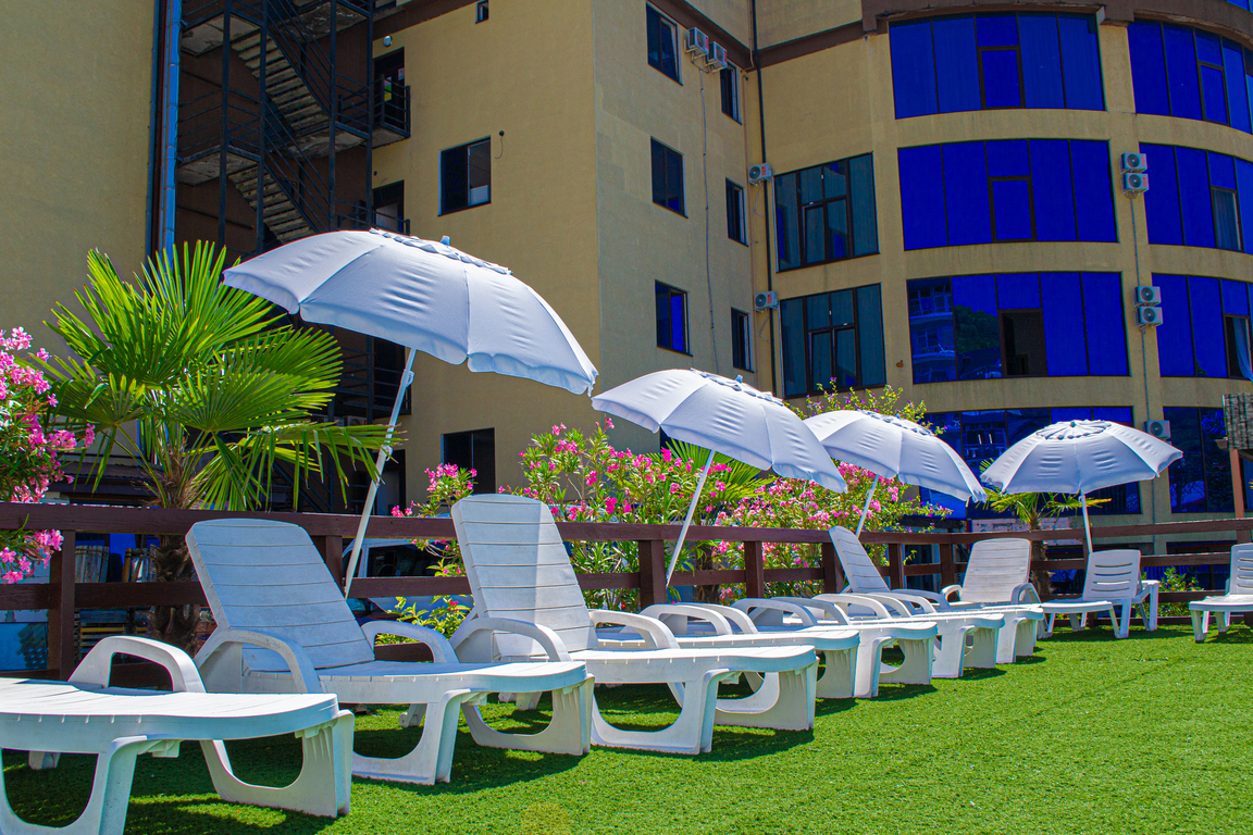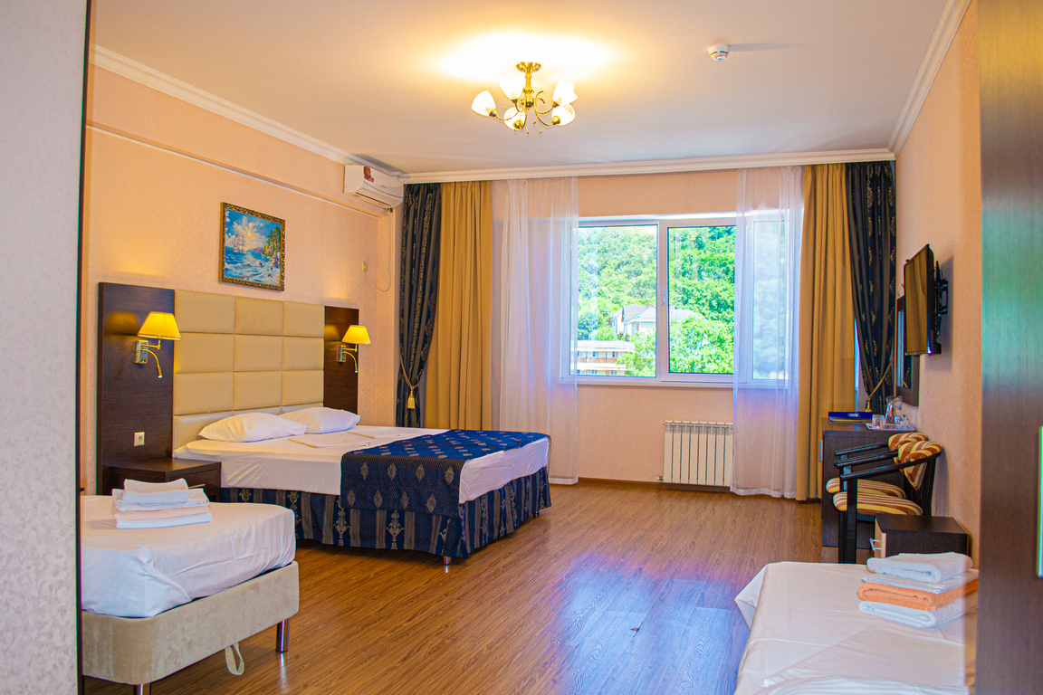 Пансионат имеет собственную парковку, здание отеля располагает солидным номерным фондом. Все номера оборудованы удобной мебелью и необходимой техникой, создающей максимальное удобство. На этажах есть меблированные террасы с панорамным видом на округу.