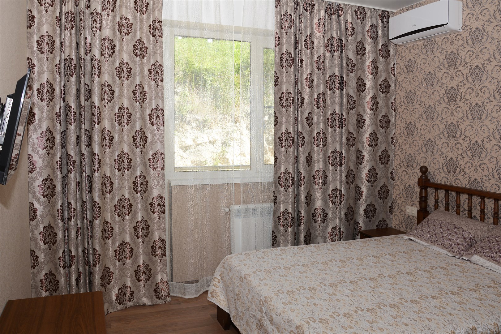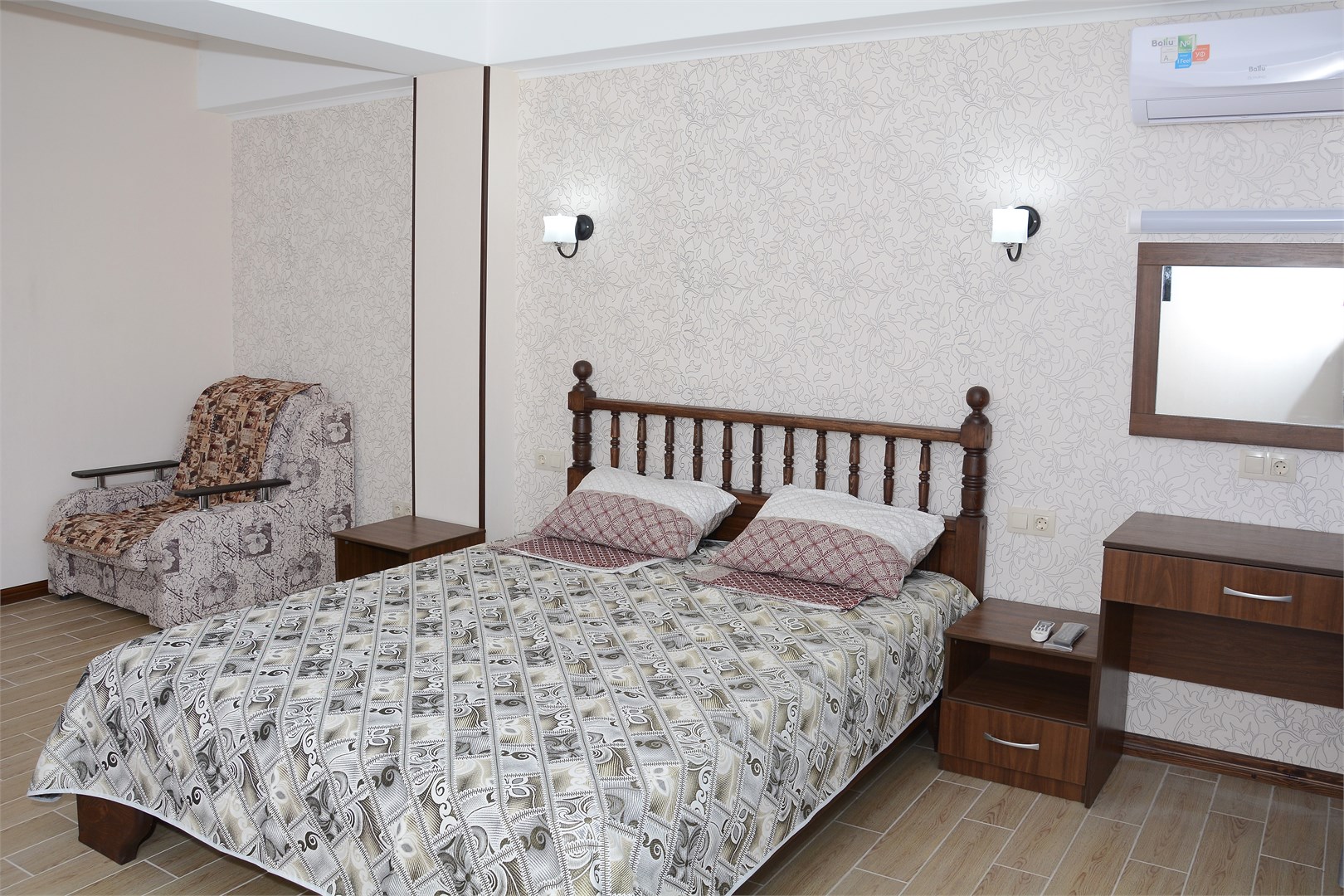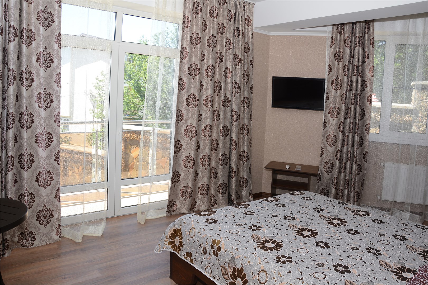 Трехэтажный корпус отеля занимает небольшую территорию, расположенную в 800 метрах от моря. Номерной фонд, рассчитанный на единовременное размещение более 40 гостей, предлагает просторные Апартаменты для 3-х или 4-х человек. Все Апартаменты оснащены кухней и необходимой бытовой техникой, есть санузел, в котором установлена душевая кабина и подготовлены косметические наборы для гостей.