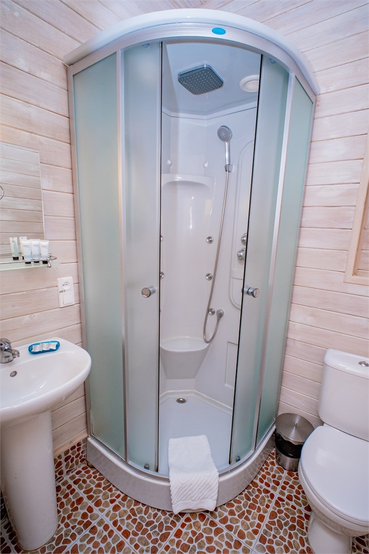 с душевой кабиной: ; тапочки: ; туалетные принадлежности: ; фен: ; халат: ;