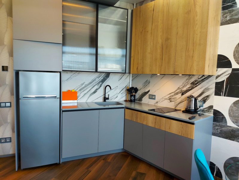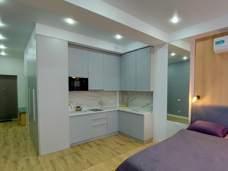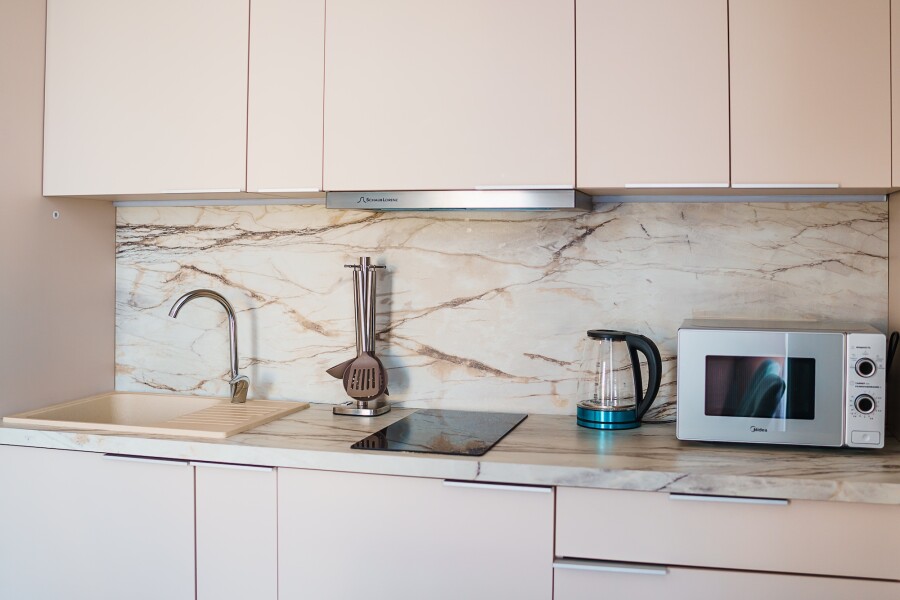 кондиционер: ; микроволновая печь: ; набор посуды: ; плита индукционная: ; стиральная машина: ; телевизор ЖК: ; утюг: ; холодильник: ; электрочайник: ;