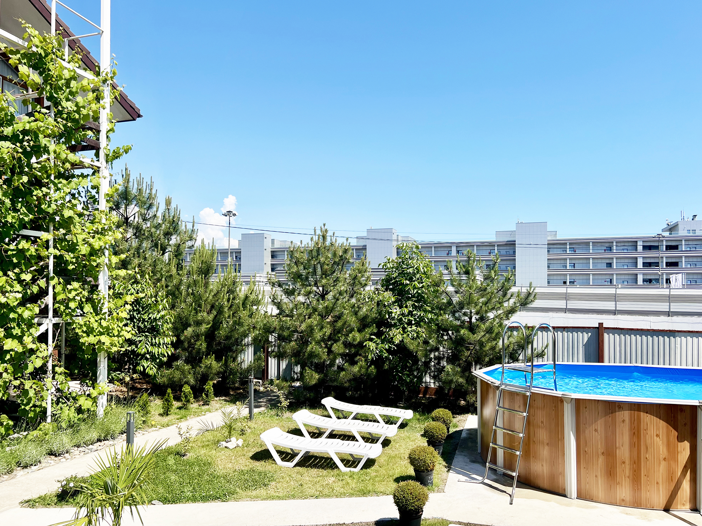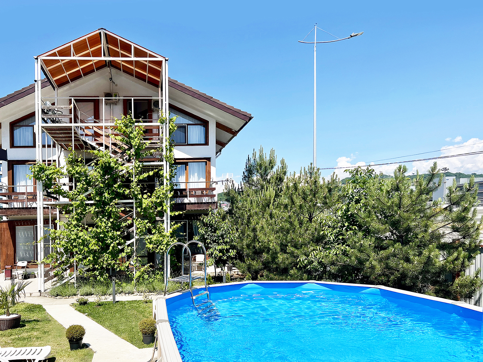 Среди услуг – беспроводной интернет и парковка возле корпуса. До городского пляжа можно дойти пешком за 25-30 минут или за 5 минут доехать на машине. Галечный пляж хорошо оборудован, на побережье установлены лежаки, навесы, шезлонги, работают бары, сувенирные киоски, много водных развлечений.
