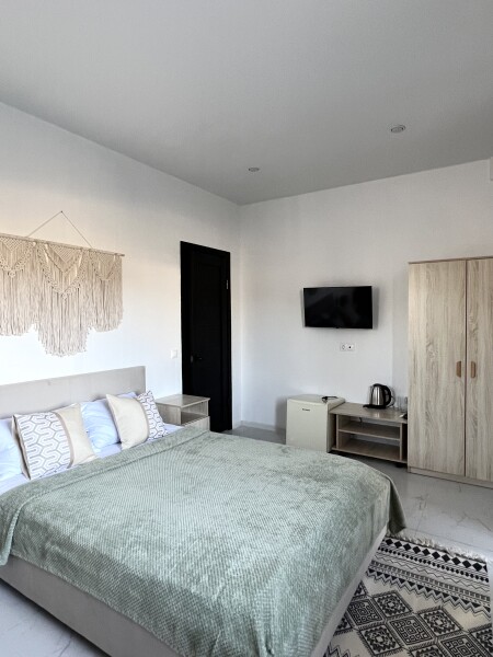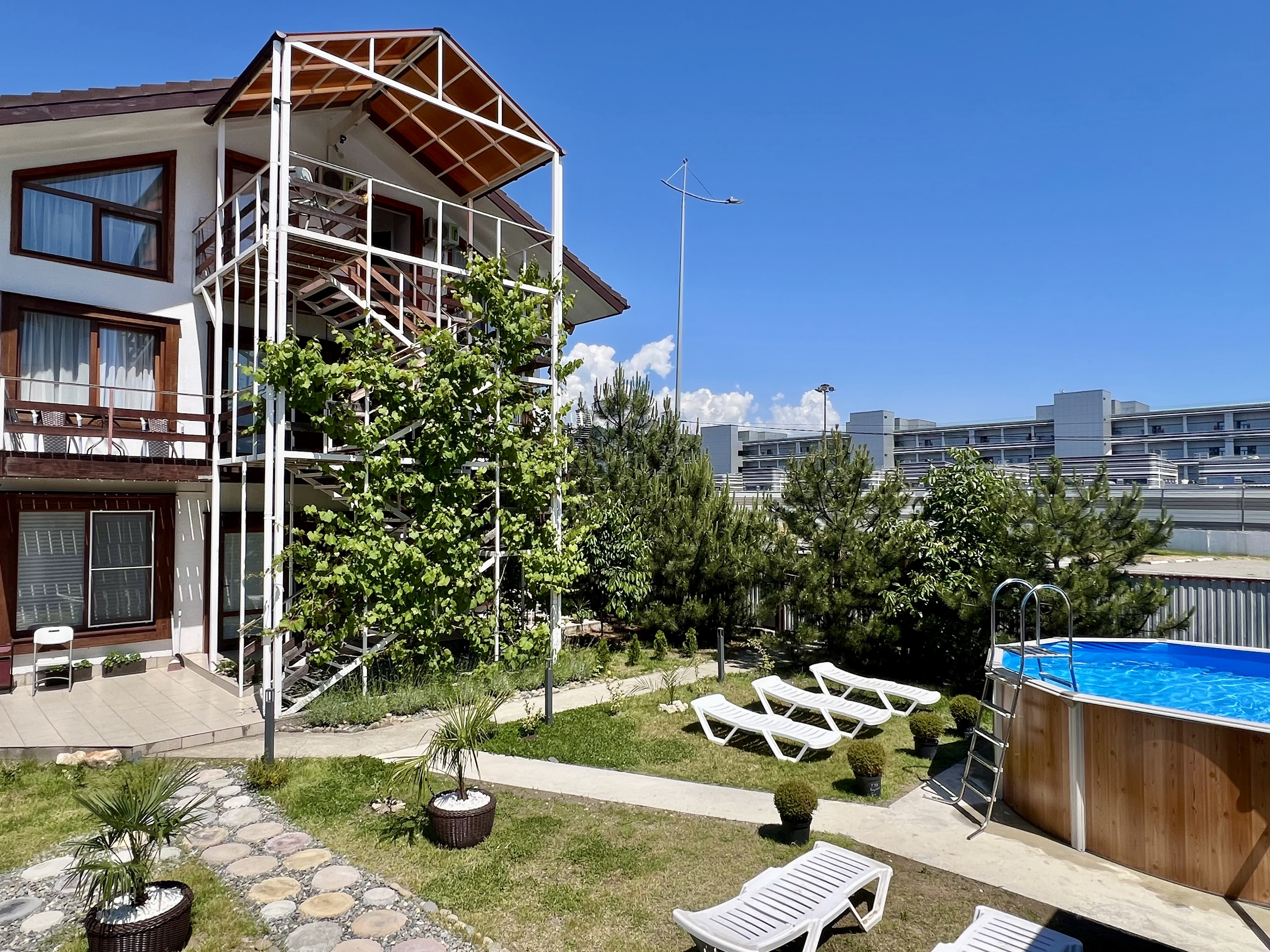 Трехэтажный корпус гостевого дома занимает небольшую закрытую территорию. Жилой фонд, рассчитанный на 25 человек, предлагает гостям двух- и трехместные номера с балконами и без. В каждом номере предусмотрен санузел, есть кондиционер, электрочайник и чайный набор посуды.