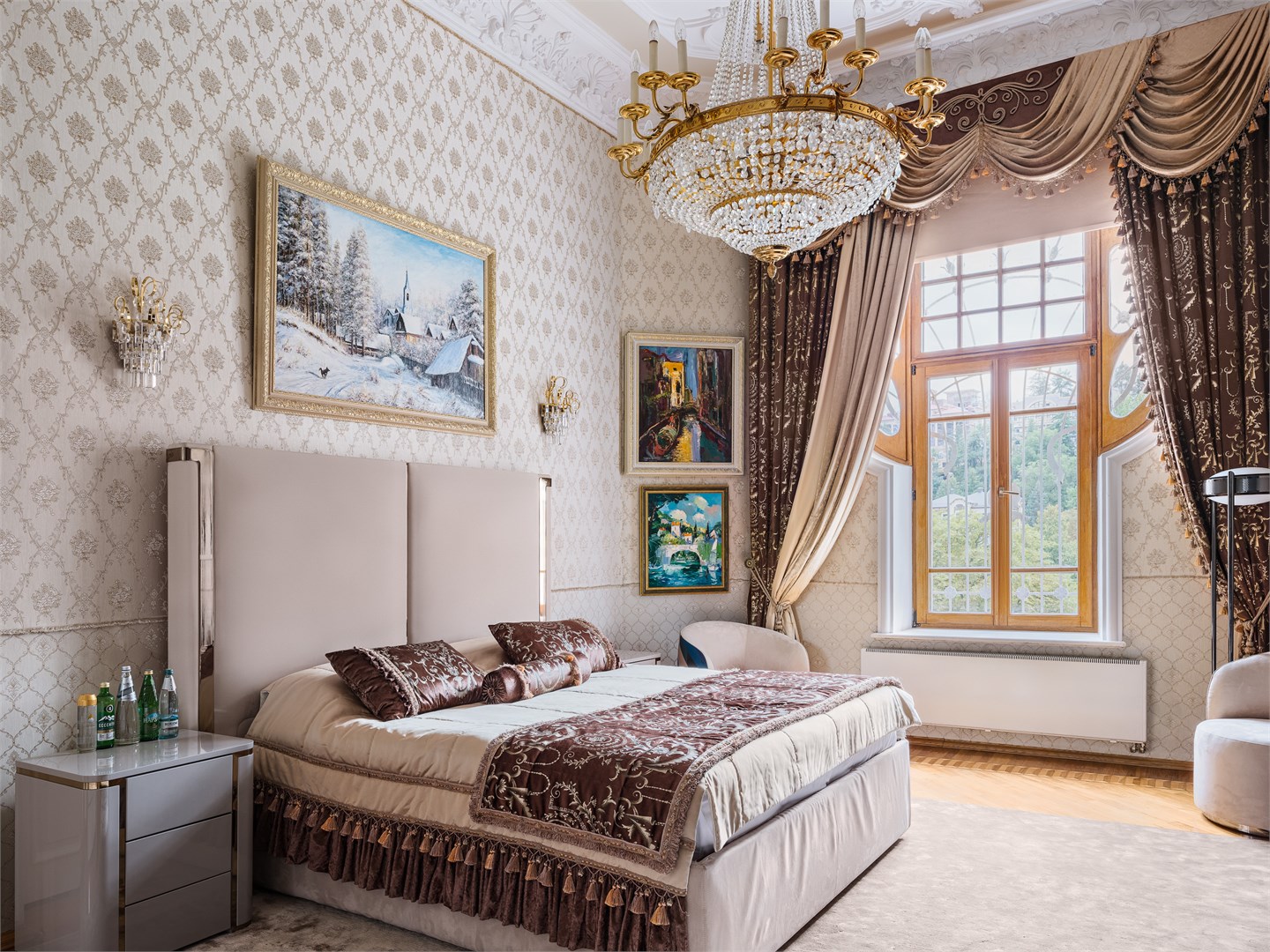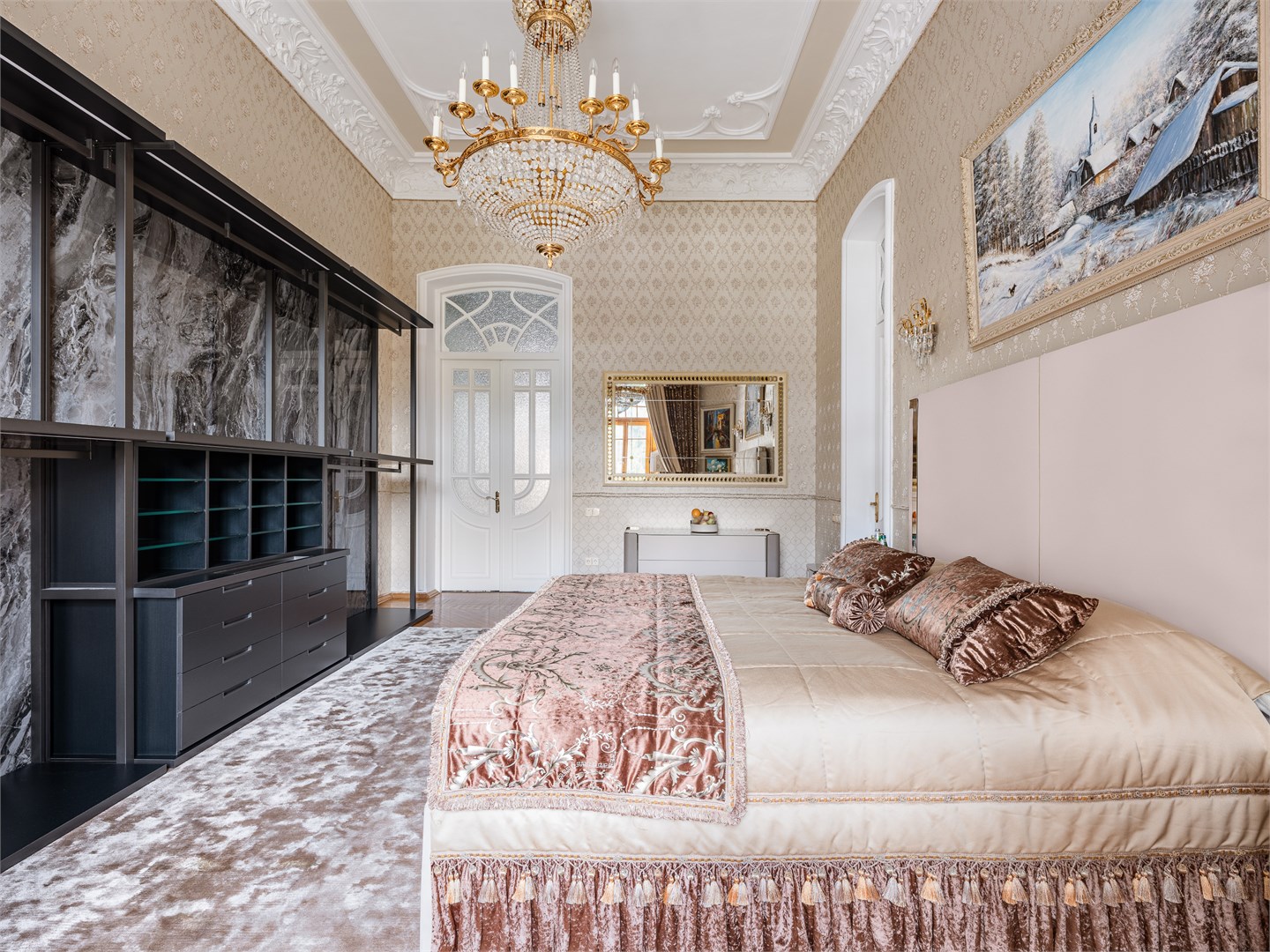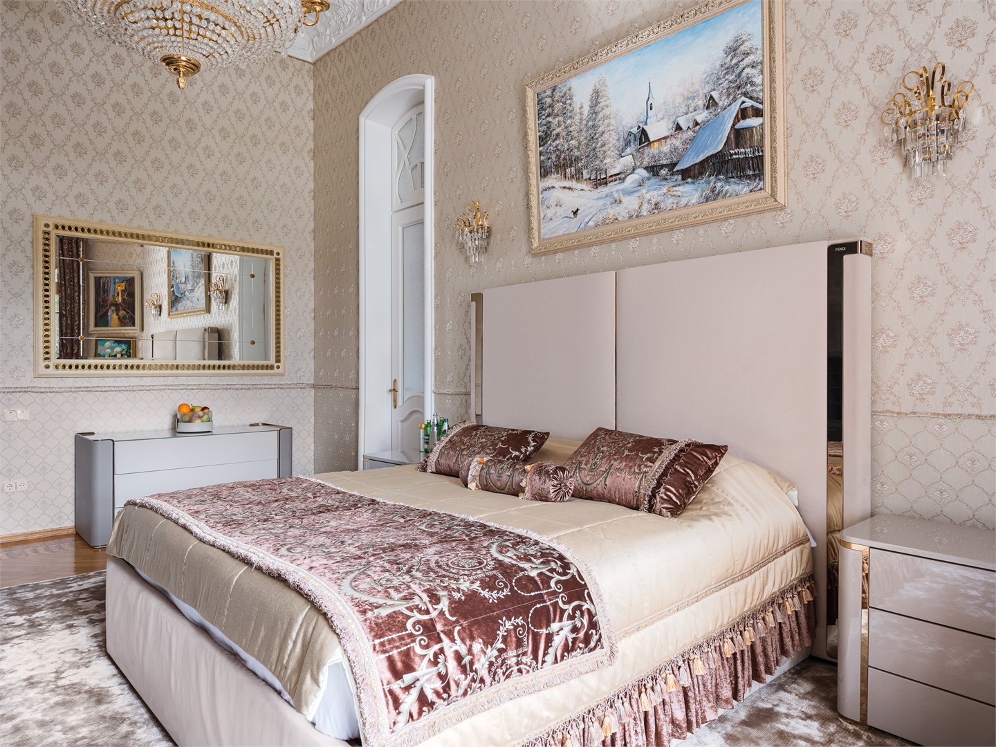 вешалка: ; диван: ; зеркало: ; кресла: ; кровать двуспальная: ; прикроватные тумбочки: ; стол: ; стулья: ; шкаф: ;