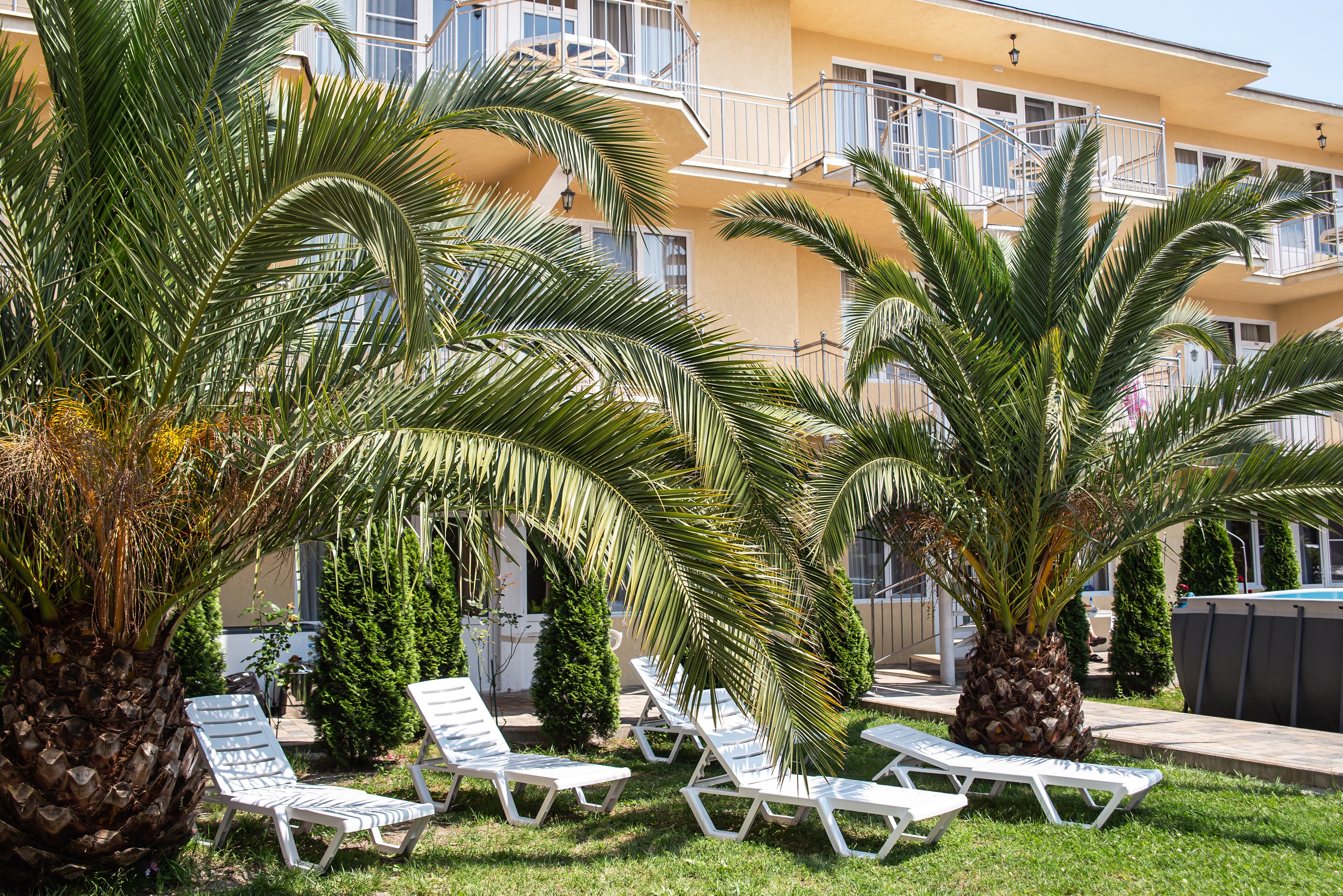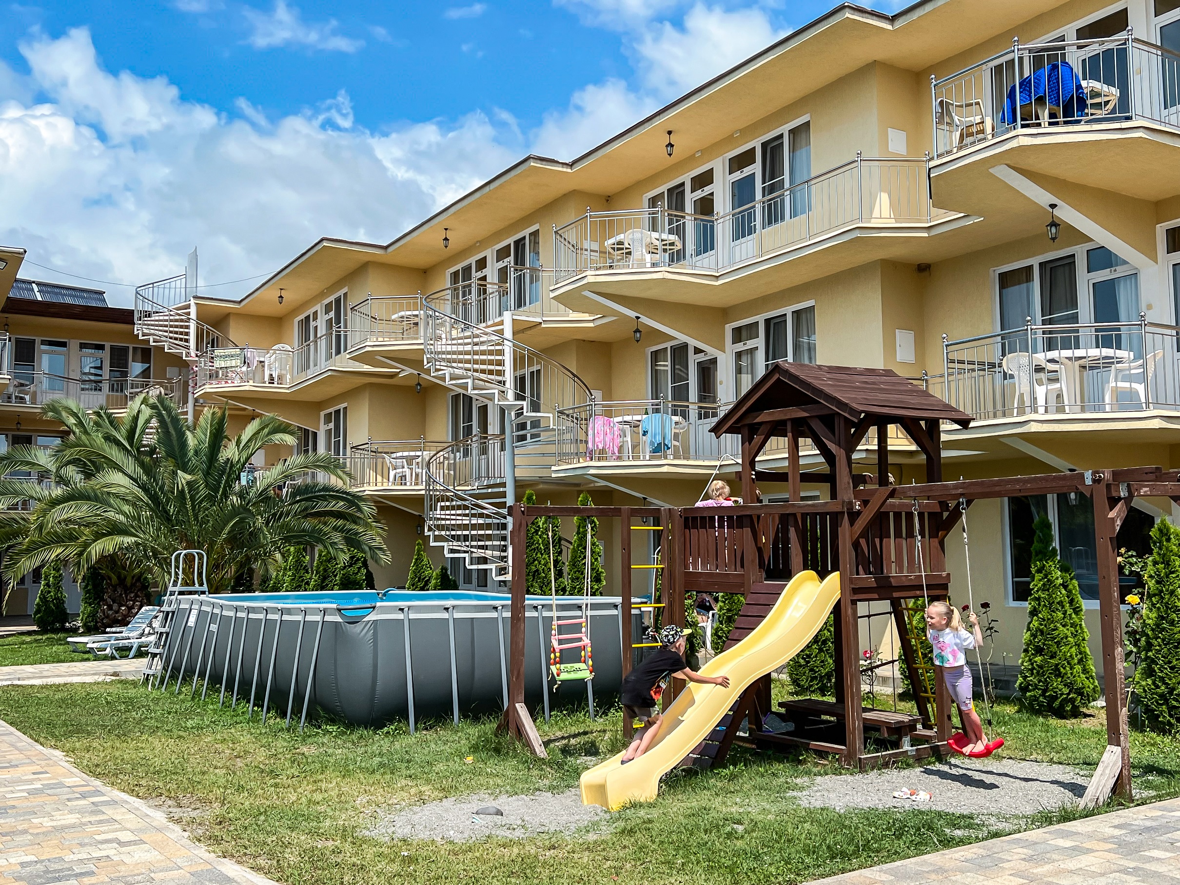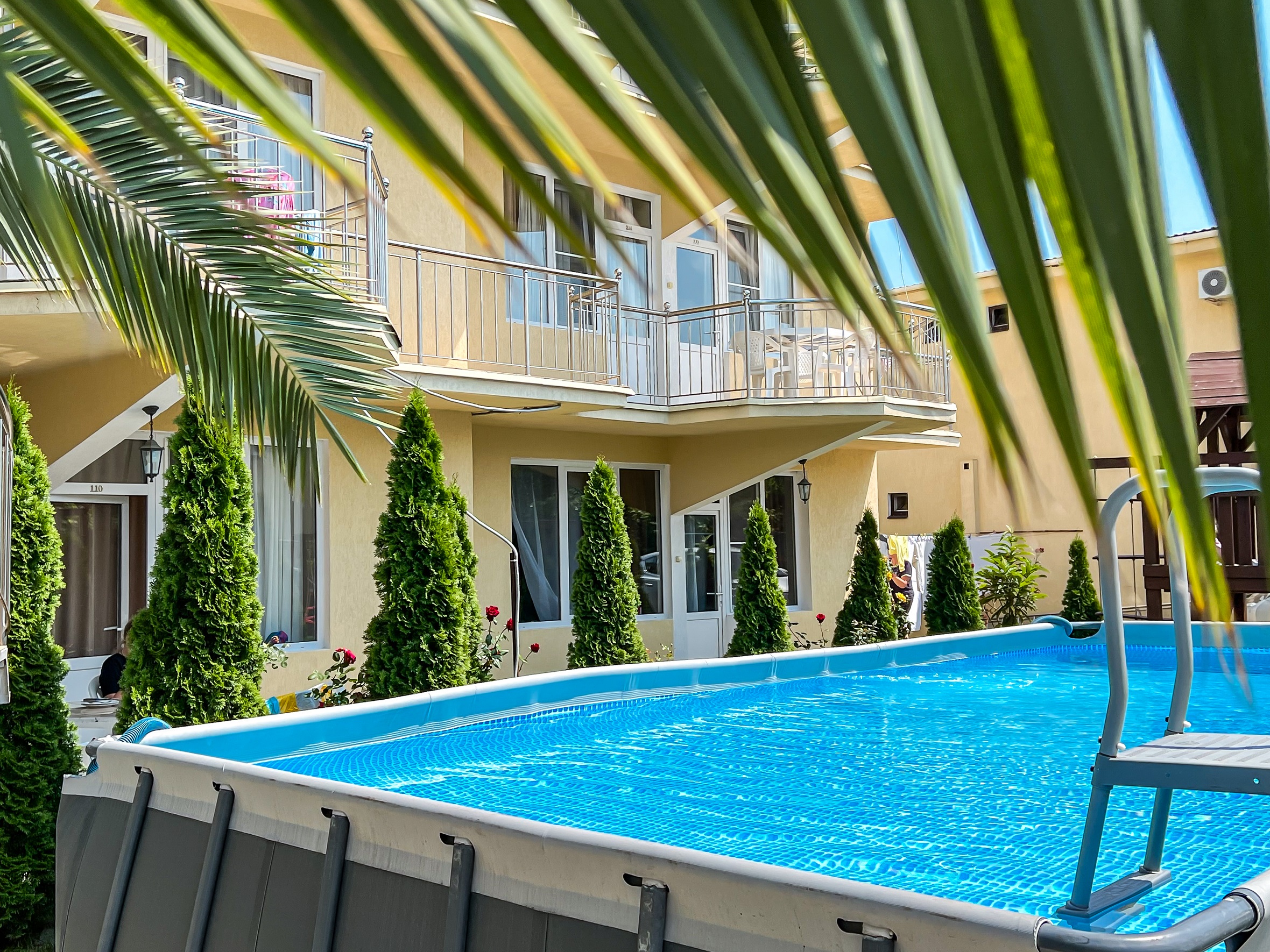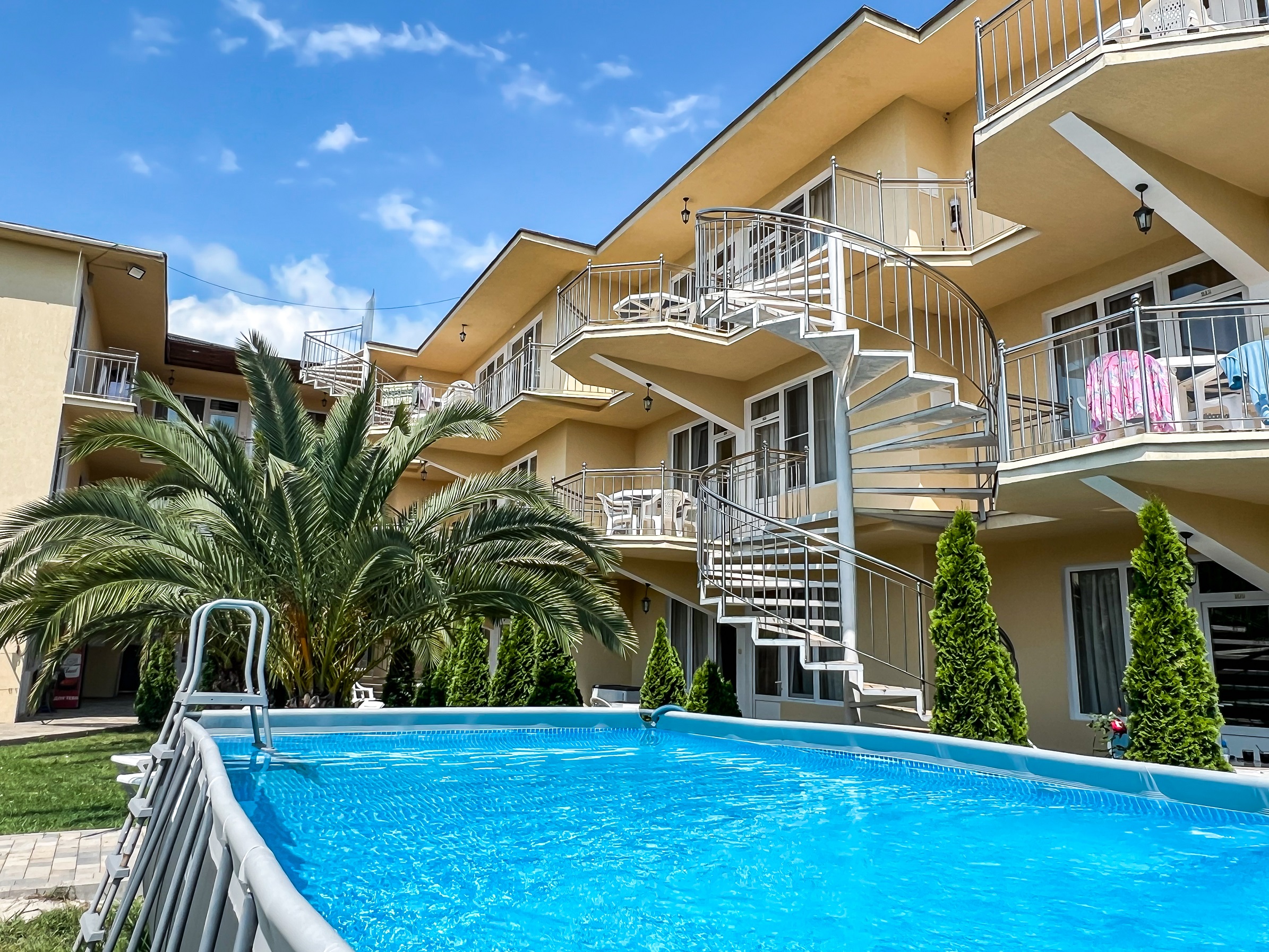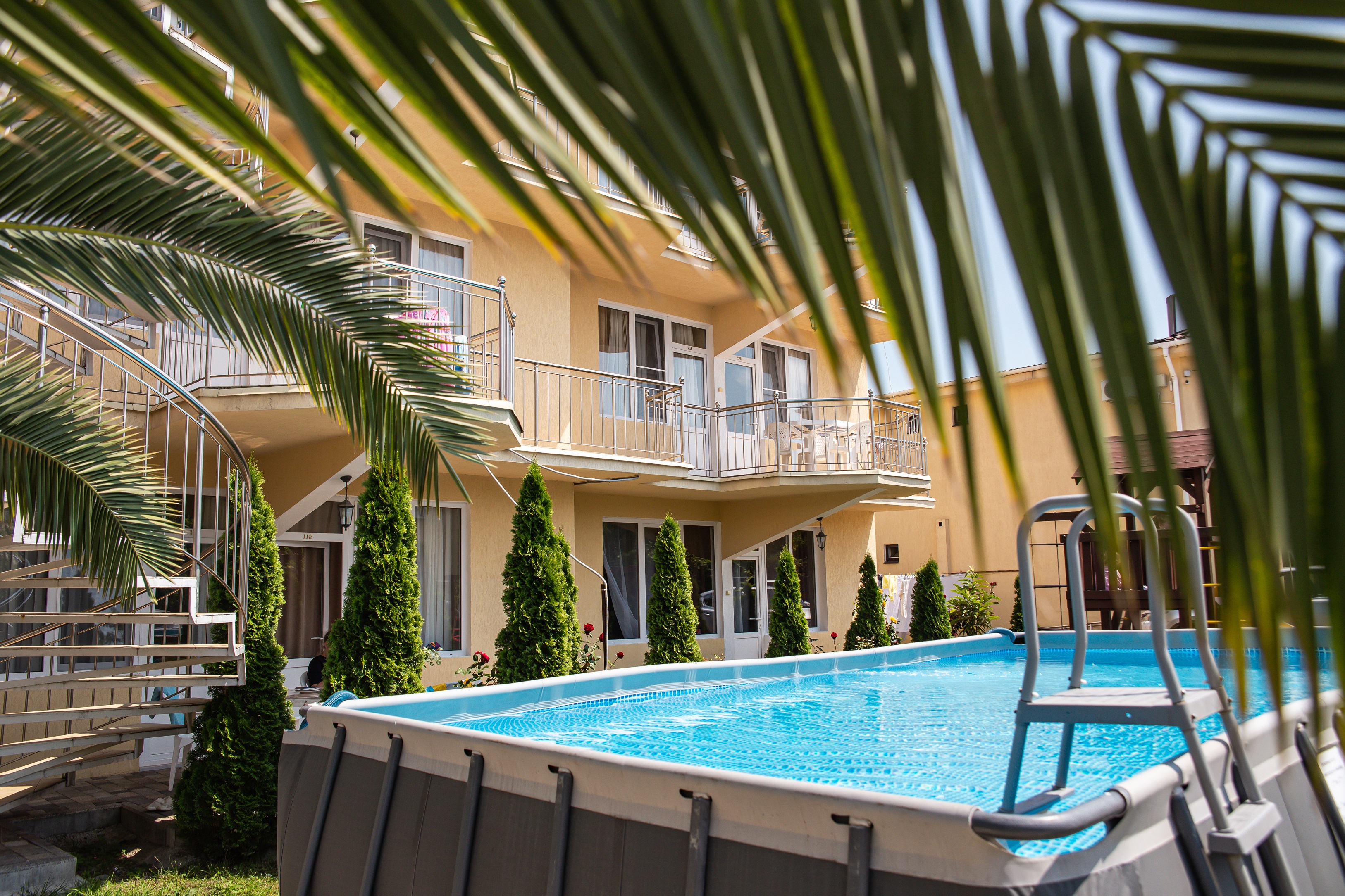 На огороженной и благоустроенной территории отеля оборудована зона отдыха, зона барбекю, а также большой каркасный бассейн. Есть столовая и летний бар. Для детей организована игровая площадка, а для автовладельцев предусмотрена охраняемая парковка. Всего в 5 минутах ходьбы – живописный песчано-галечный пляж.