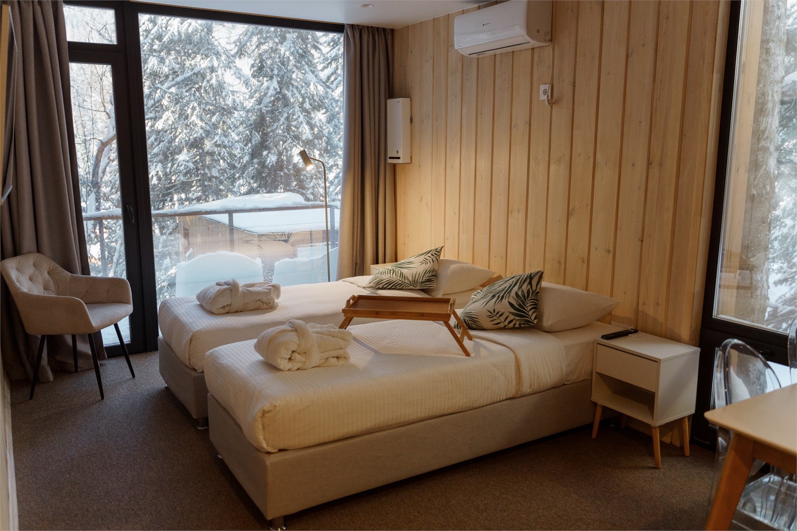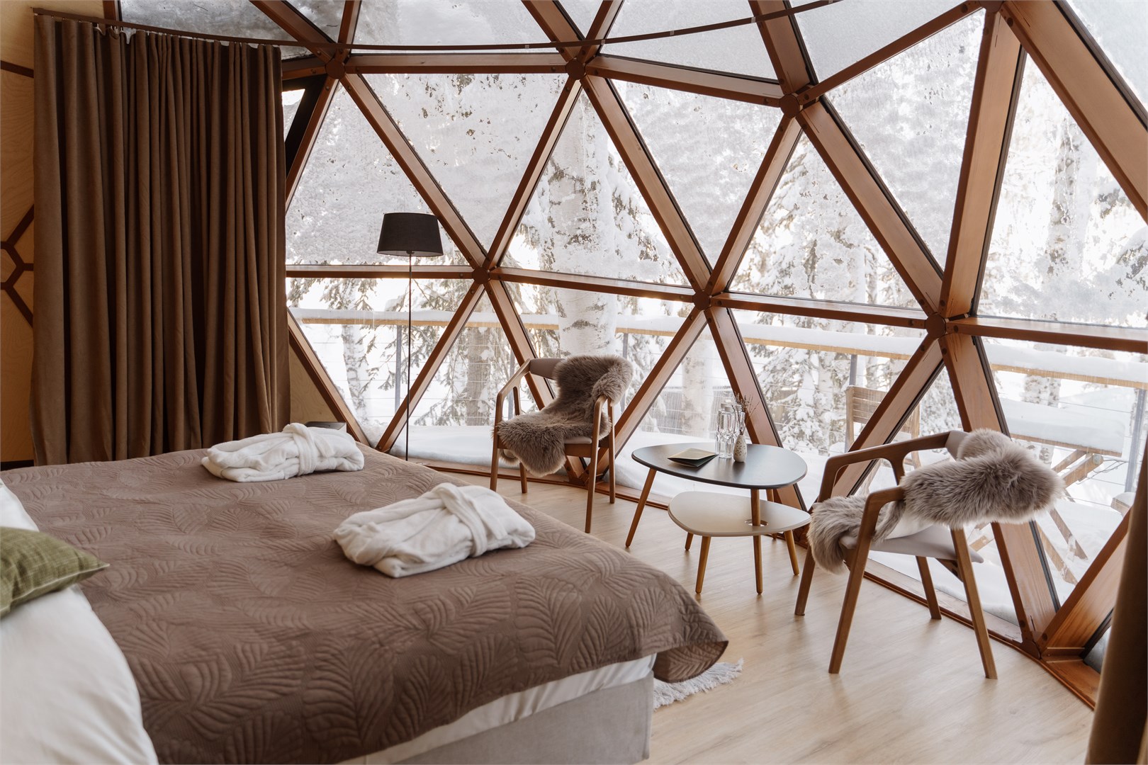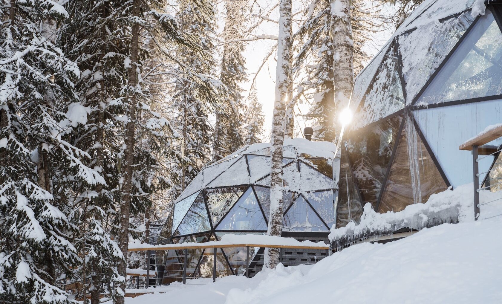 Стильный современный комплекс разместился в окружении живописного хвойного леса. Это вариант отлично подойдет тем, кто любит активный отдых на природе, но предпочитает уединенную спокойную атмосферу. В распоряжении гостей круглогодичные дома барнхаус, бунгало и купольный домик иглу. В теплое время года доступны летние глемпинги. Все варианты размещения оснащены персональным санузлом, необходимой мебелью и техникой. В домах стильный эргономичный дизайн, а из окон открываются виды на лес и горы. Рядом с каждым домиком оборудована мангальная зона.