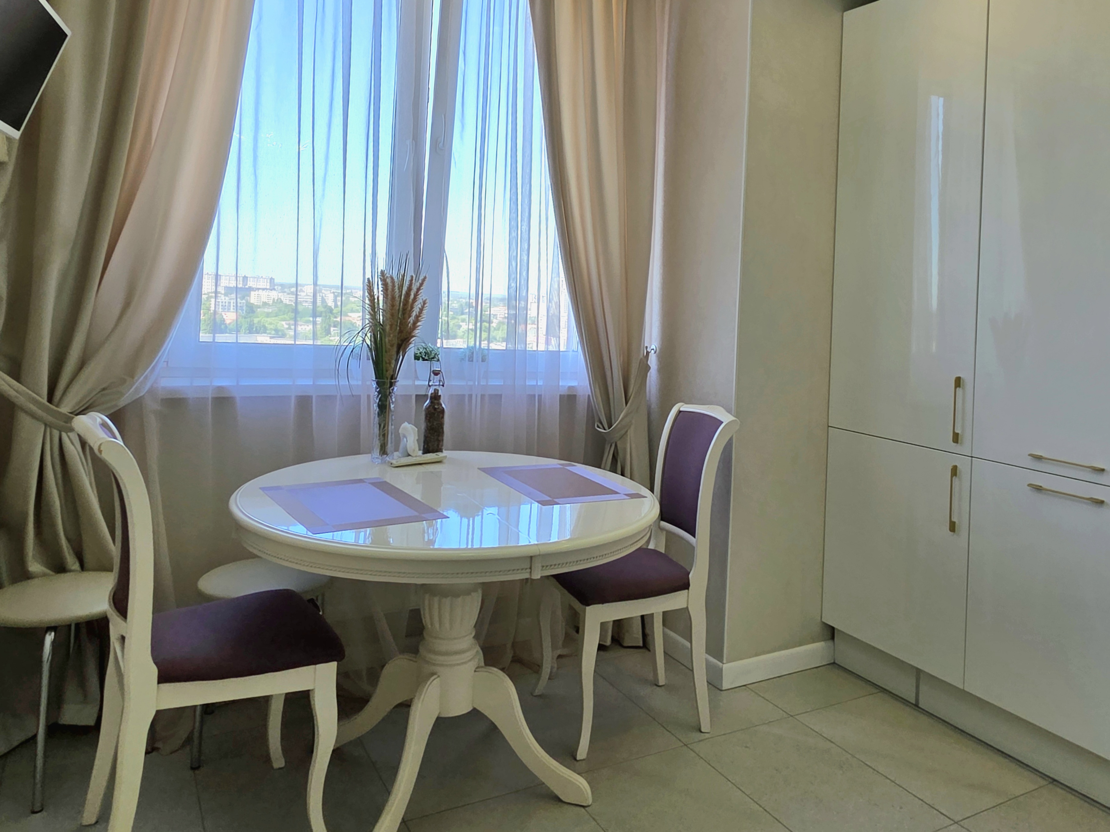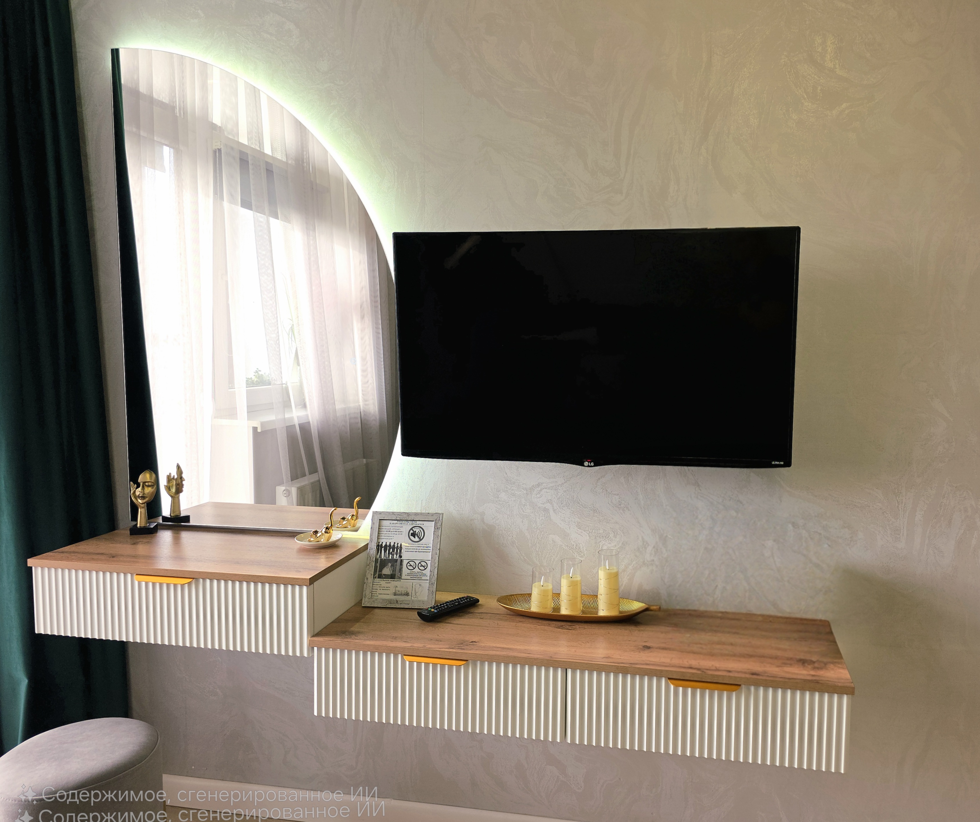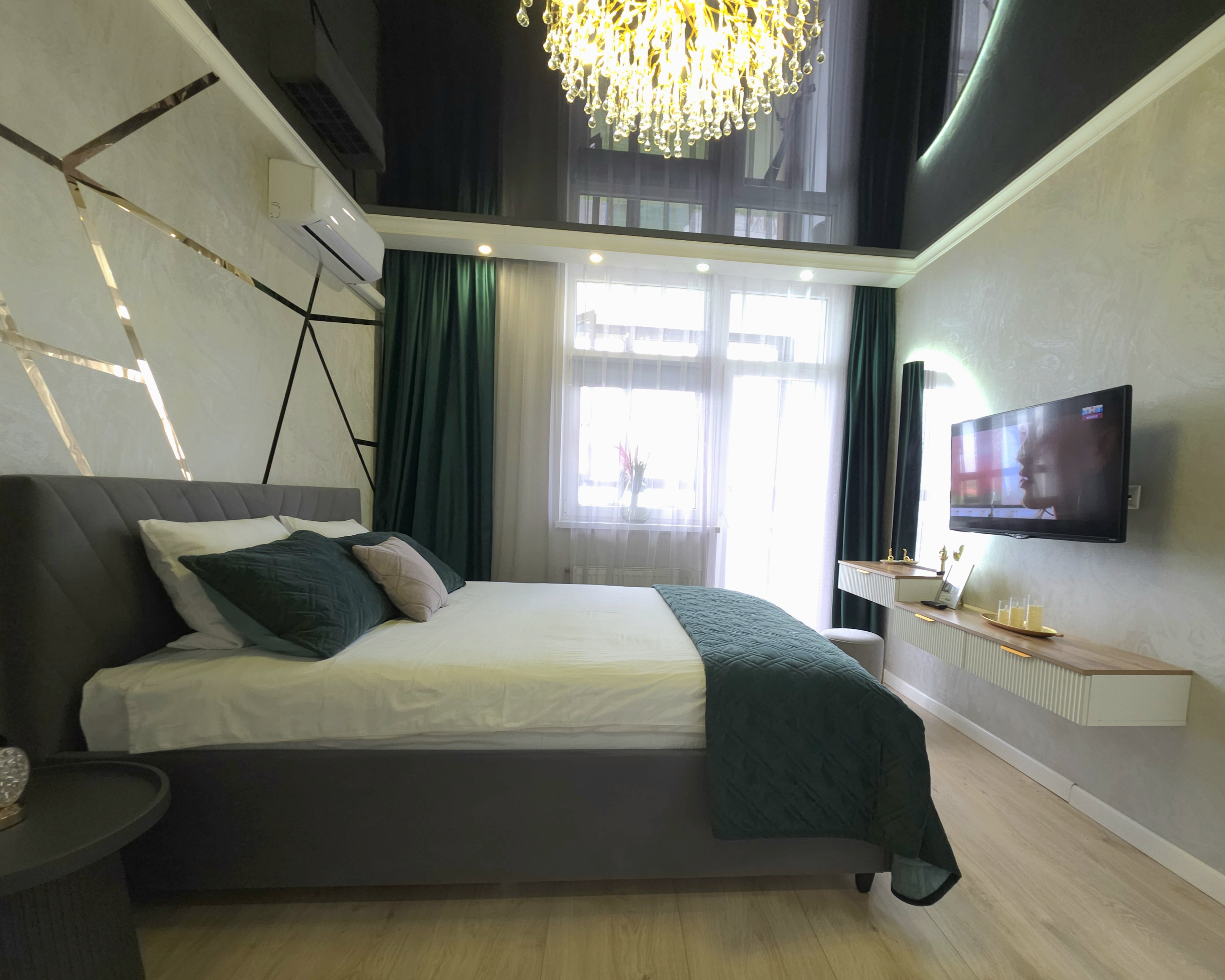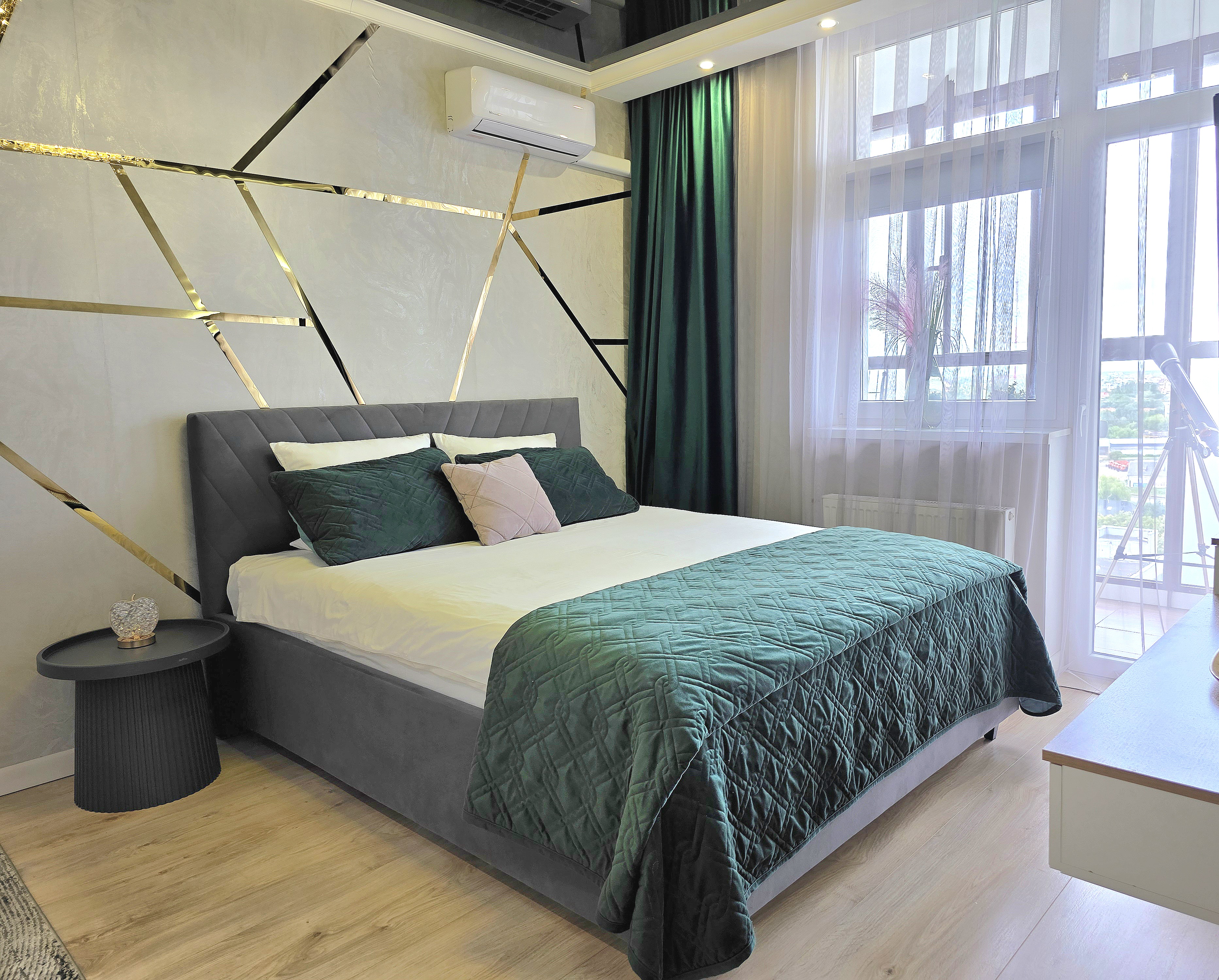 2-х местный номер с кухней, полностью укомплектованный современной бытовой техникой: есть кондиционер, газовая плита, холодильник, посудомоечная машина, микроволновая печь, стиральная машина, утюг, фен, тостер и плазменный телевизор со smаrt-ТВ. Также в номере имеется меблированный балкон, а из окон открываются красивые виды на город.