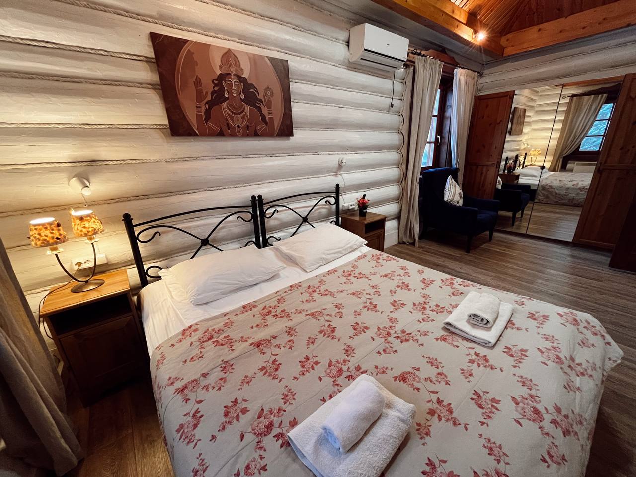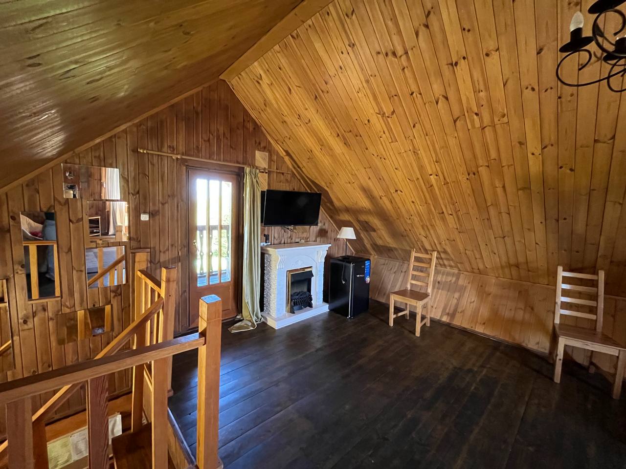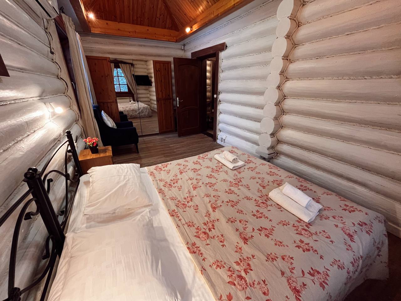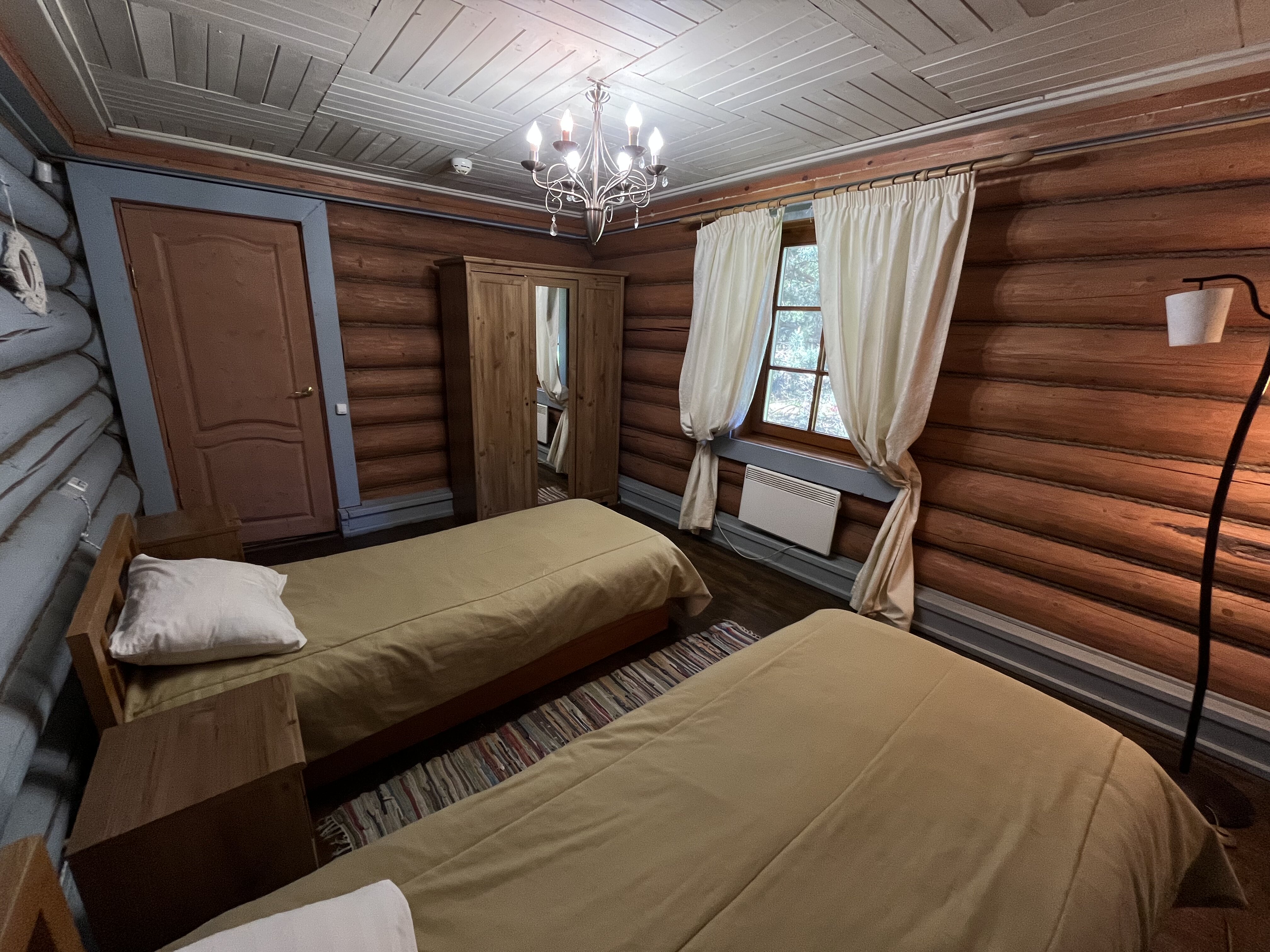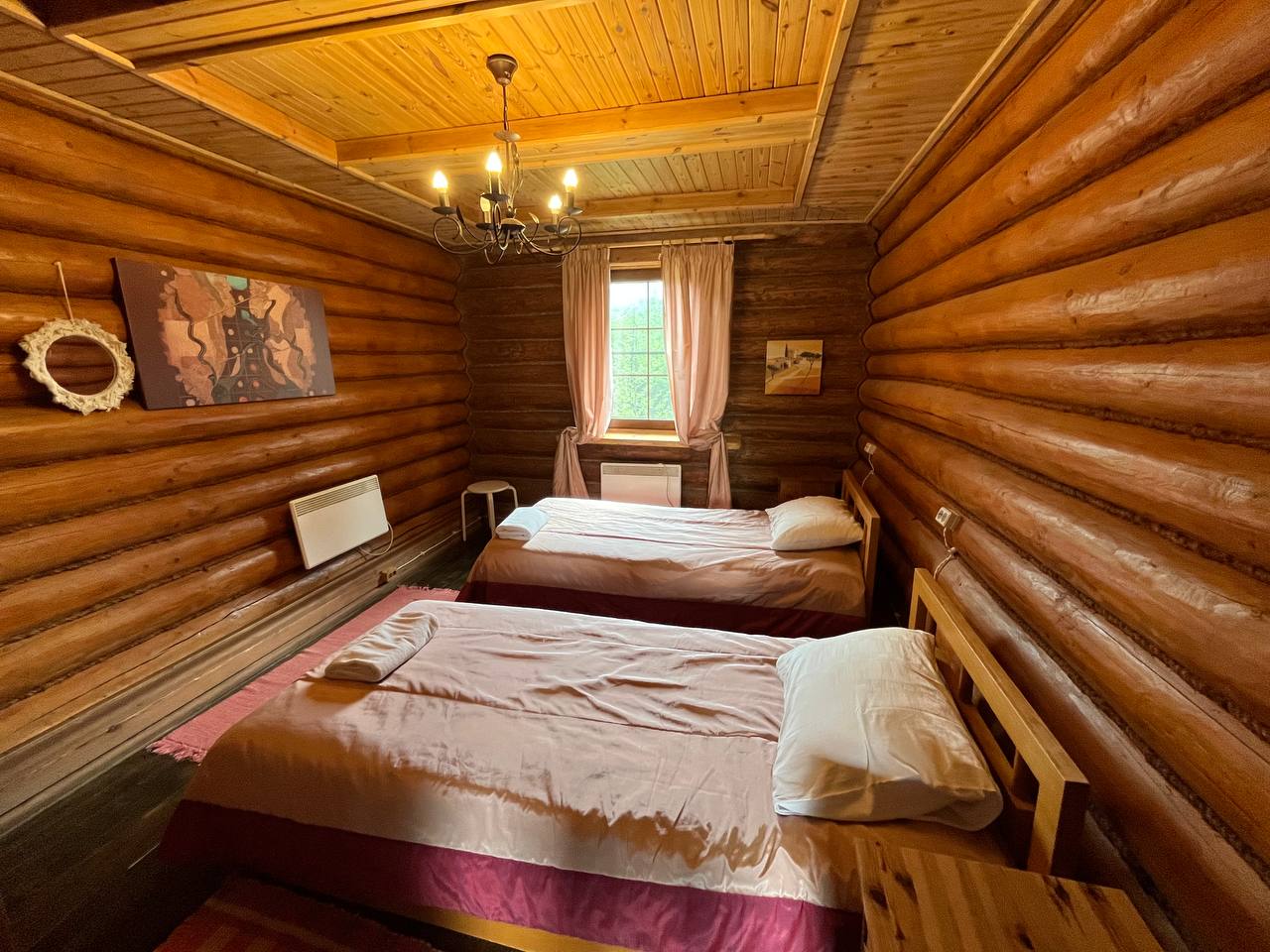 К расположению гостей предлагаются отдельно стоящие 1-этажные и 2-этажные деревянные домики разного уровня вместимости. Внутренняя отделка комнат уютная, выполнена из натуральных материалов. Установлены кровати, раскладные диваны, шкафы, журнальные столики. Из бытовой техники предлагаются микроволновые печи, мини-холодильники, электрические чайники. Санузел индивидуальный, с душевой кабиной. К услугам гостей полотенца и туалетные принадлежности.