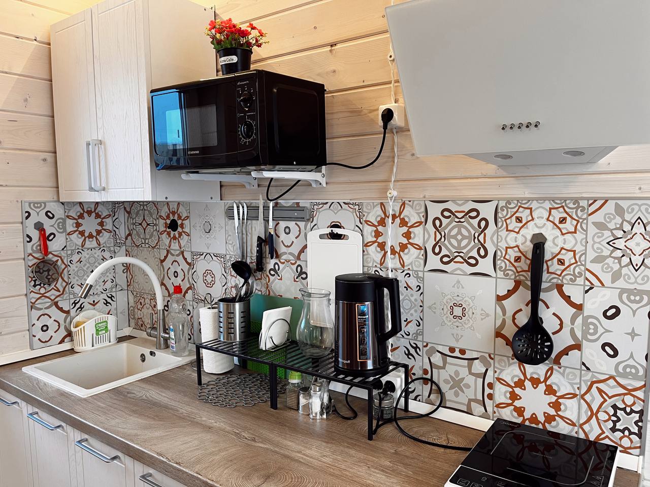 кондиционер: ; микроволновая печь: ; мини-холодильник: ; набор посуды: ; плита электрическая: ; чайный набор посуды: ; электрочайник: ;