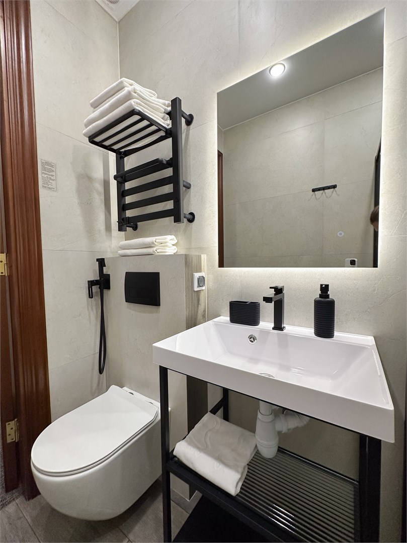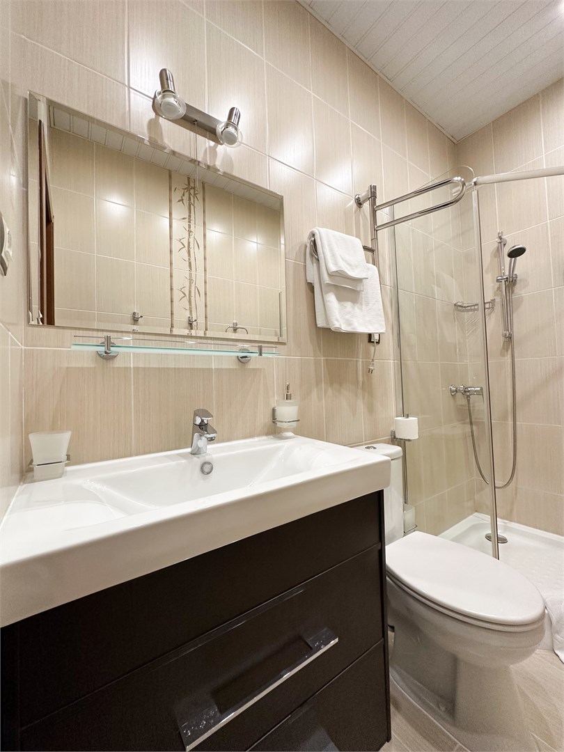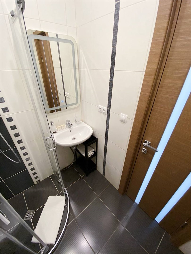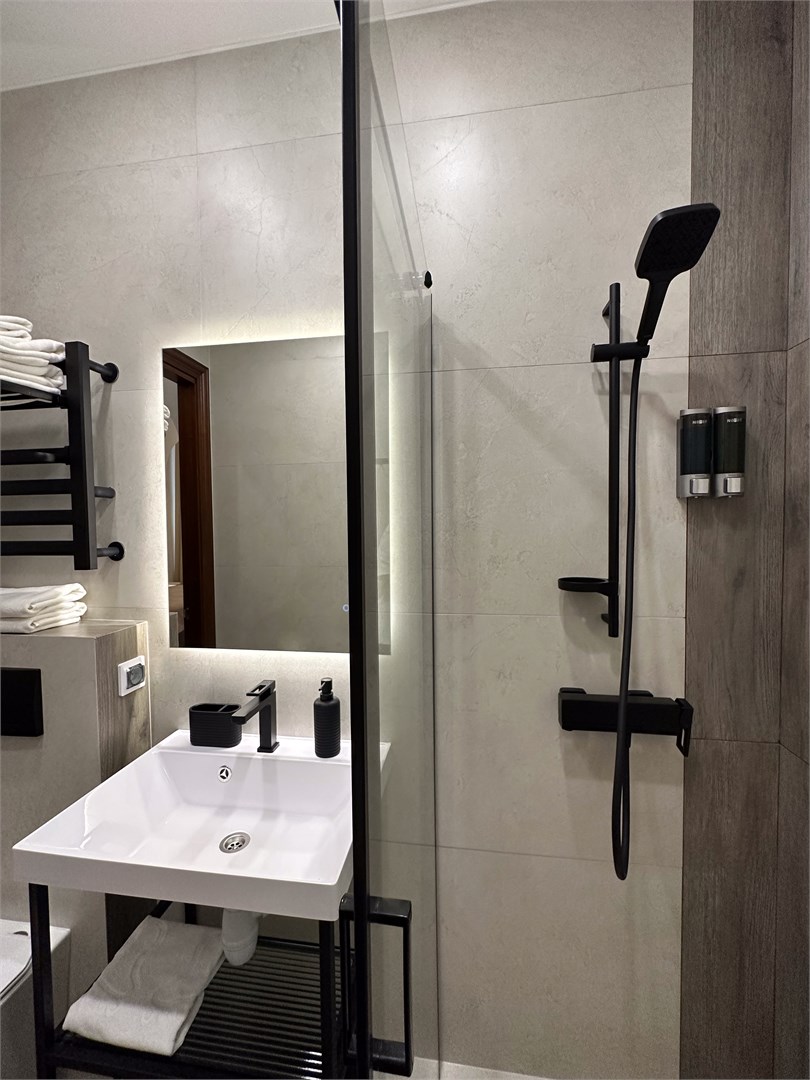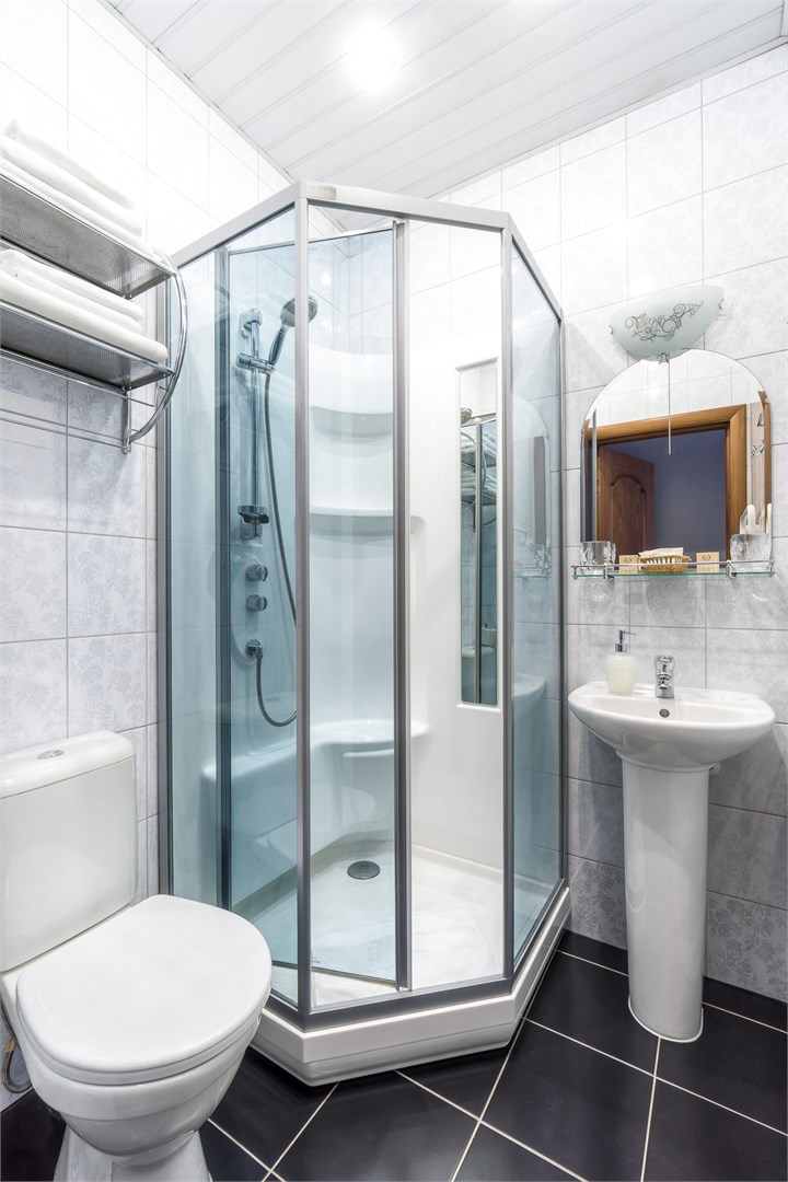 с душевой кабиной: ; туалетные принадлежности: ; фен: ;