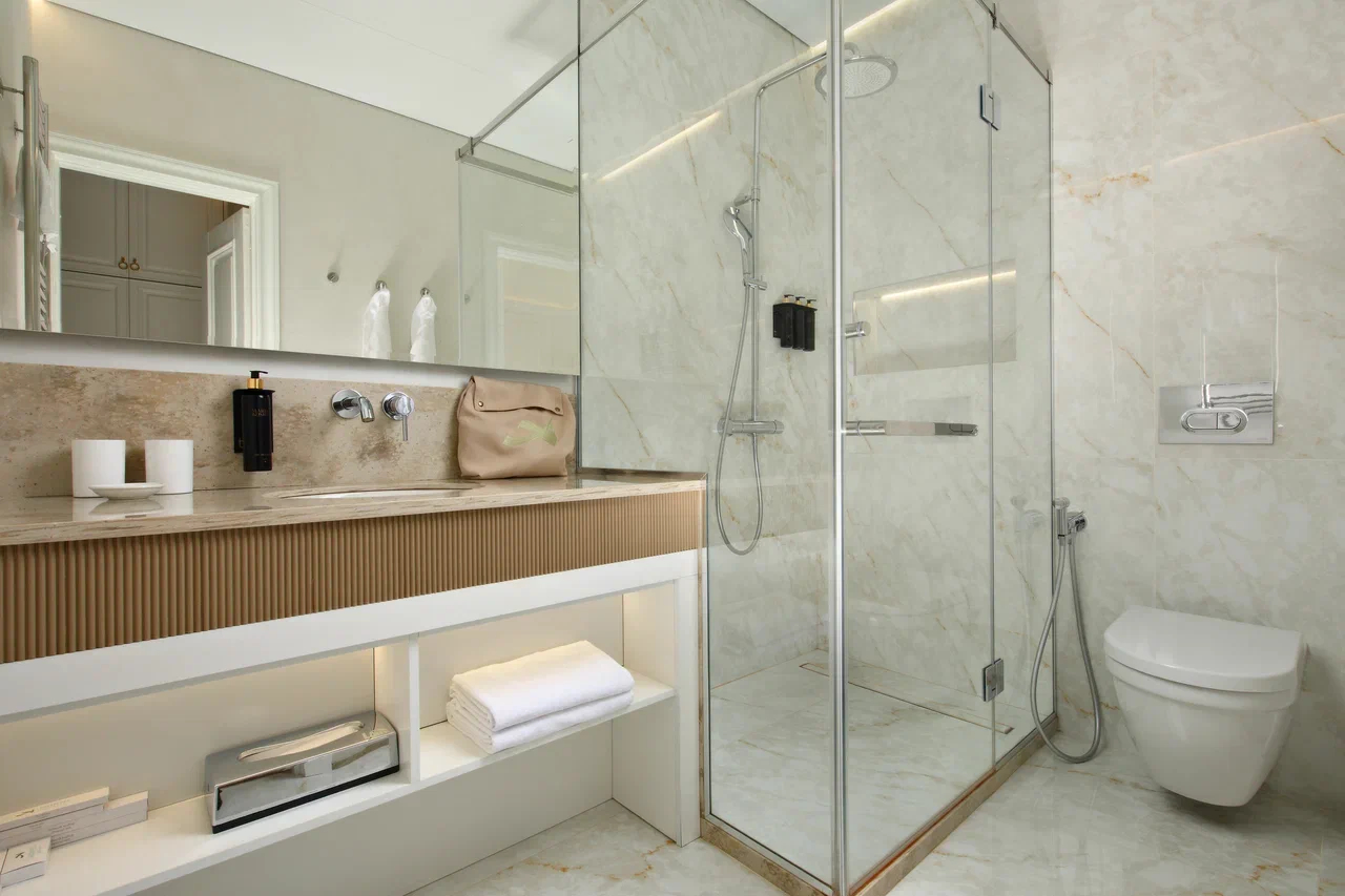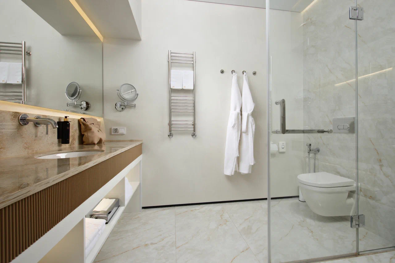 с душем: ; туалетные принадлежности: ; фен: ; халат: ;
