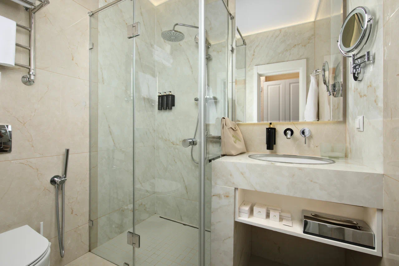 с душем: ; тапочки: ; туалетные принадлежности: ; фен: ; халат: ;