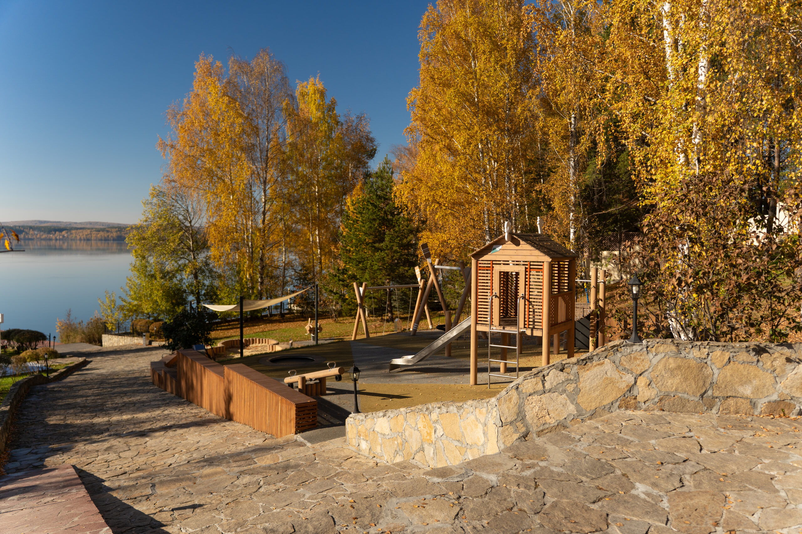 Для юных гостей в загородном отеле работает детская комната, на улице организована игровая площадка, а зимой для детей заливают ледяные горки.
