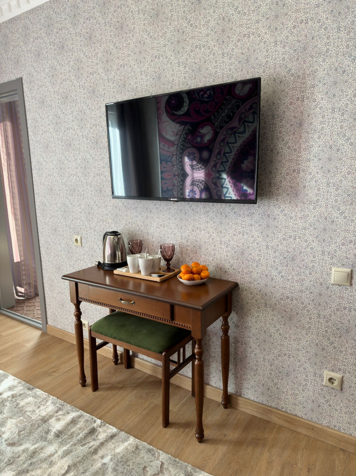 телевизор: ; чайный набор посуды: ; электрочайник: ;