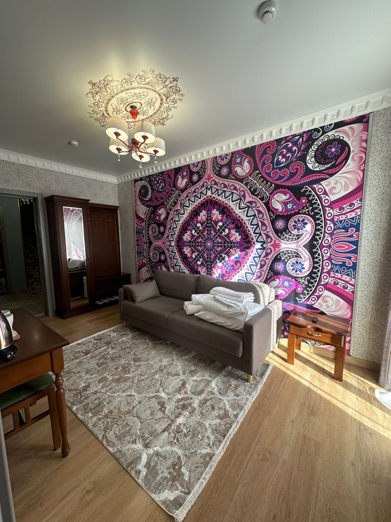 вешалка: ; зеркало: ; кровать двуспальная: ; прикроватные тумбочки: ; стол: ; стулья: ; шкаф: ;