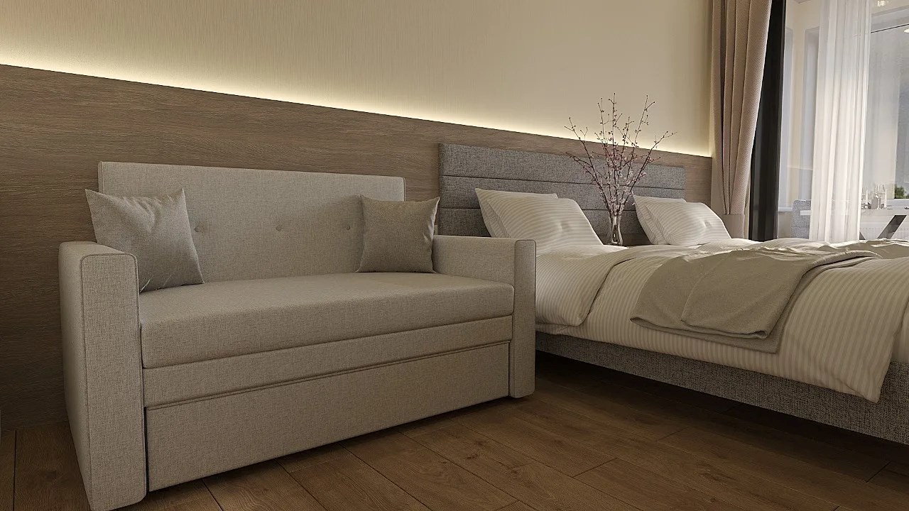 вешалка: ; диван: ; зеркало: ; кровати односпальные: ; кровать двуспальная: ; прикроватные тумбочки: ; стол: ; стулья: ; шкаф: ;