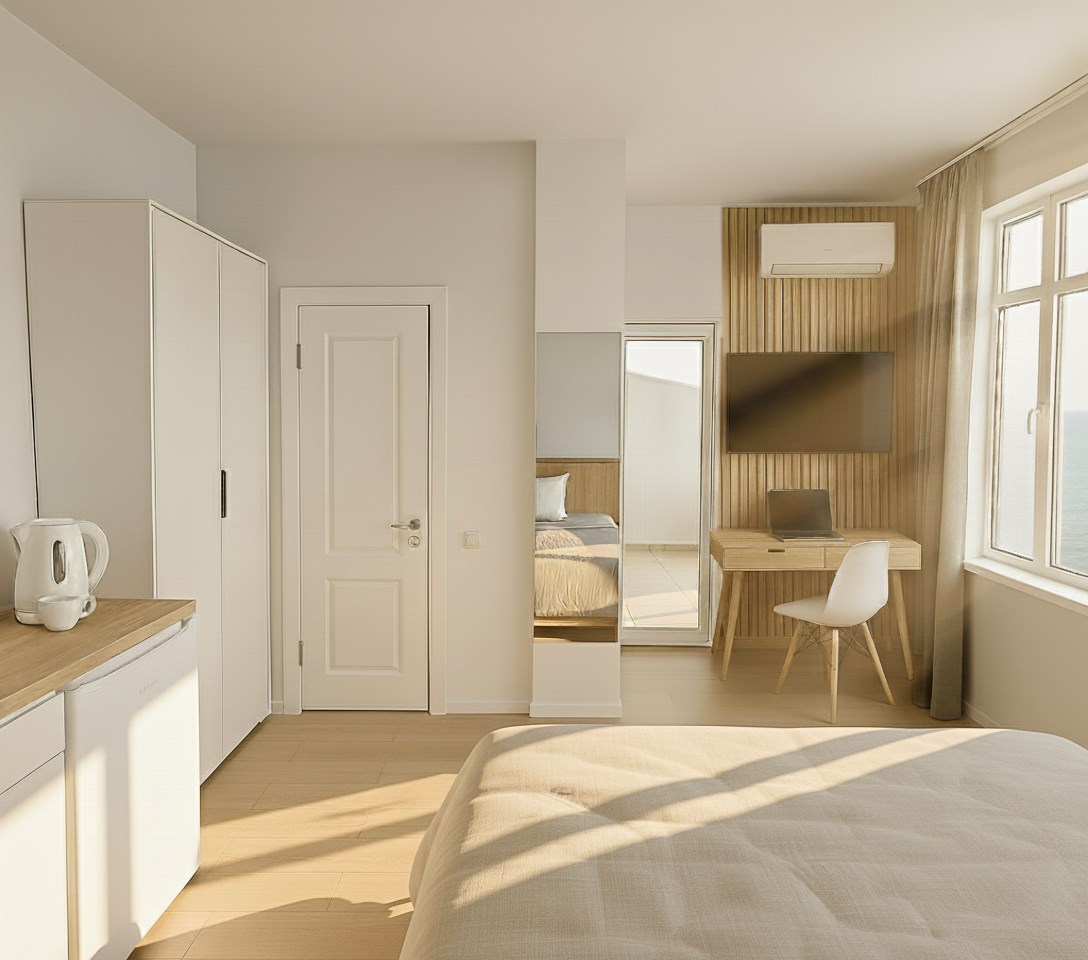 кондиционер: ; мини-холодильник: ; телевизор: ; чайный набор посуды: ; электрочайник: ;