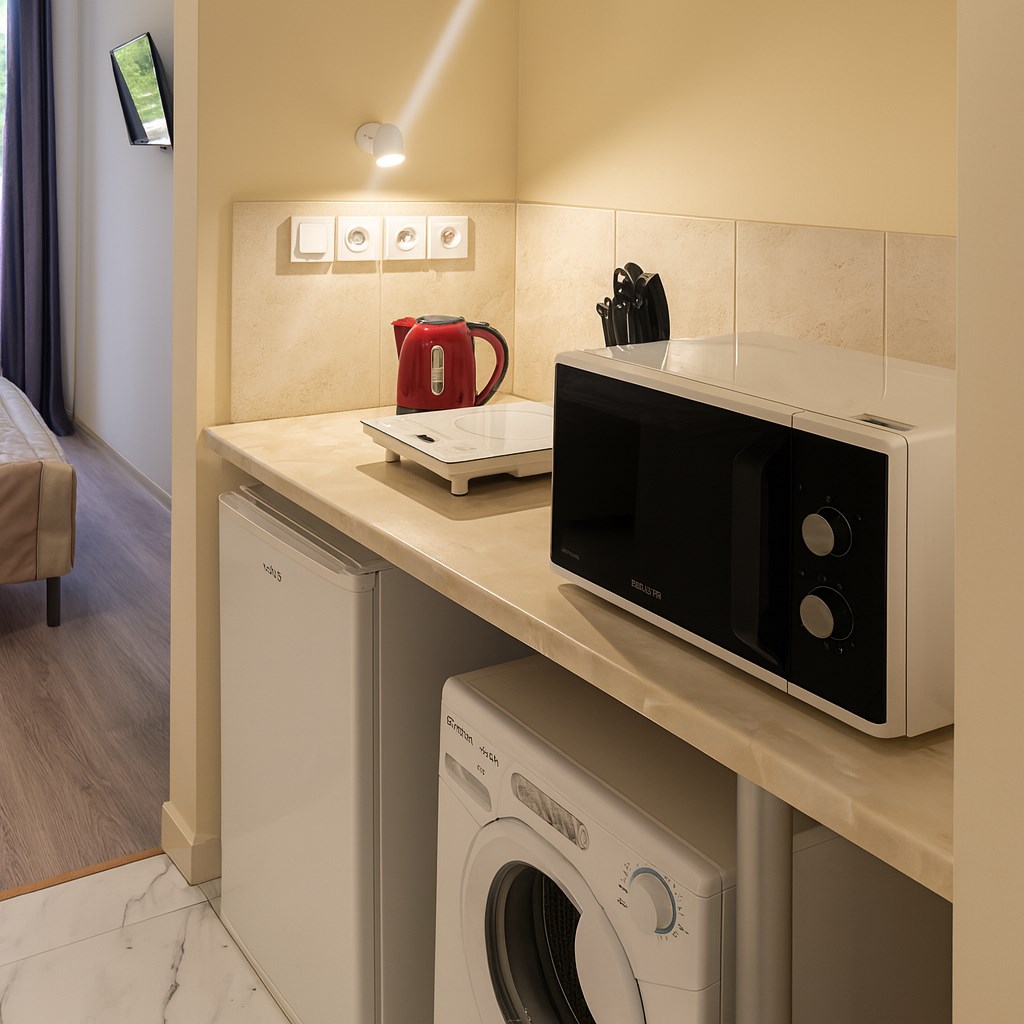 кондиционер: ; микроволновая печь: ; набор посуды: ; плита электрическая: ; телевизор: ; холодильник: ; чайный набор посуды: ; электрочайник: ;