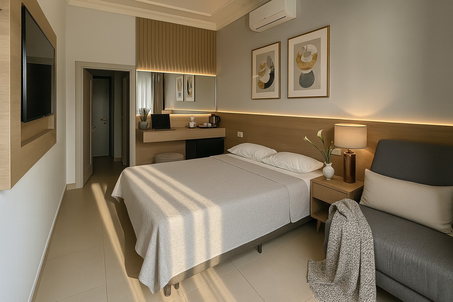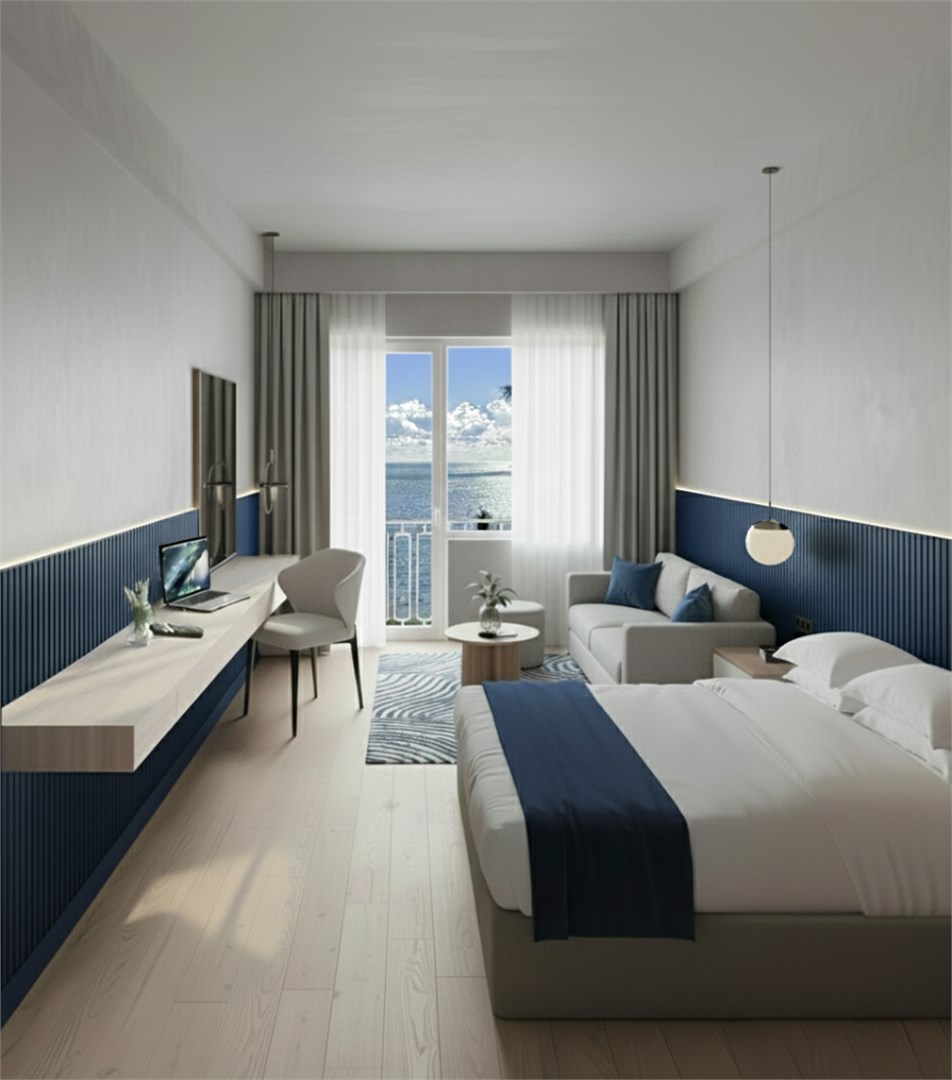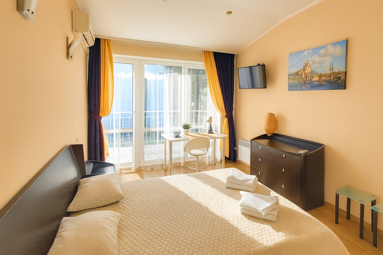 Отель, включающий в себя два 5-6-этажных корпуса, разместился на небольшой парковой территории. Жилой фонд, рассчитанный на 130 человек, предлагает номера разных категорий, есть как небольшие бюджетные варианты, так и просторные двухкомнатные номера. Везде предусмотрена ванная комната, установлен кондиционер и плазменный телевизор. В ряде комнат встречаются балконы и панорамные окна.
