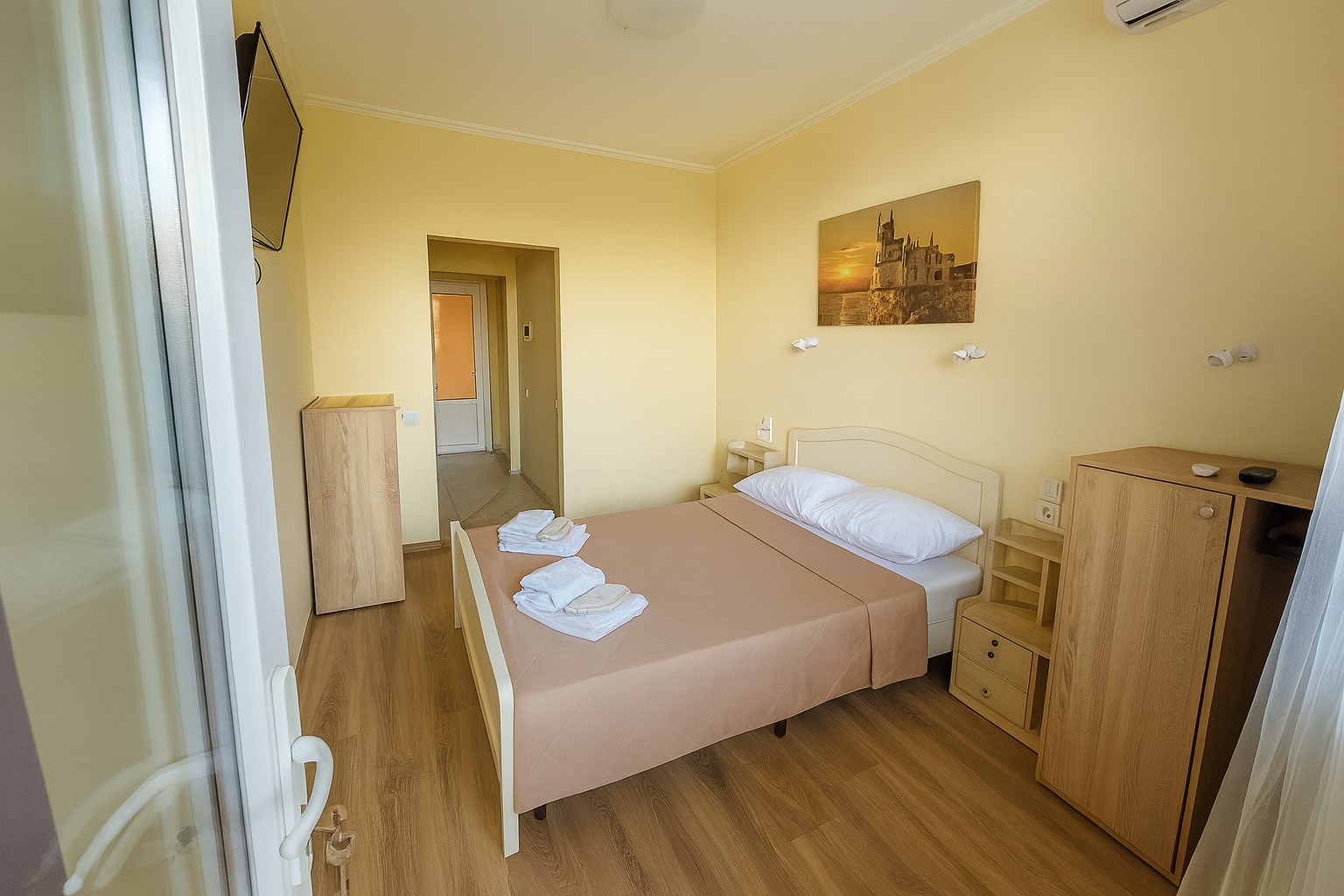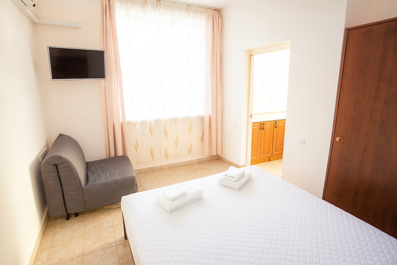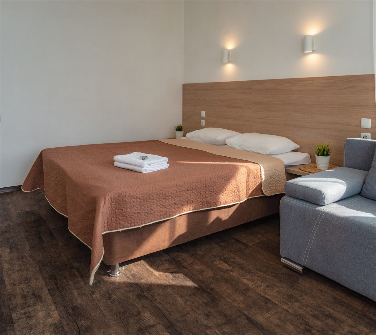- Стандарт. 4-местный 2-комнатный с мини-кухней корпус Крит. Площадь: 71. Осн. мест: 4. Доп. мест: 1. Всего таких номеров: 4.