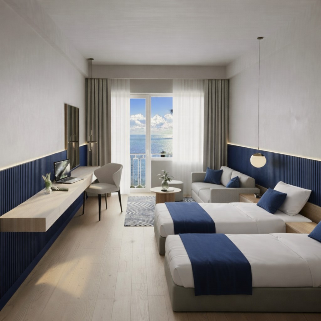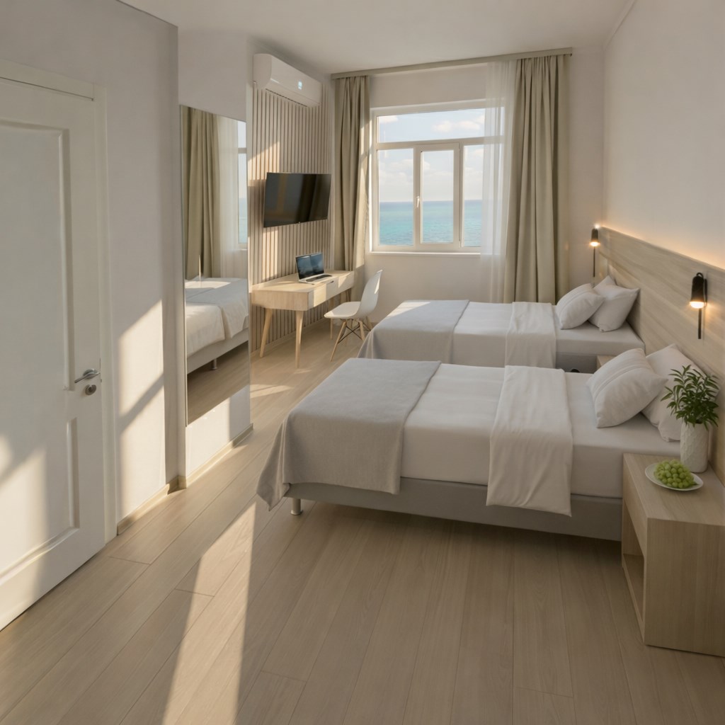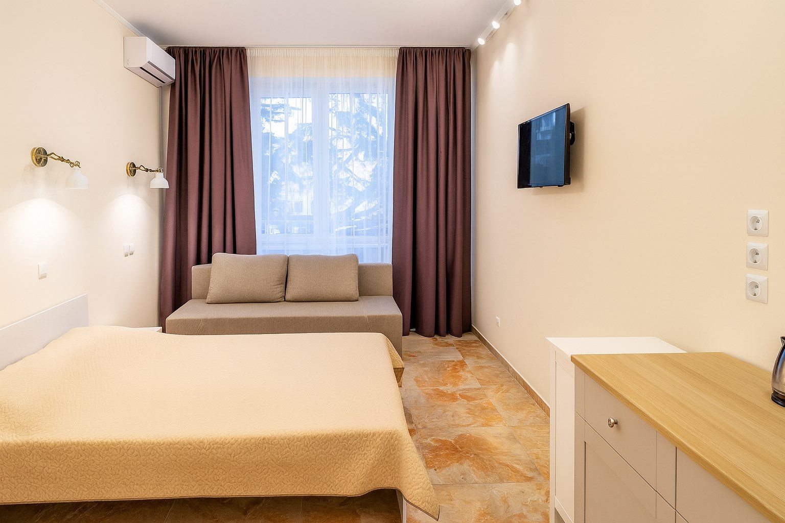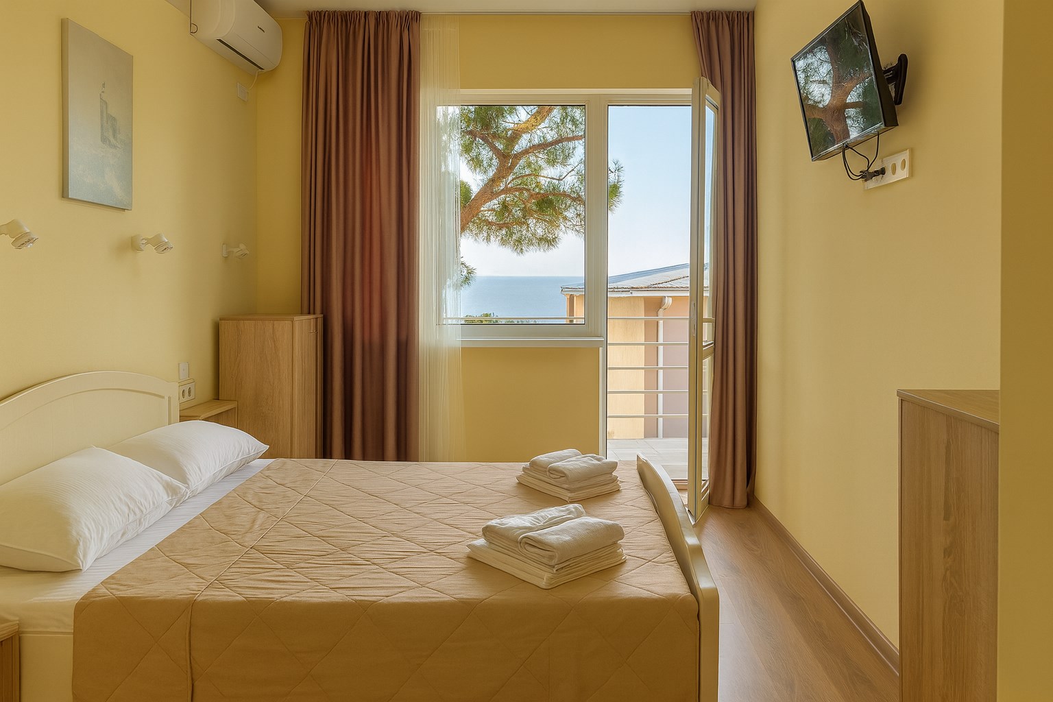 - Стандарт. 4-местный 2-комнатный с мини-кухней корпус Крит. Площадь: 71. Осн. мест: 4. Доп. мест: 1. Всего таких номеров: 4.