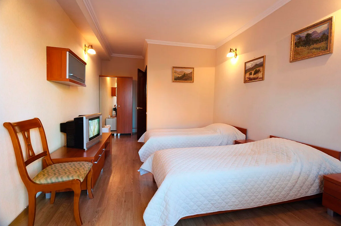- Полулюкс. 2-местный 1-комнатный. Площадь: 25. Осн. мест: 2. Доп. мест: 2. Всего таких номеров: 6.