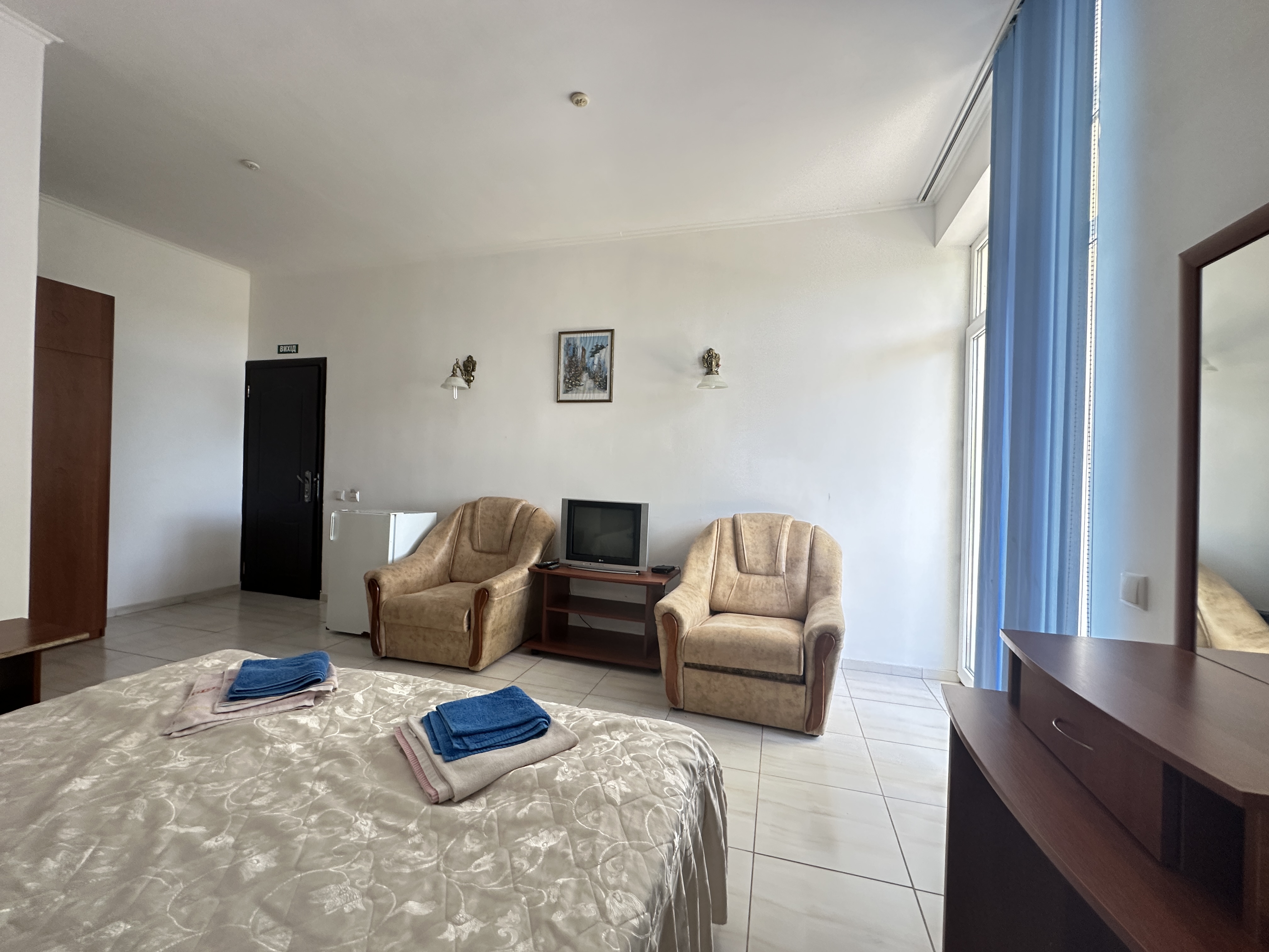 В отеле представлены номера различных категорий, включая Люкс, Улучшенный, Стандарт, Стандарт Плюс и Эконом, которые подходят как для индивидуальных туристов, так и для небольших групп. В каждом номере имеется кондиционер, холодильник, телевизор и чайник; более простые номера оснащены цокольным этажом без балкона. Ближайшие корпуса находятся в 150 м от моря, а также рядом с комплексом находится красивый парк Учкуевка.