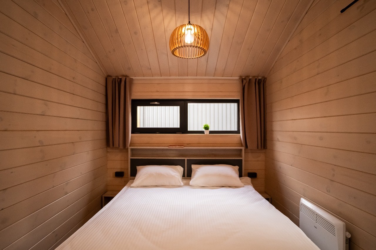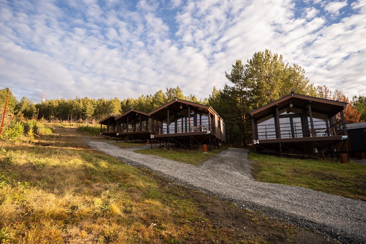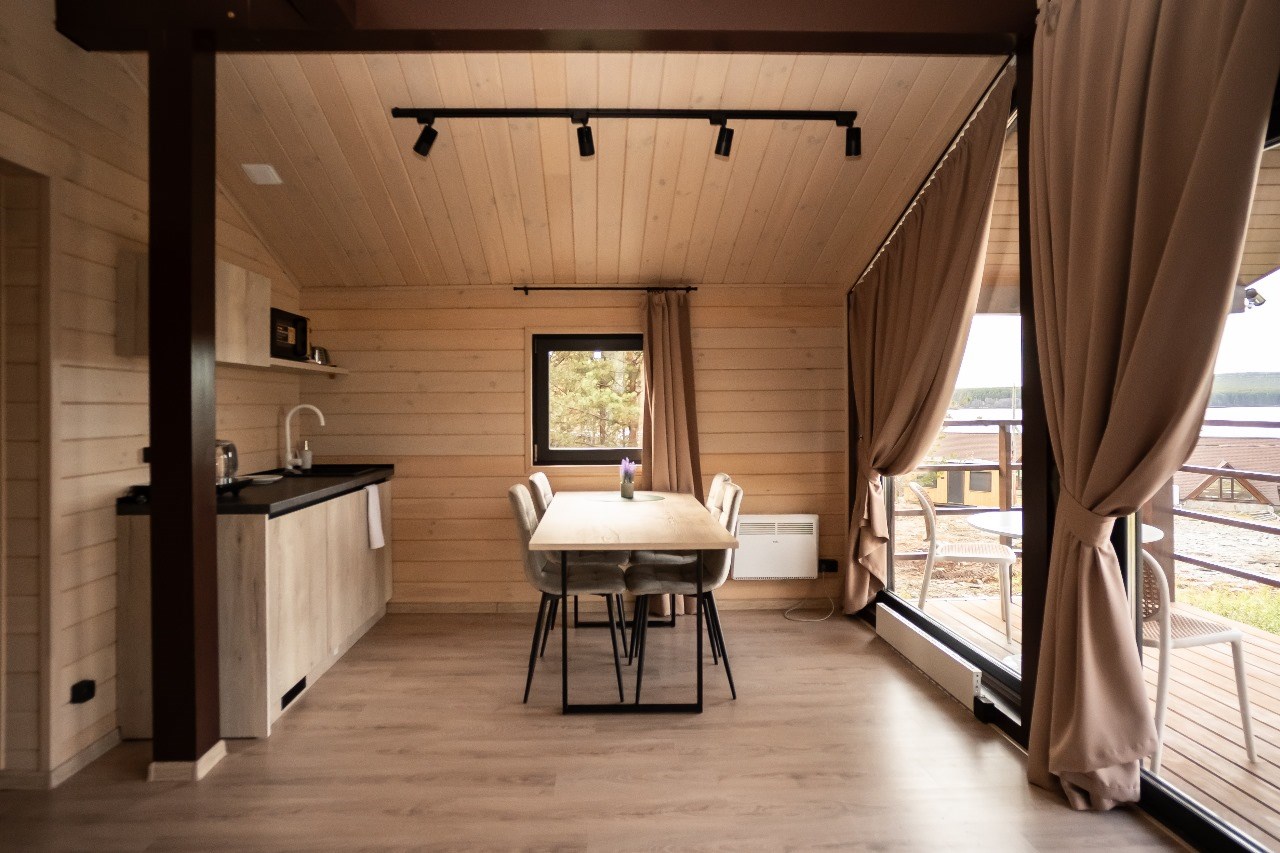 Эко-деревня включает в себя 10 домиков в скандинавском стиле, расположенных на самом берегу пруда. В каждом домике предусмотрена мини-кухня, санузел с душем, есть спальная зона и все необходимая техника – кондиционер, электроплита, холодильник, телевизор, фен, электрочайник. Перед домиками организована мангальная зона, а из окон открываются панорамные виды на озеро.