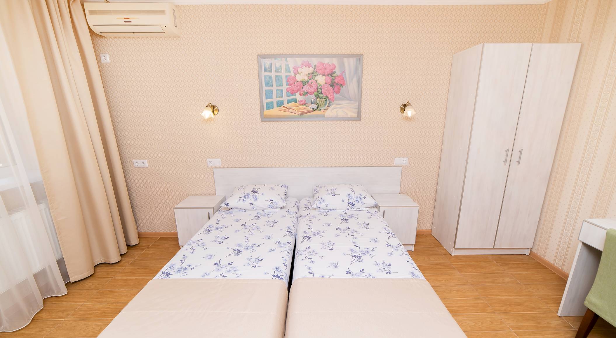 кровати односпальные: ; прикроватные тумбочки: ; стол: ; стулья: ; шкаф: ;