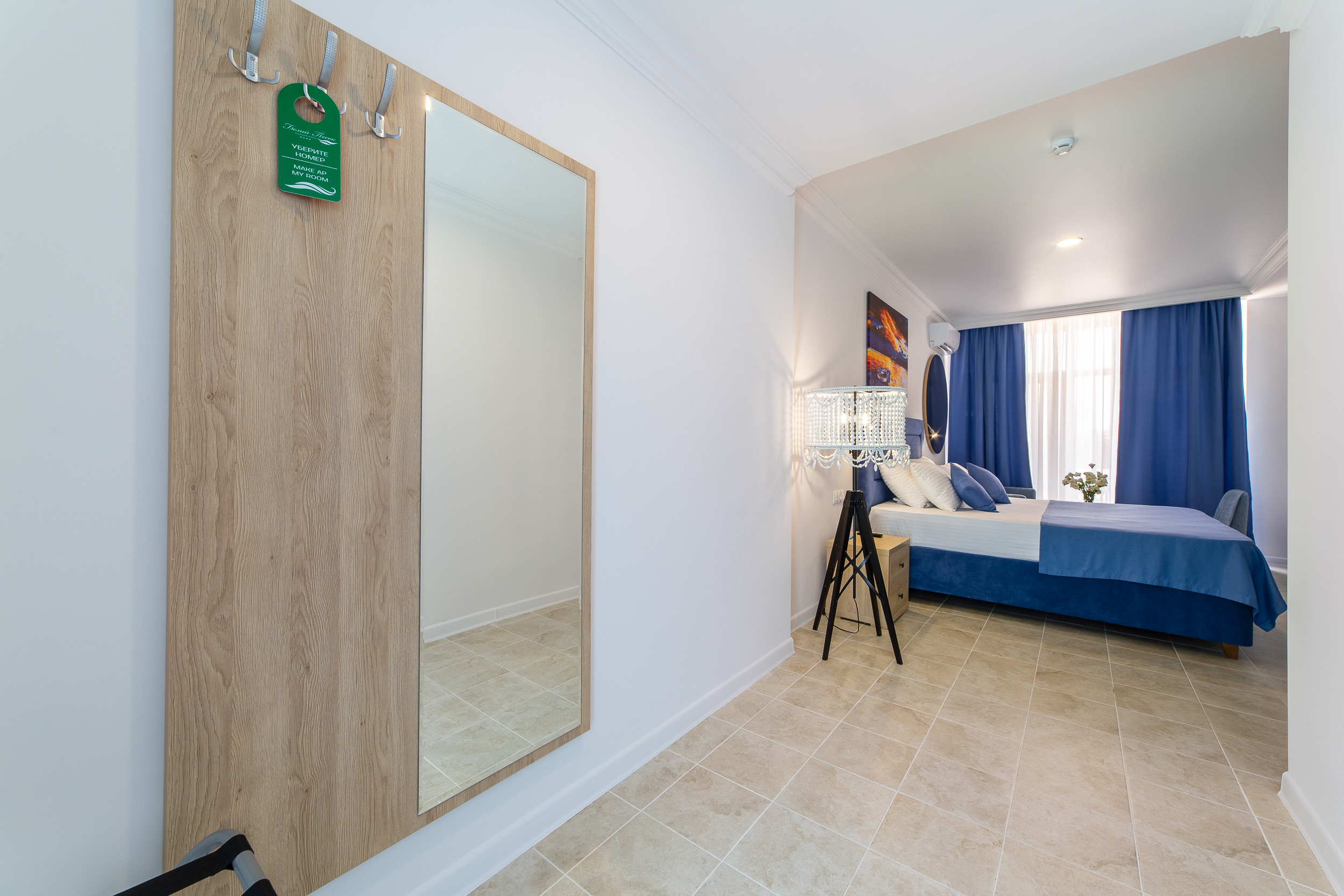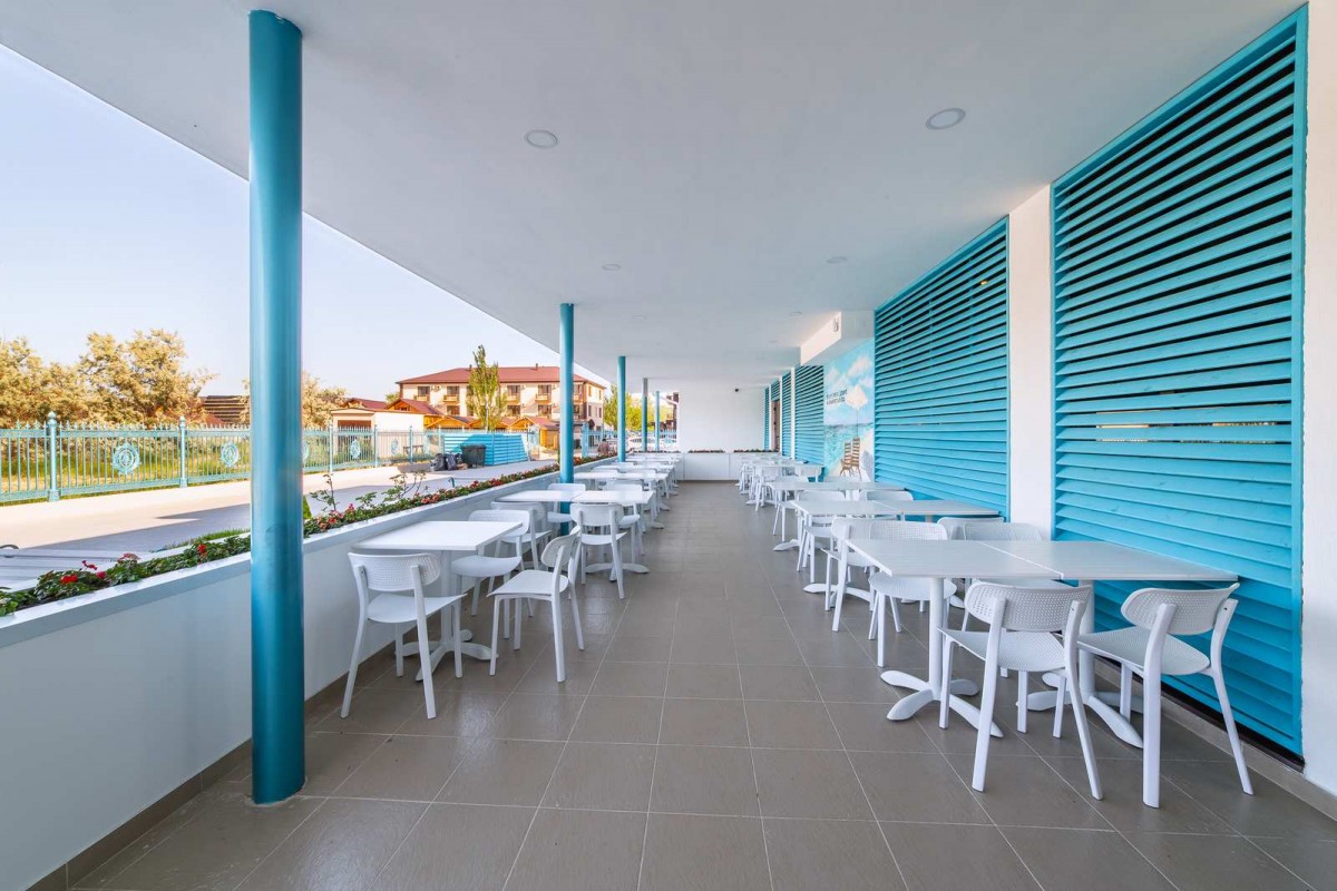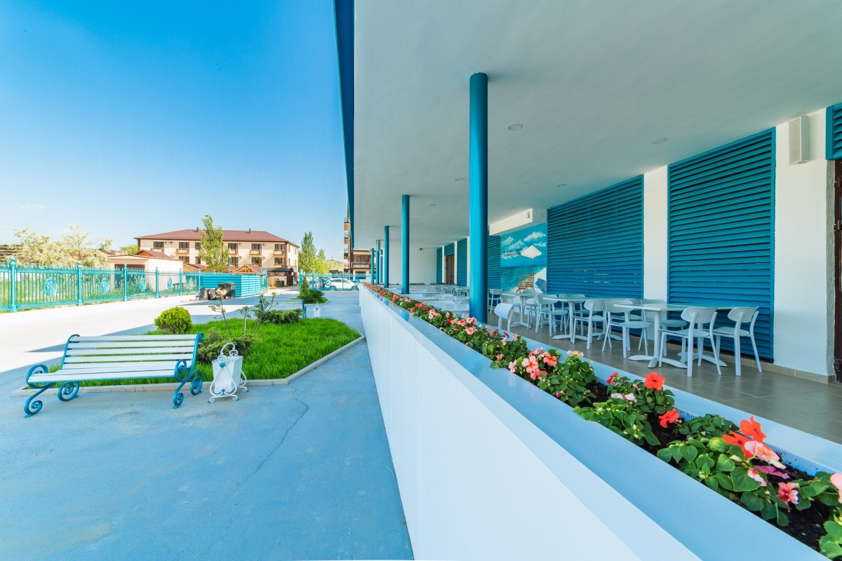 Трехэтажное здание отеля выполнено в средиземноморском стиле. На верхнем этаже – открытая зона отдыха. Отель располагает жилым фондом, рассчитанным на размещение около 120 человек. Номера отеля, несмотря на разницу категорий, обеспечены с одинаковым первоклассным качеством. В санузлах каждого из них, есть при душевой гигиенические наборы косметики, фены, халаты и тапочки. Каждый номер обеспечен высококачественным набором бытовой техники: системой кондиционирования воздуха, сейфом, холодильником и телефоном, телевизором и Wi-Fi. Оригинальное декорирование номеров в сине-белой цветовой гамме создает впечатление особой чистоты, свежести и прохлады.