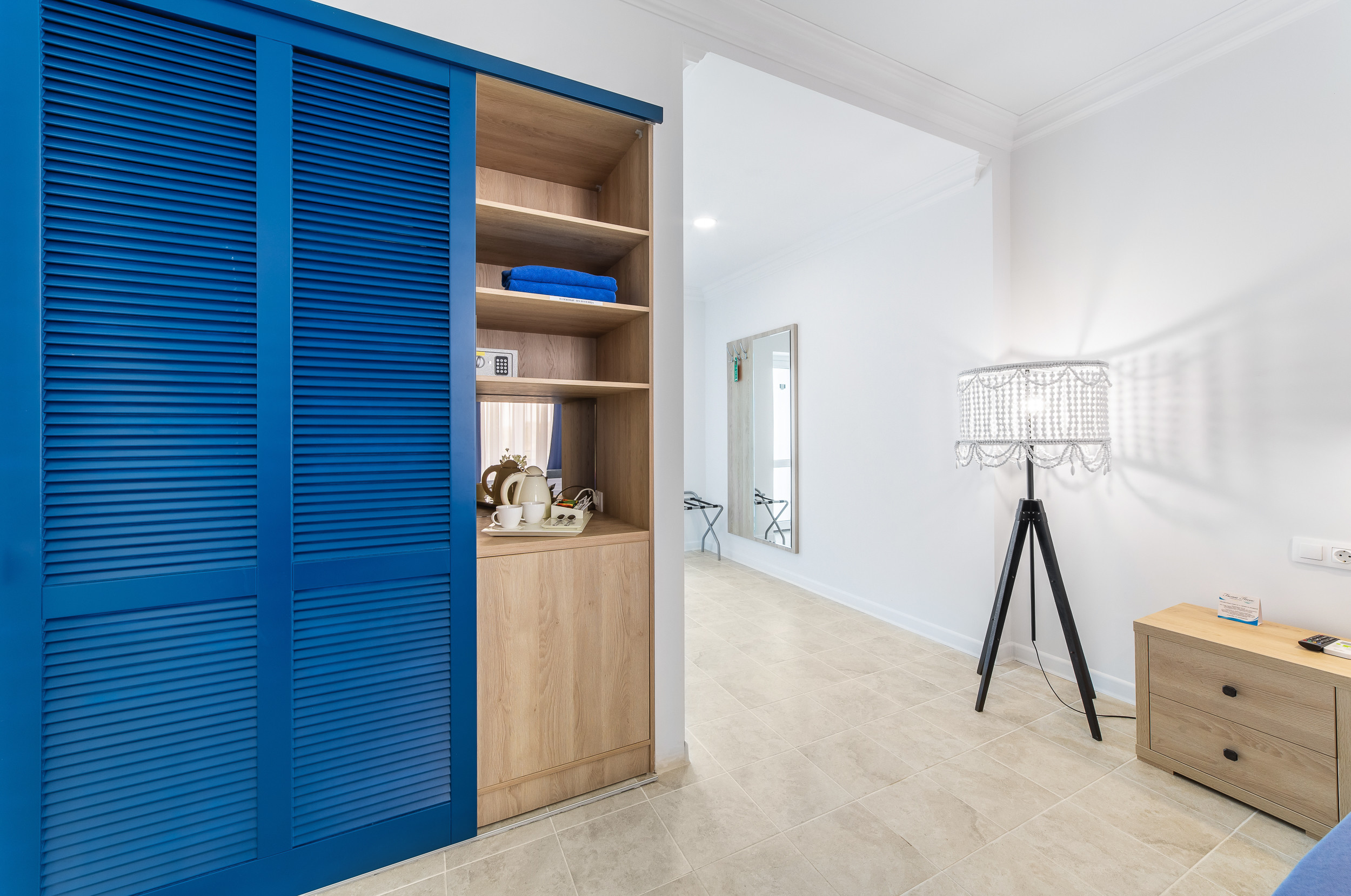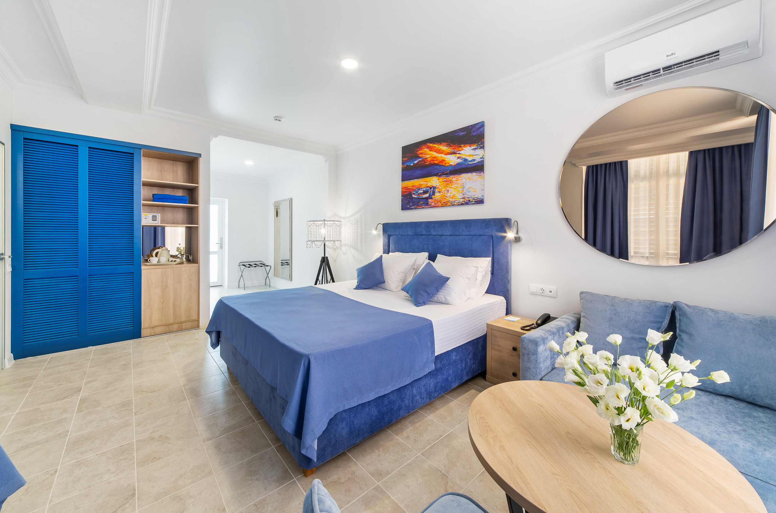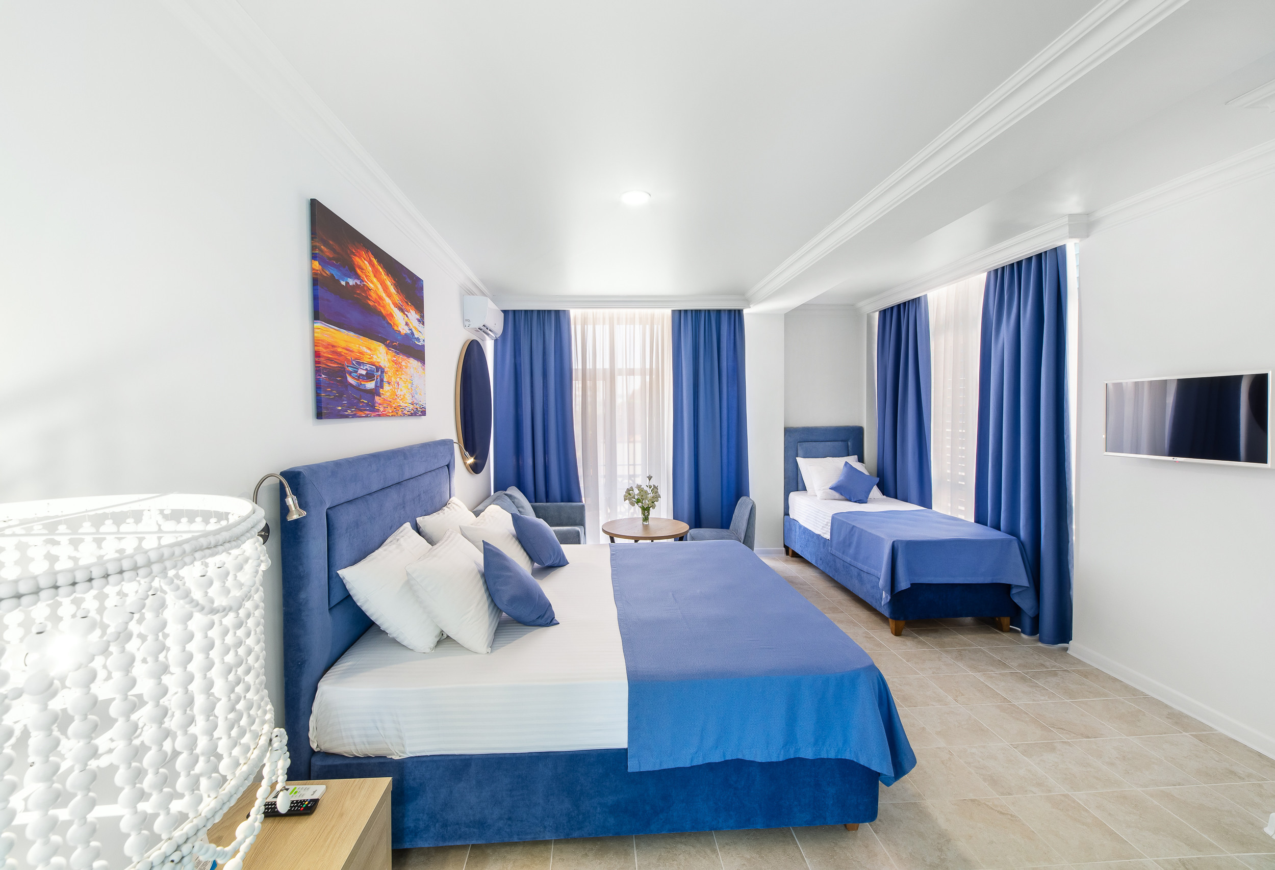 Трехэтажное здание отеля выполнено в средиземноморском стиле. На верхнем этаже – открытая зона отдыха. Отель располагает жилым фондом, рассчитанным на размещение около 120 человек. Номера отеля, несмотря на разницу категорий, обеспечены с одинаковым первоклассным качеством. В санузлах каждого из них, есть при душевой гигиенические наборы косметики, фены, халаты и тапочки. Каждый номер обеспечен высококачественным набором бытовой техники: системой кондиционирования воздуха, сейфом, холодильником и телефоном, телевизором и Wi-Fi. Оригинальное декорирование номеров в сине-белой цветовой гамме создает впечатление особой чистоты, свежести и прохлады.