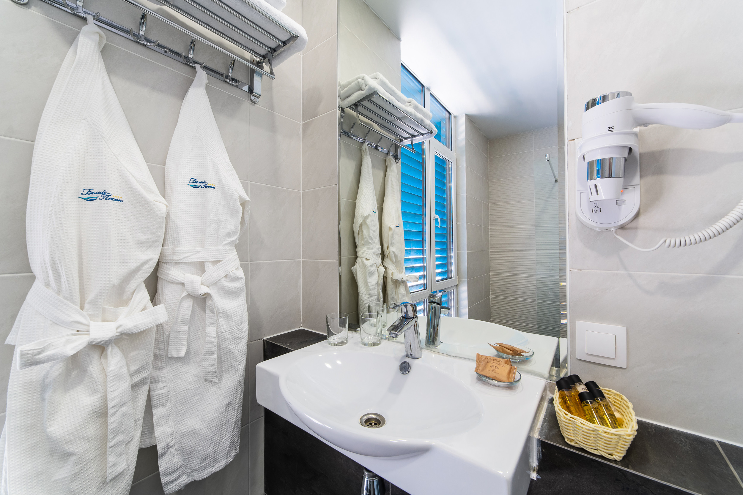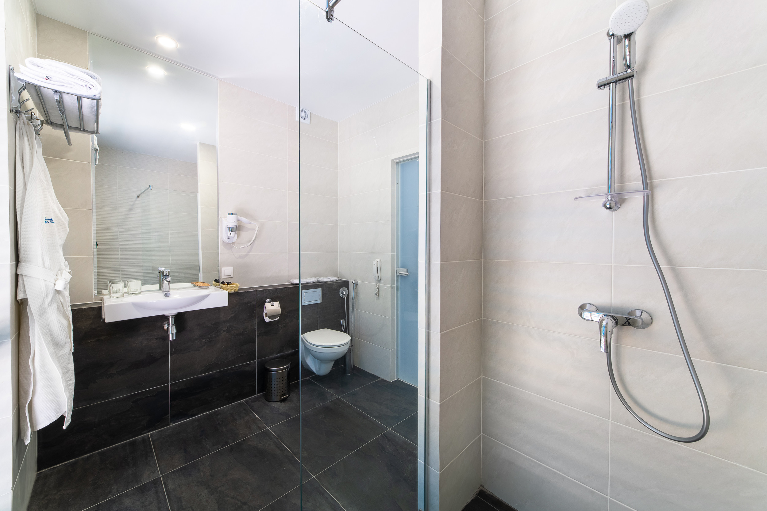 с душем: ; туалетные принадлежности: ; фен: ; халат: ;
