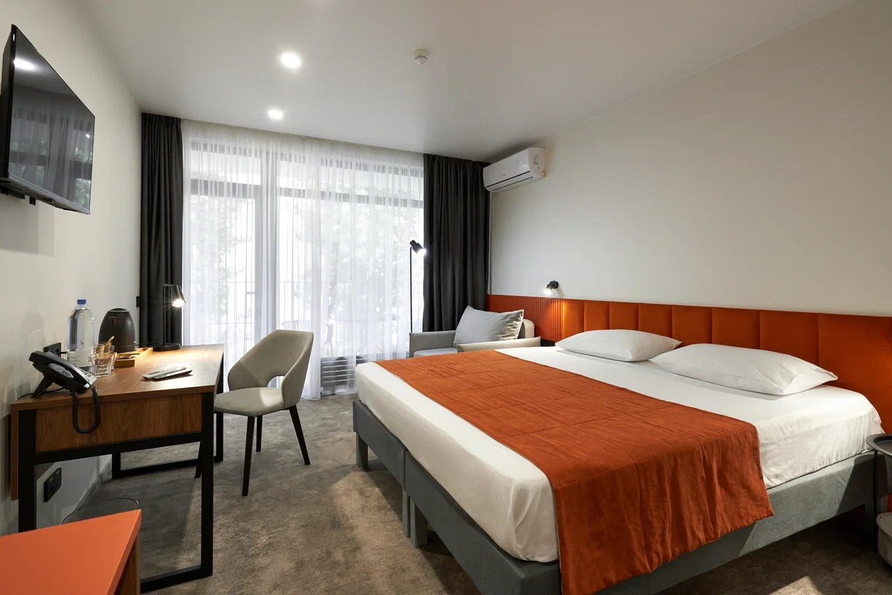 Жилой фонд отеля, способный одновременно вместить 350 человек, образован тремя 4-этажными корпусами. Номера в них имеют разные категории, разное количество комнат и мест. Каждый из этих номеров обеспечен автономным санузлом с ванной или душем и набором необходимой бытовой техники: телевизором, холодильником и сплит- системой. Wi-Fi доступен в лобби и на территории.