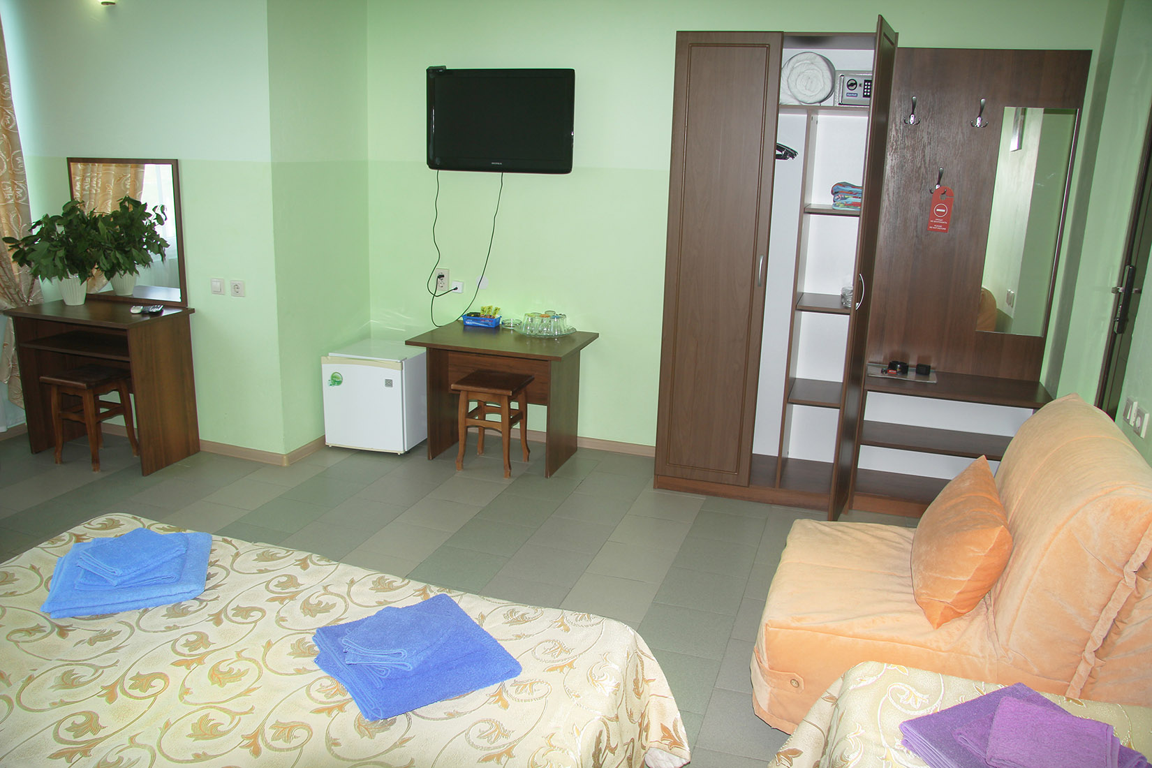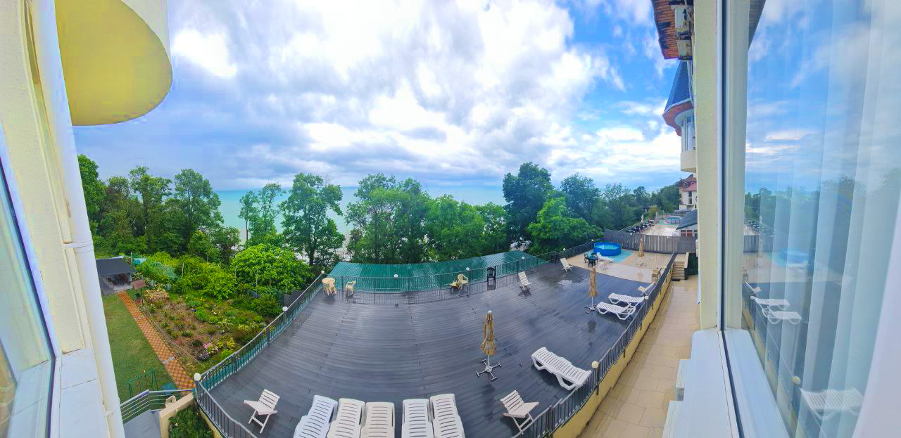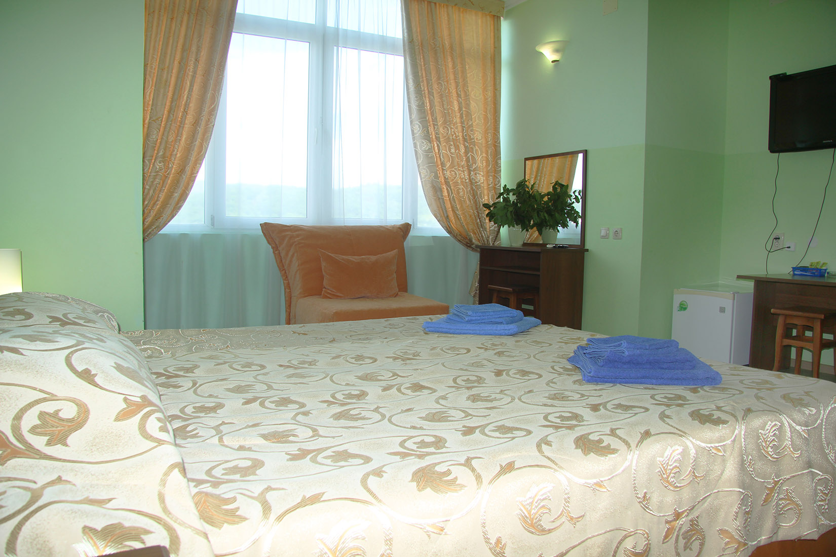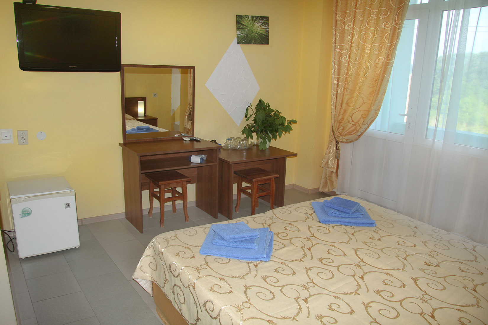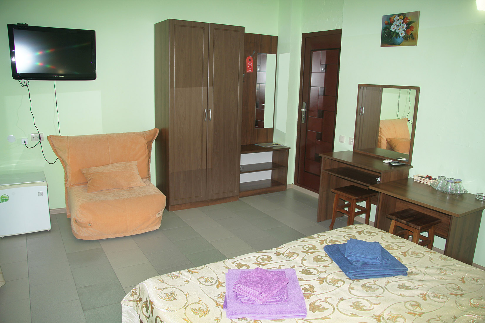 Номера с ванными комнатами оснащены душем. Из обустройства – мебель и спутниковое телевидение, холодильник и сплит-кондиционирование. В каждом номере можно организовать дополнительное место. Всего в пансионате 69 номеров.